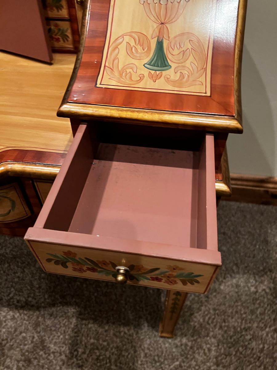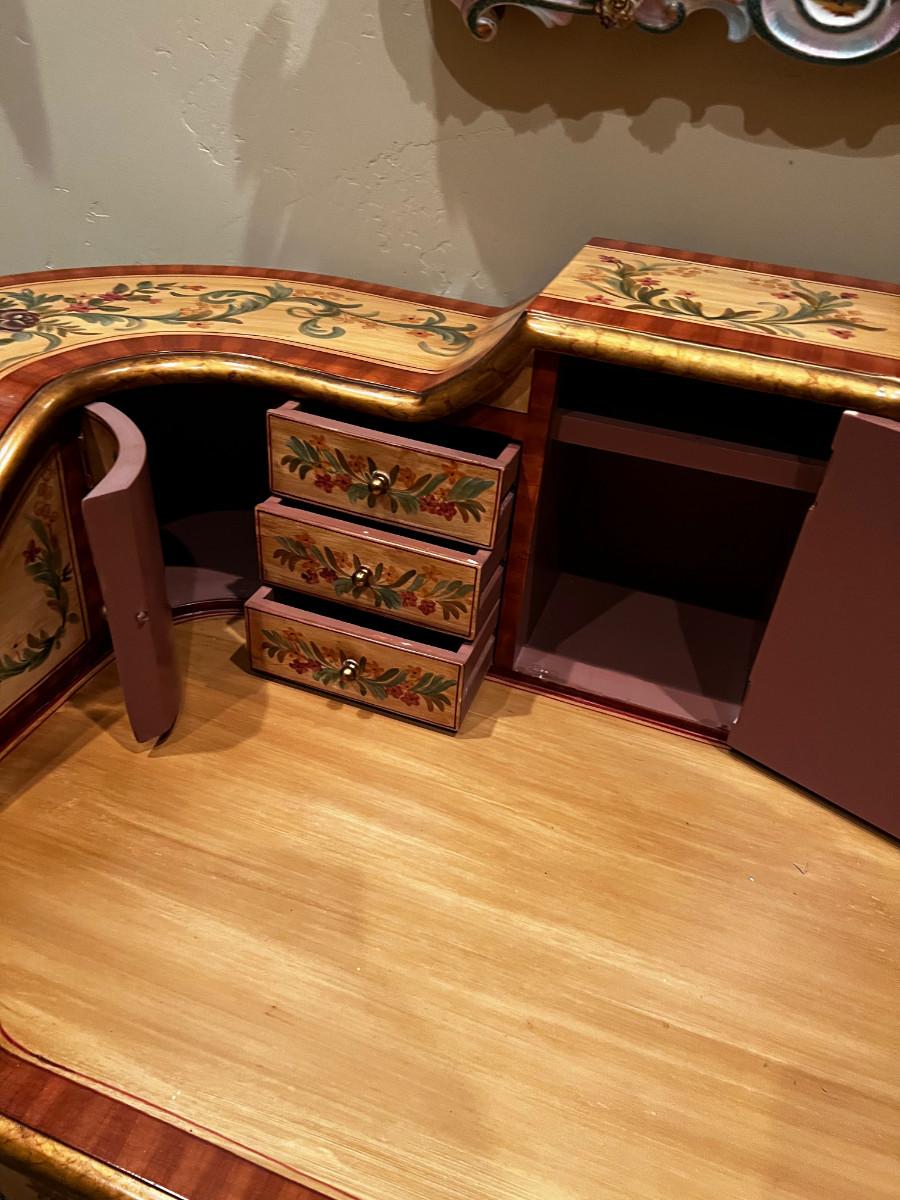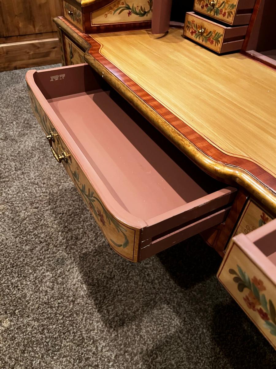 Antique reproduction 50" wide, 25" deep writing surface 30", total height 40". Good overall condition some wear and nicks from use. Most likely 20-30 years old.