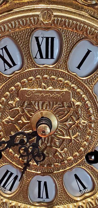 Ornate brass mantel clock embossed "Imperial" on dial, movement is marked FHS 130-070: indicating Kienzel clock Mfg., Germany in 1970. It has a balance wheel escapement with two bells. Roman numerals on porcelain dial, animal paw and turned feet, floral, shell, leaf and scroll design, grotesque and lion mask details. Pair of five arm six light candelabra, baluster stem with "S"-scroll handles with leaf, scroll, grape and acorn design; removable finials. Foil label "Made in Italy" underneath.