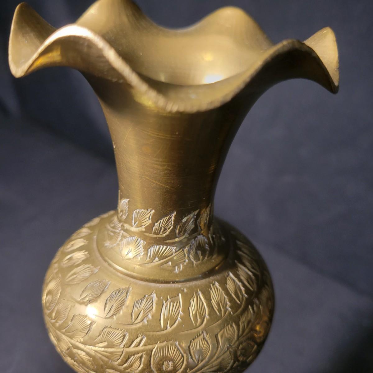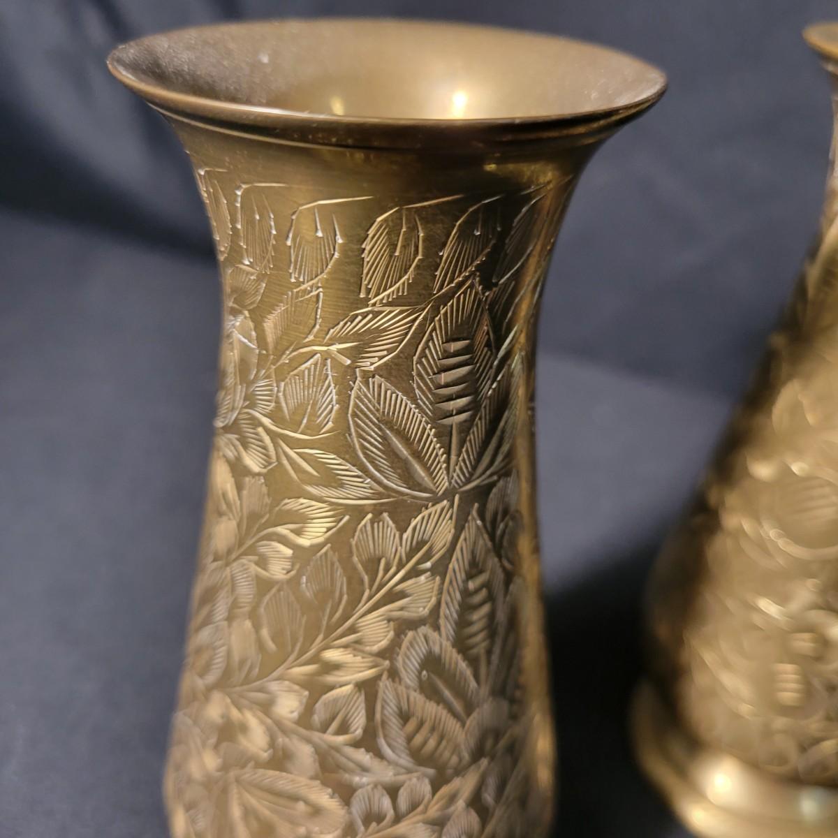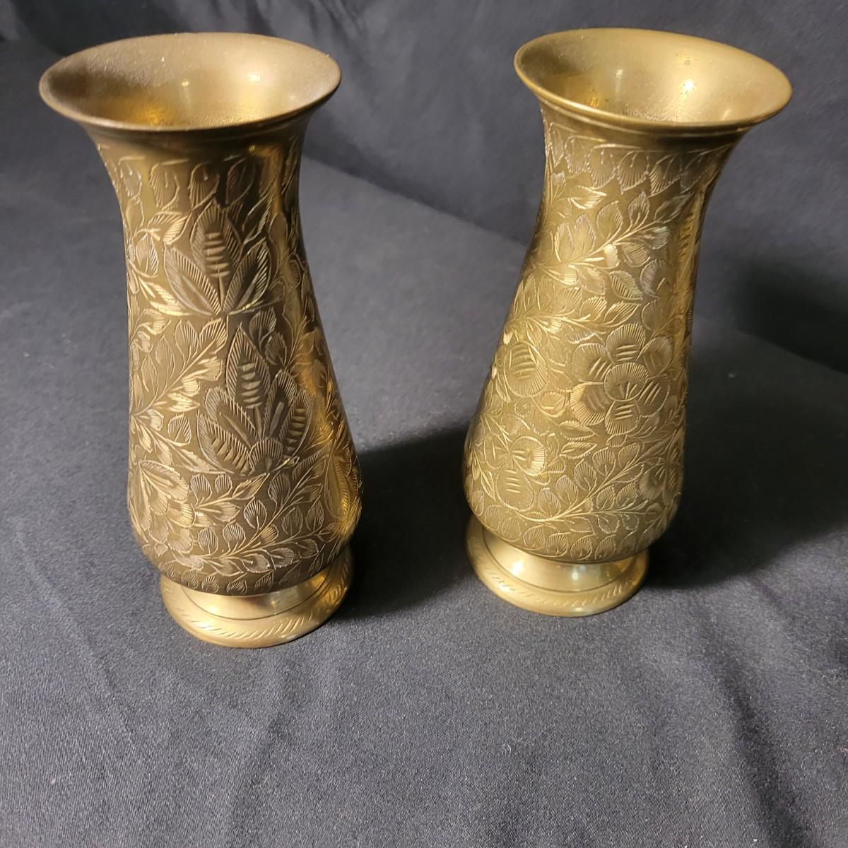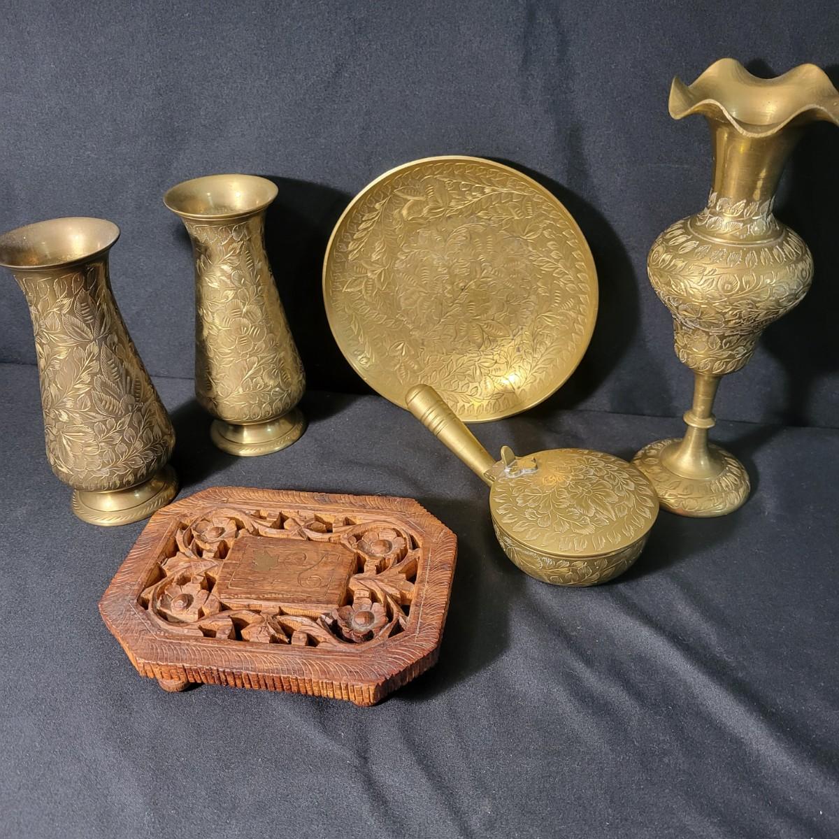 A collection of five matching brass pieces and a wooden trivet made in India that are in good condition with no notable damage. Included is three vases, a 6.5" plate, a decorative lidded bowl with a handle and a carved wooden trivet. Largest vase measures approximately 3" x 8.5" Shipping available