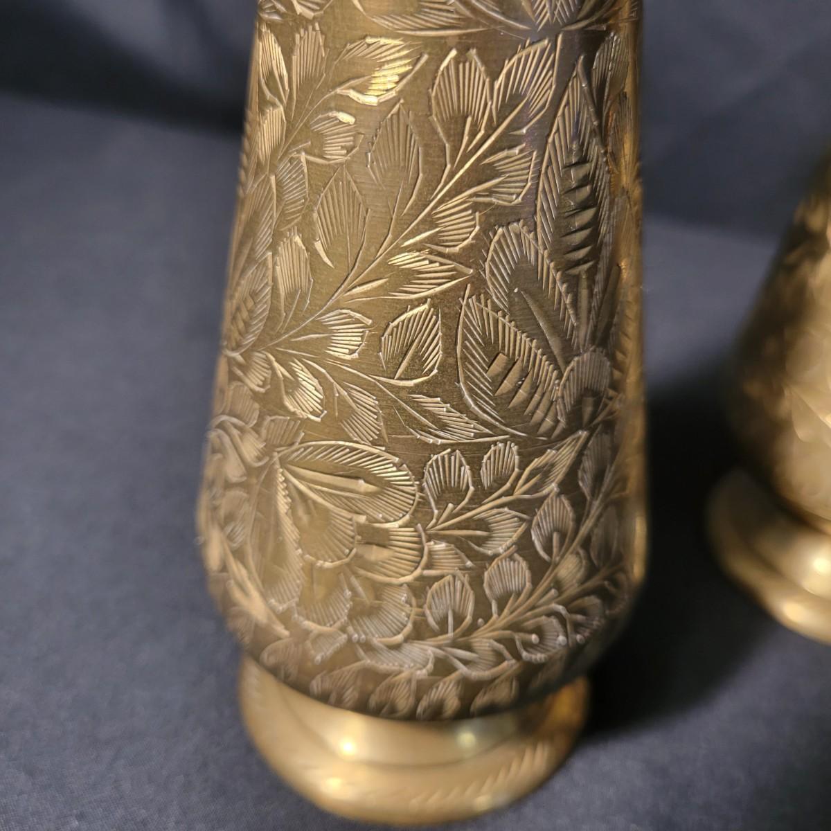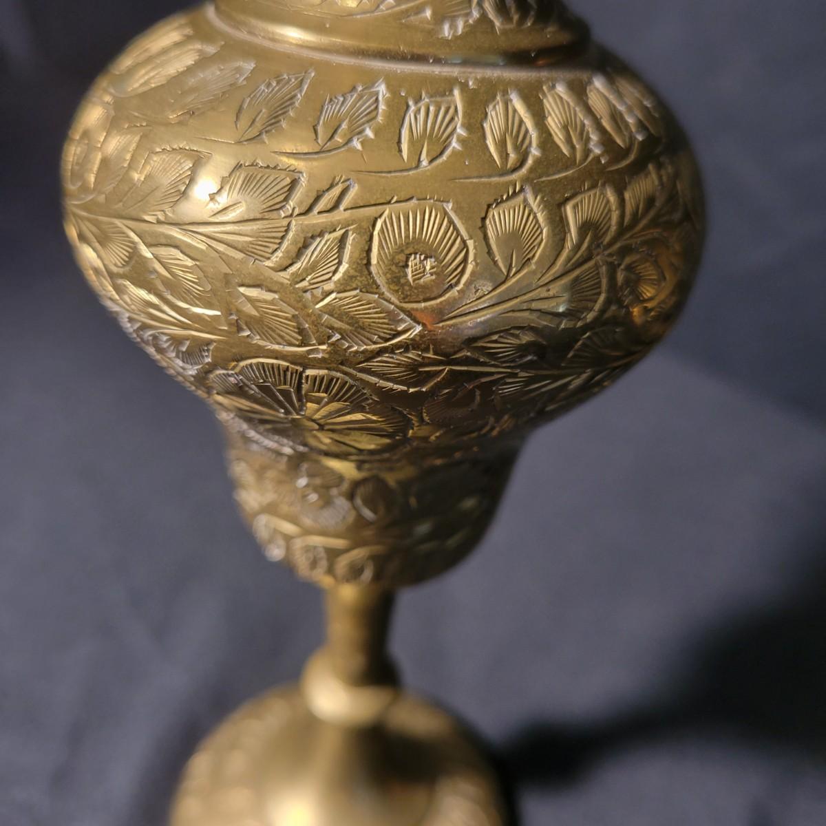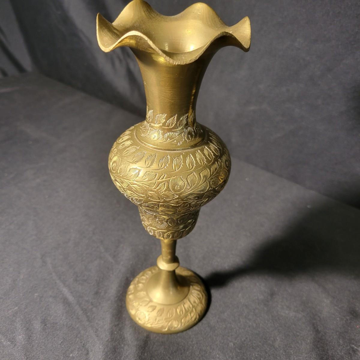 A collection of five matching brass pieces and a wooden trivet made in India that are in good condition with no notable damage. Included is three vases, a 6.5" plate, a decorative lidded bowl with a handle and a carved wooden trivet. Largest vase measures approximately 3" x 8.5" Shipping available