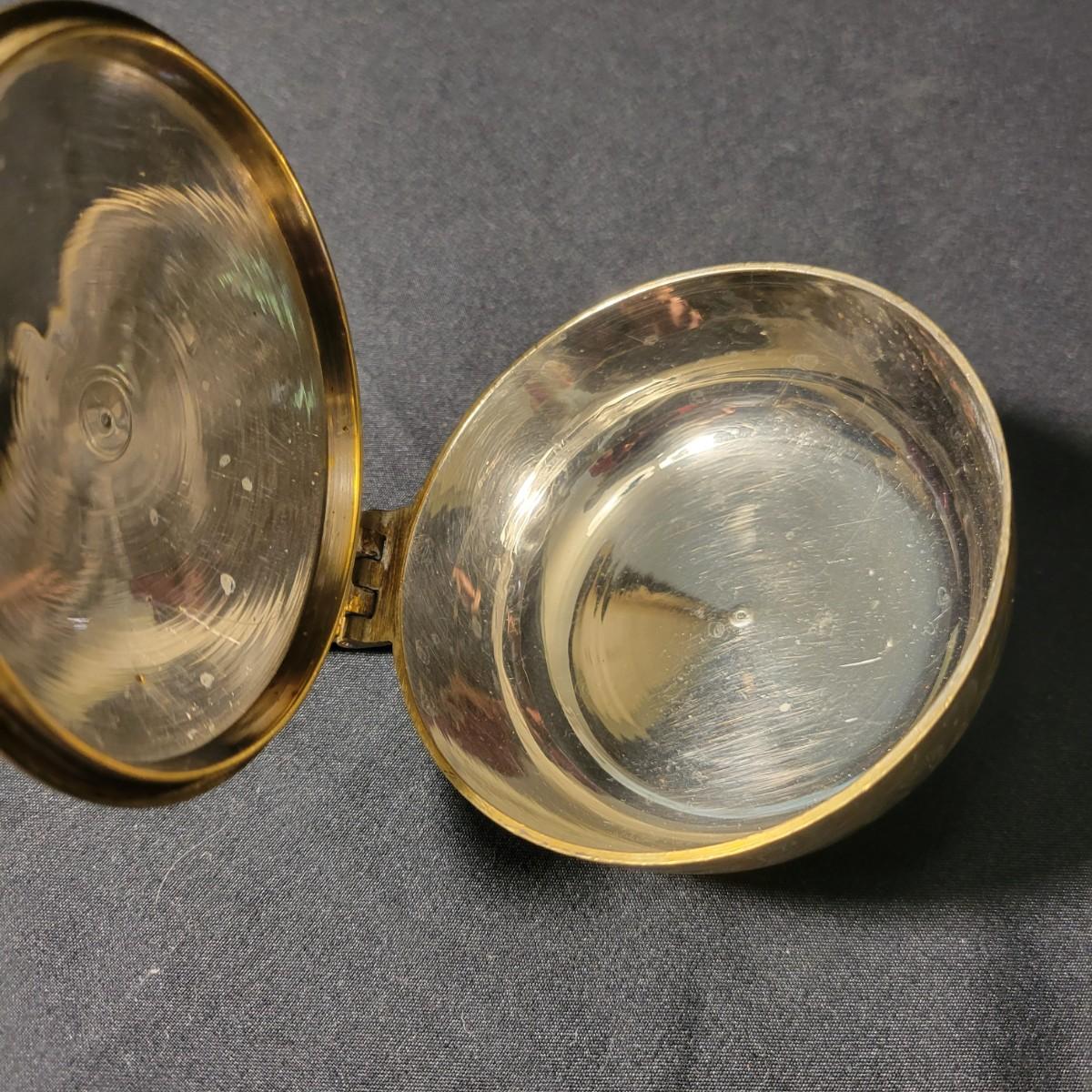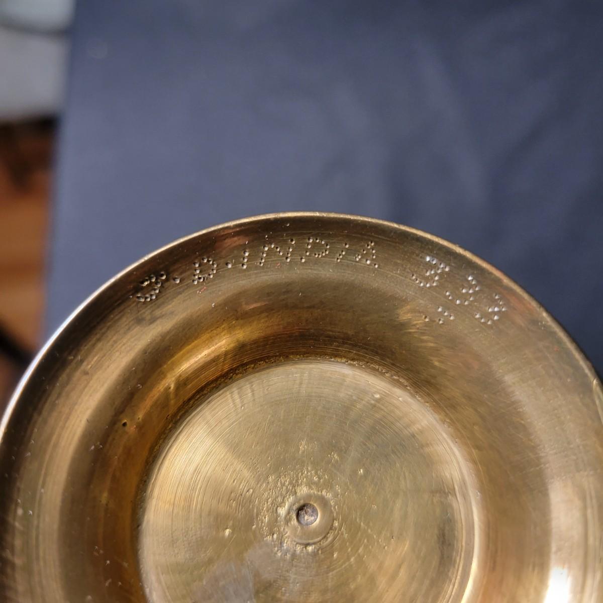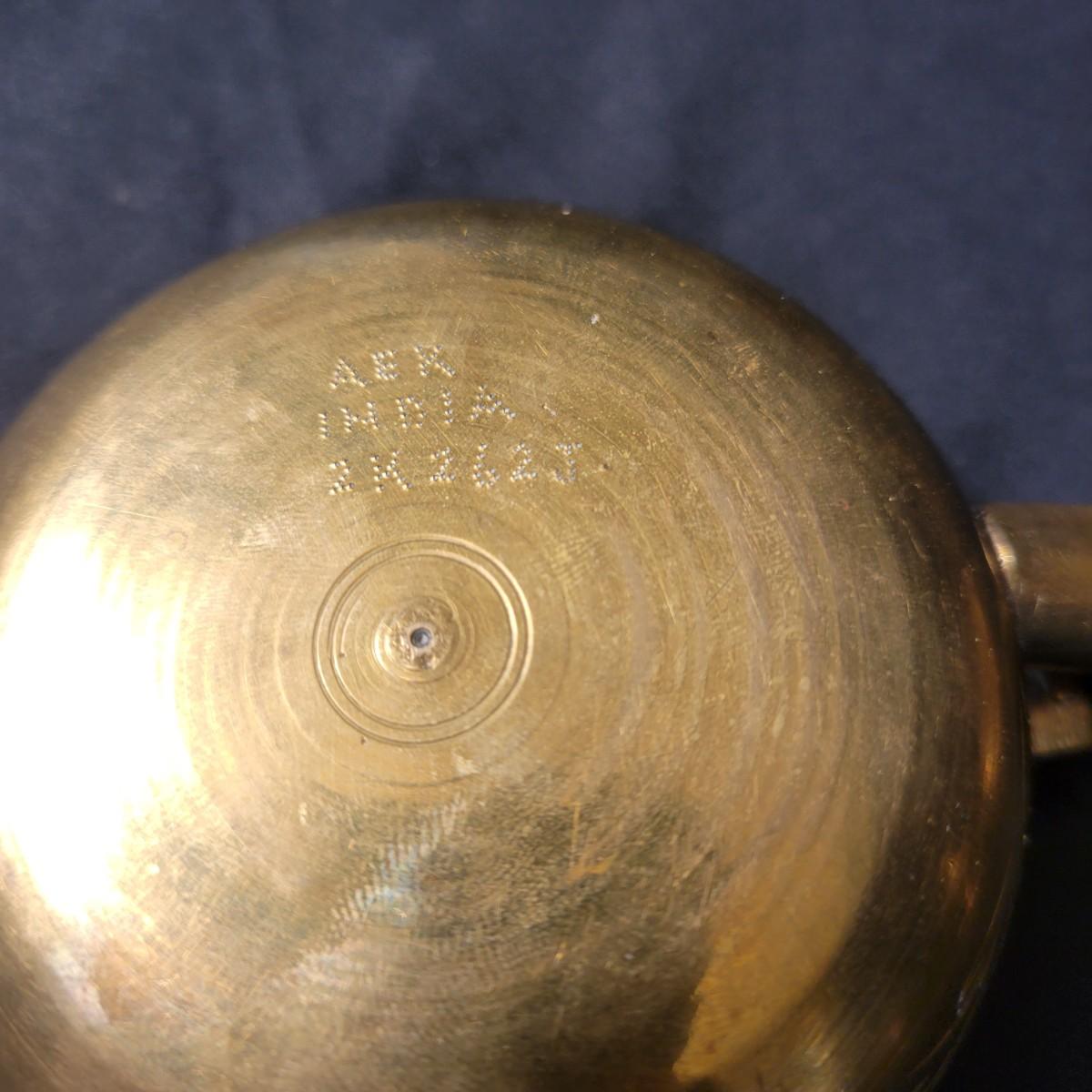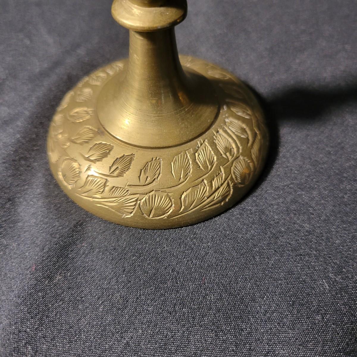 A collection of five matching brass pieces and a wooden trivet made in India that are in good condition with no notable damage. Included is three vases, a 6.5" plate, a decorative lidded bowl with a handle and a carved wooden trivet. Largest vase measures approximately 3" x 8.5" Shipping available