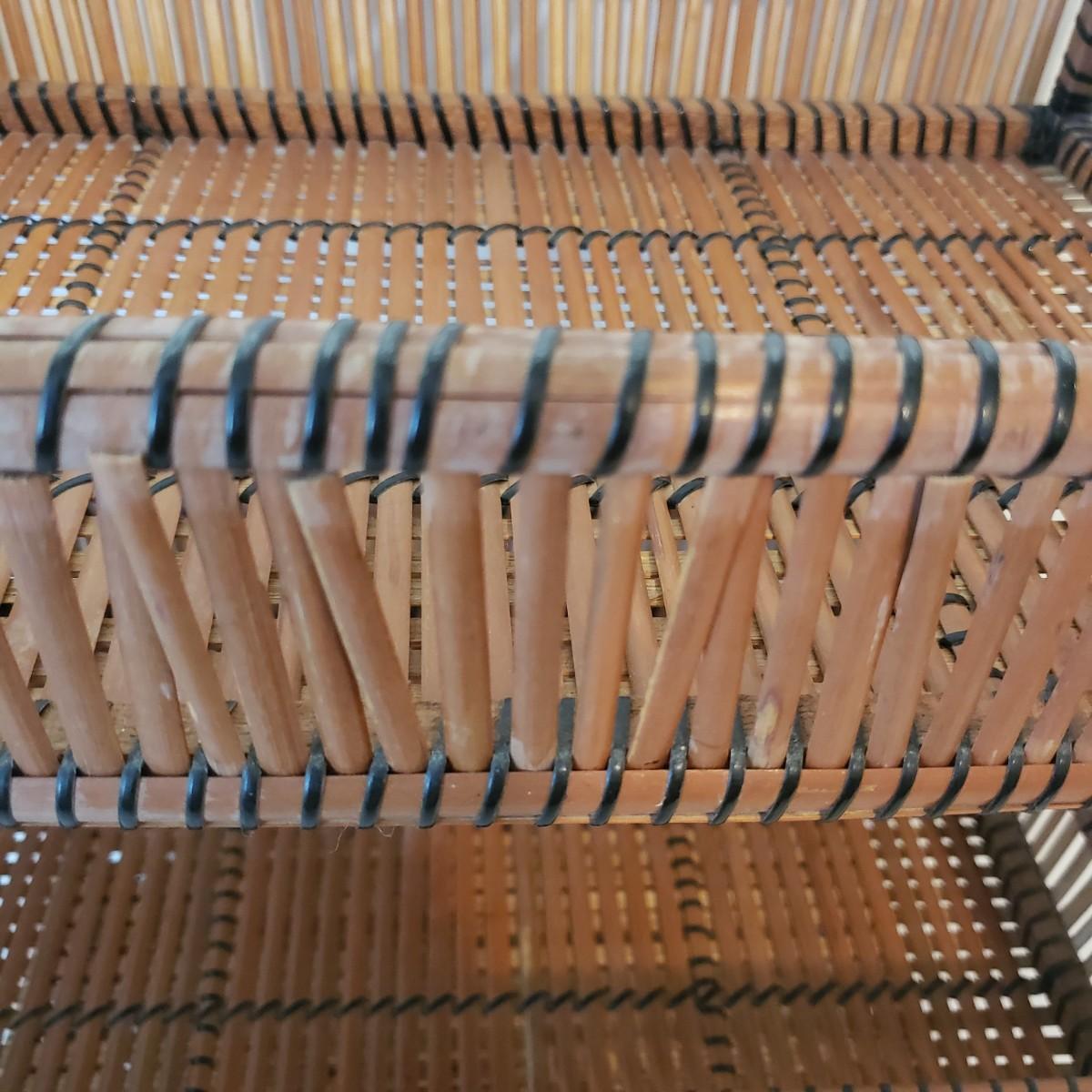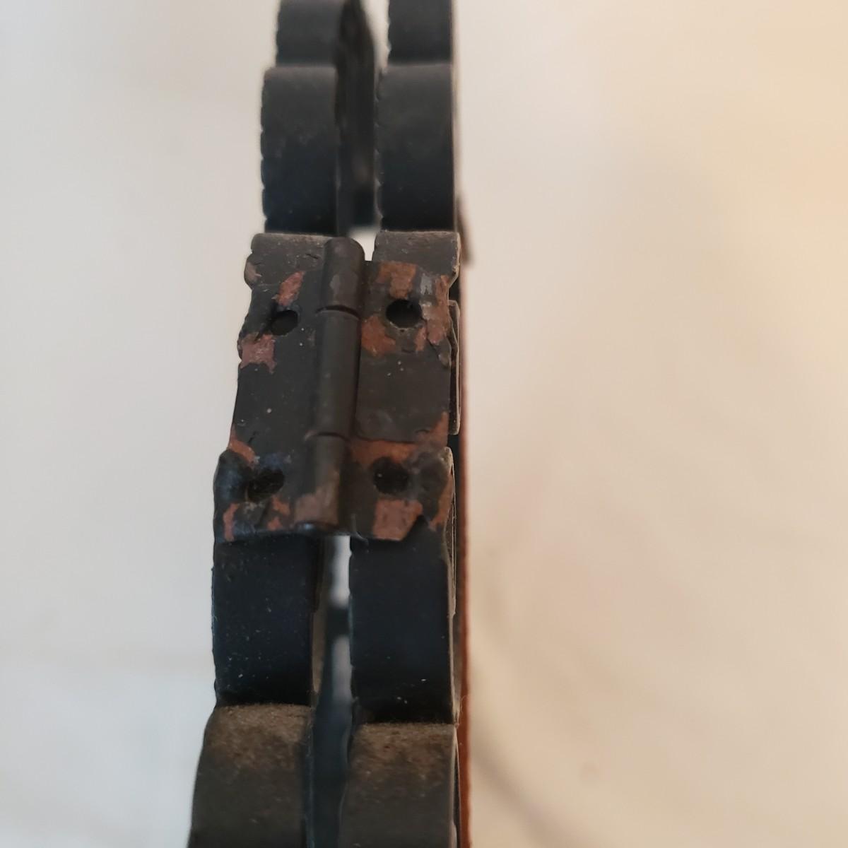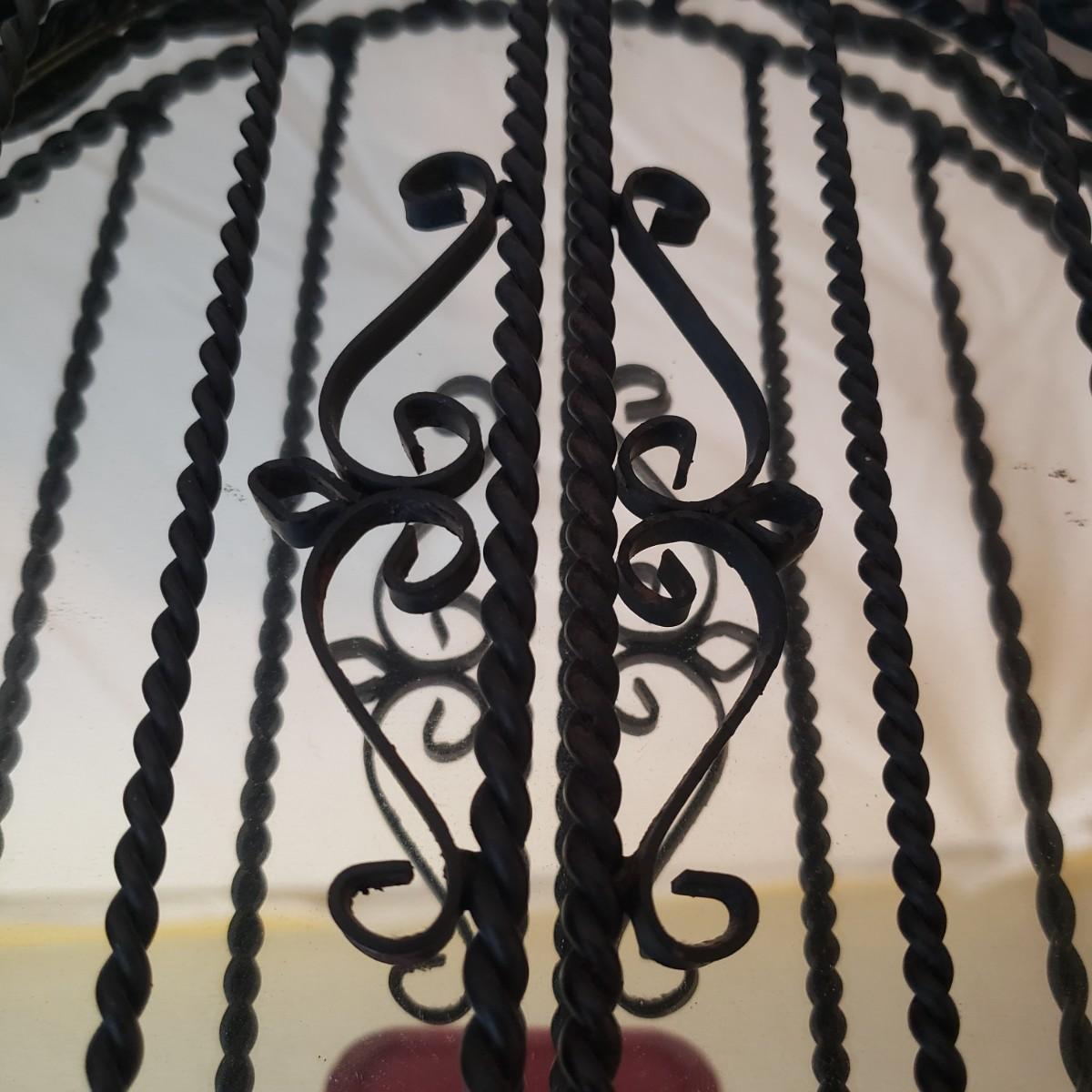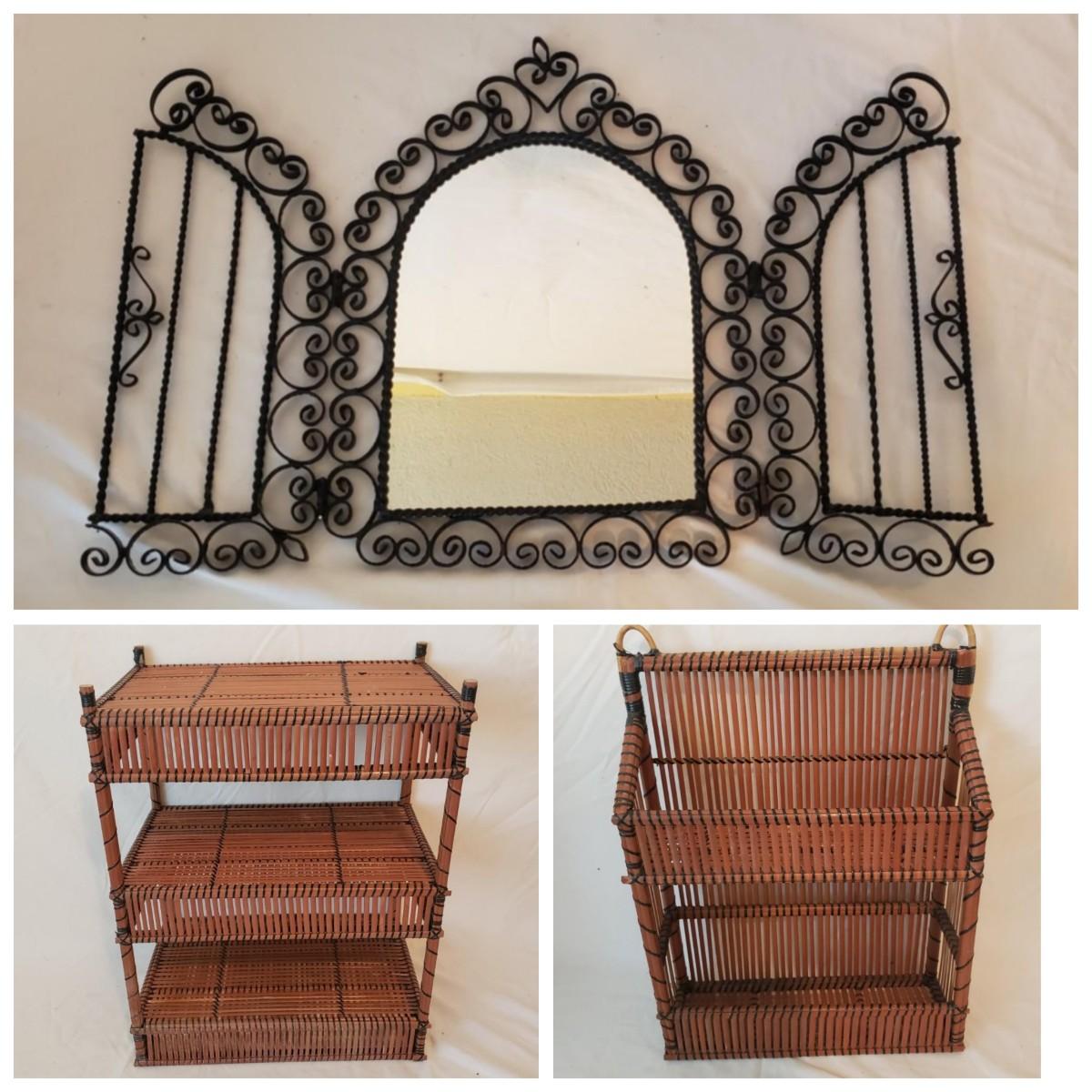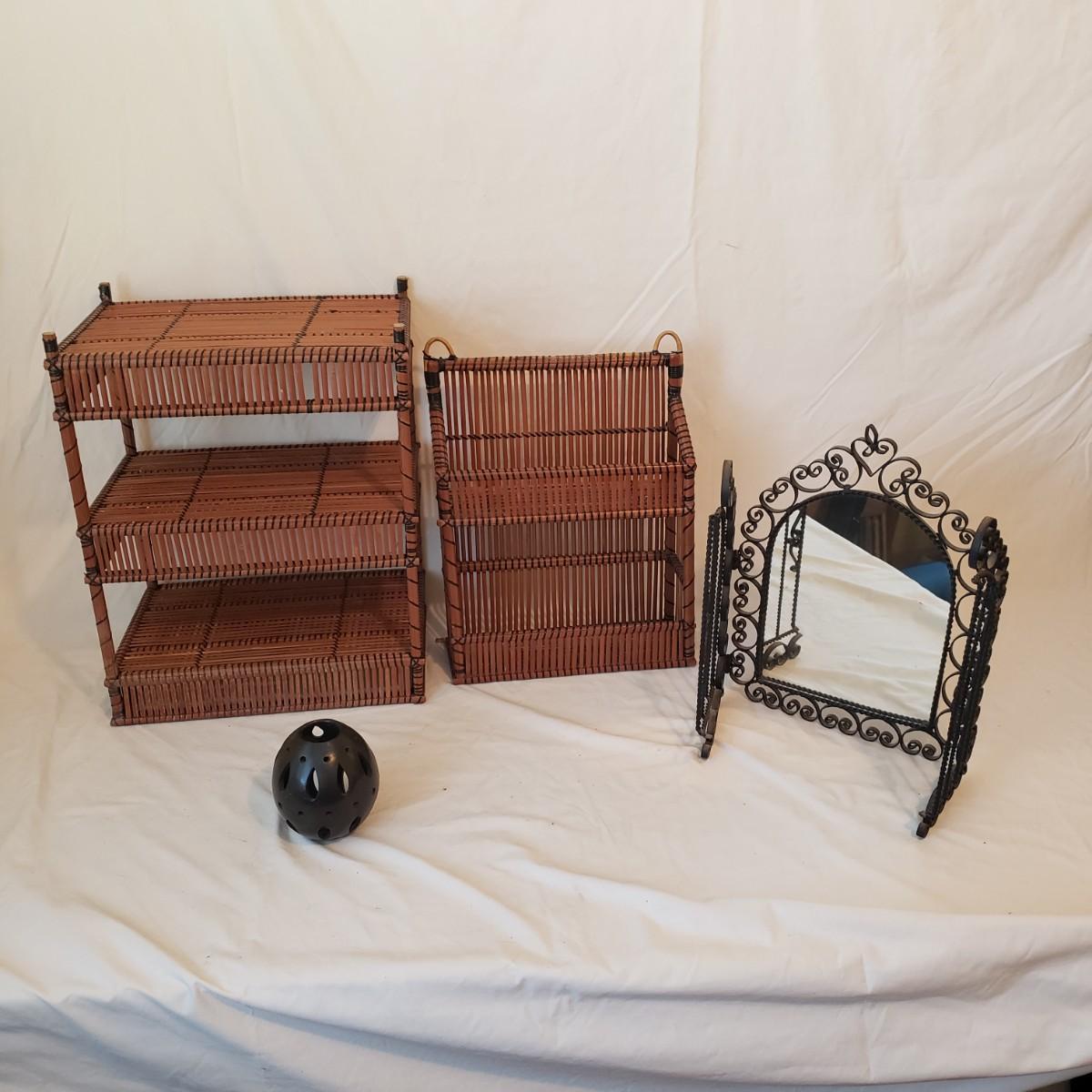 This four piece lot features an ornate scrolled iron mirror. The two gates open from the middle. The mirror measures 11" x 15"H. The two matching shelves are made from a thicker Rattan. The ceramic egg measures 4" x 5"H.