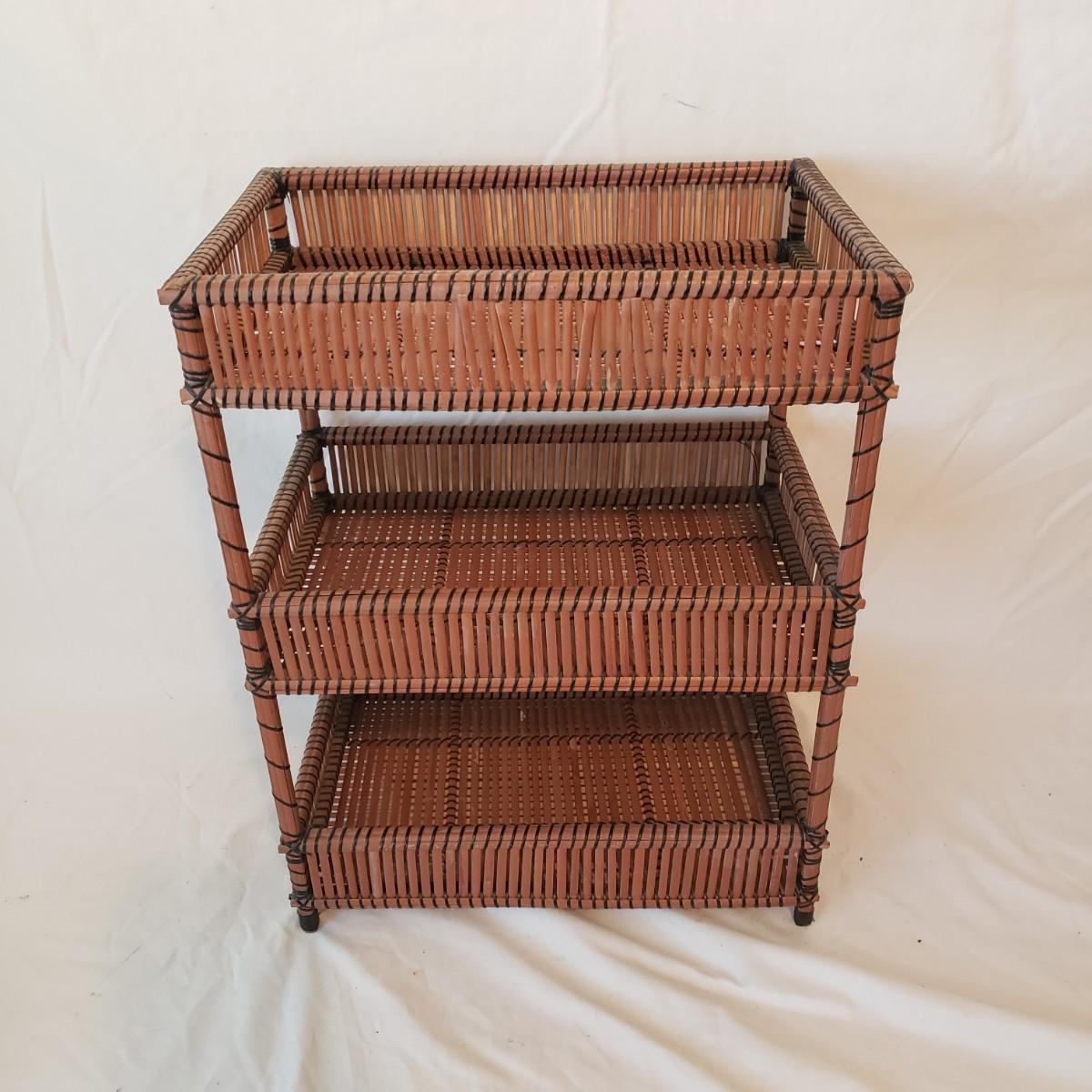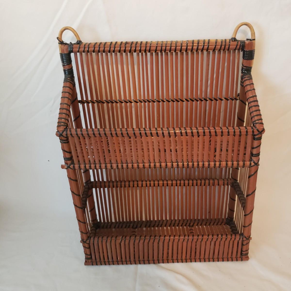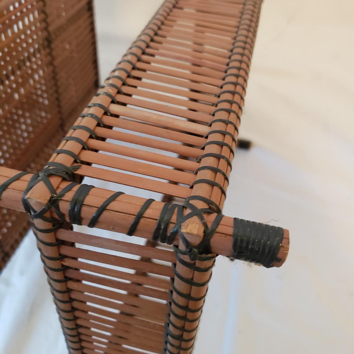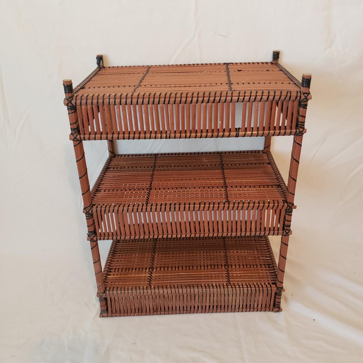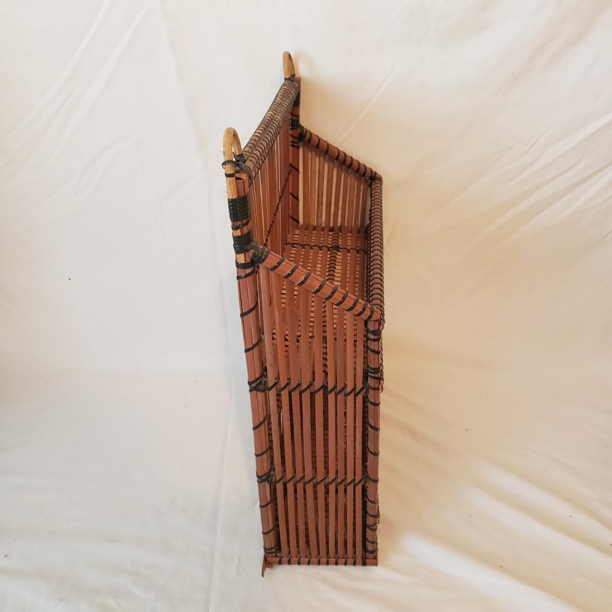 This four piece lot features an ornate scrolled iron mirror. The two gates open from the middle. The mirror measures 11" x 15"H. The two matching shelves are made from a thicker Rattan. The ceramic egg measures 4" x 5"H.