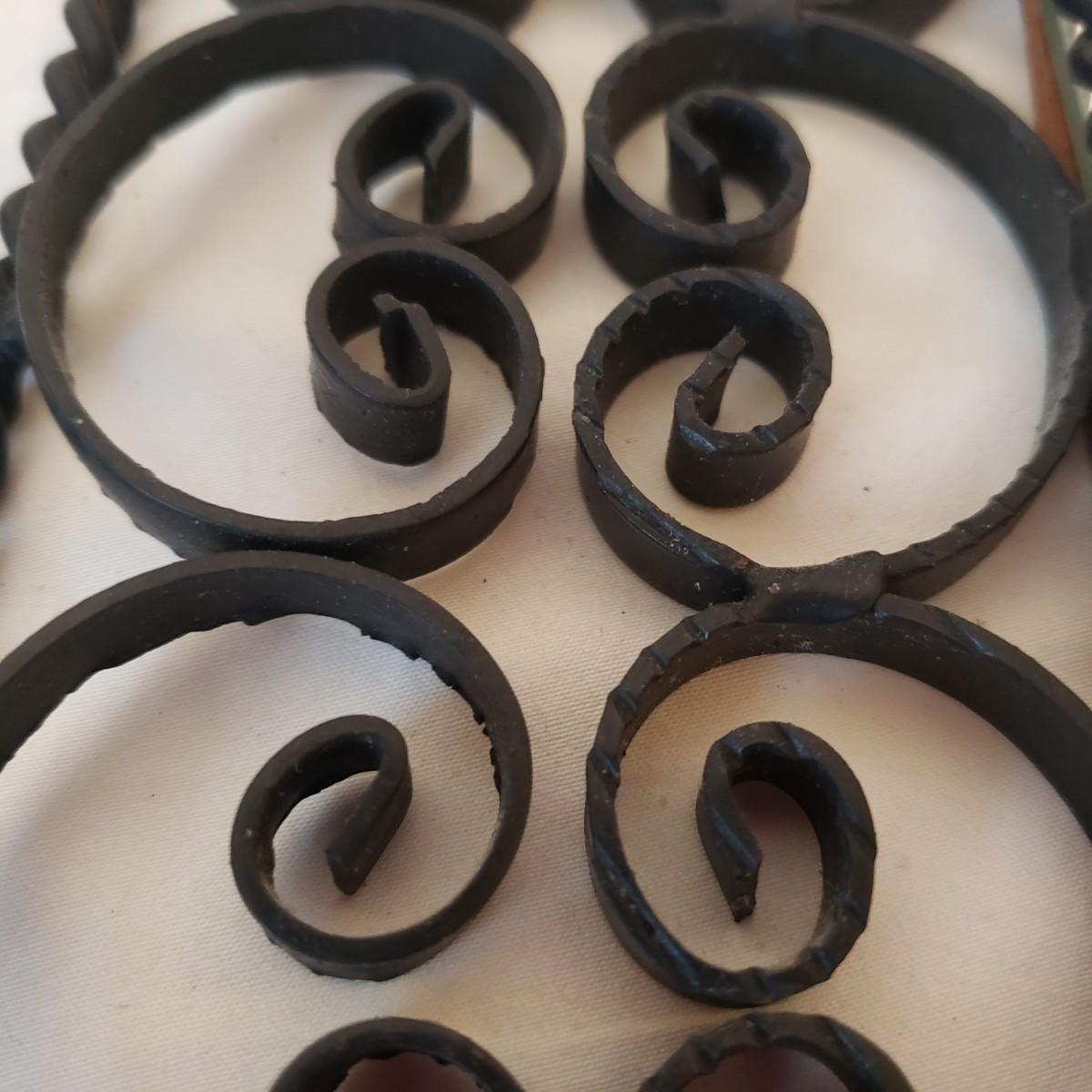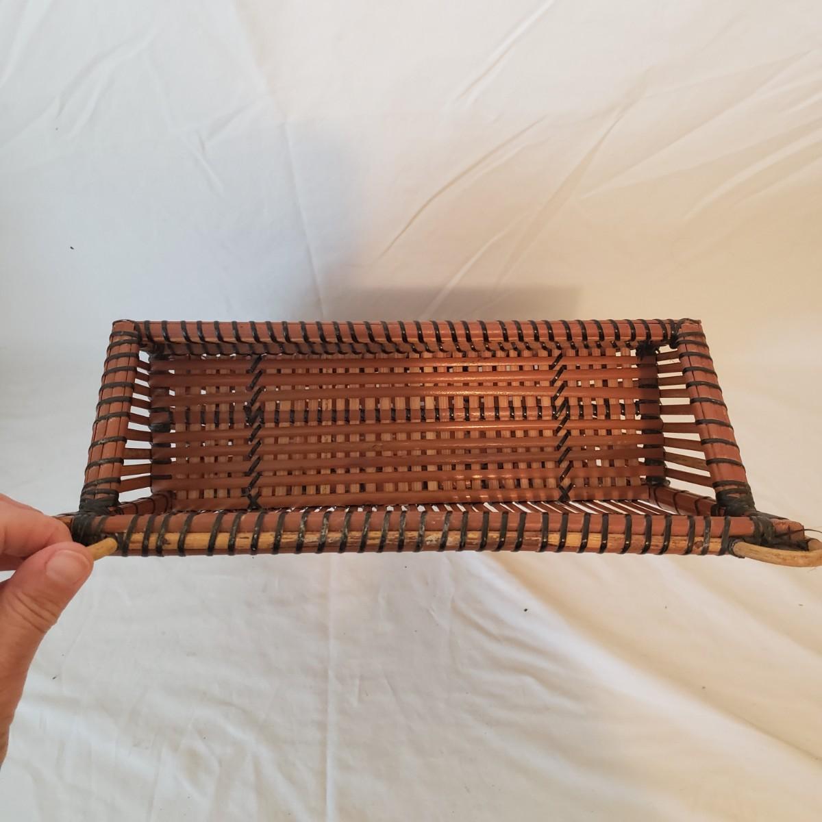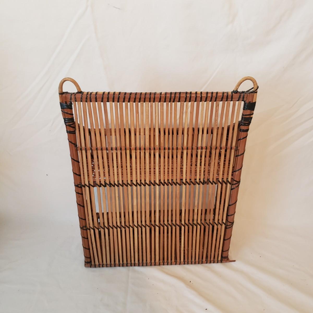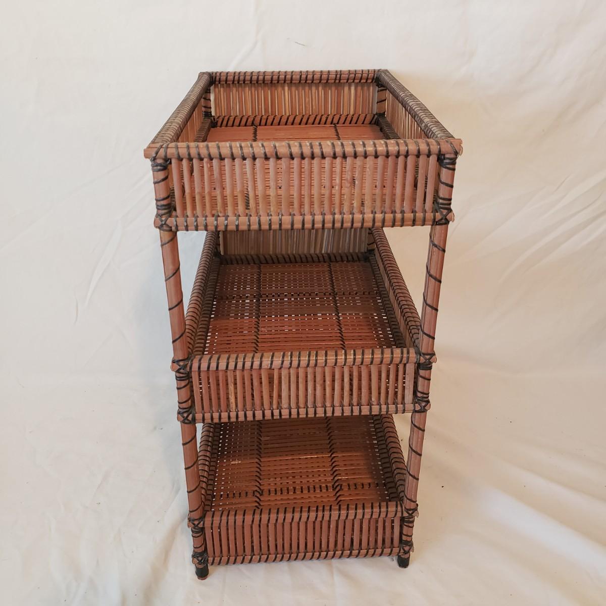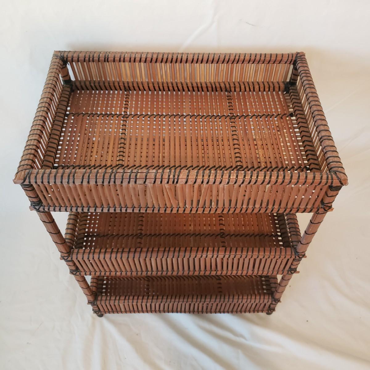 This four piece lot features an ornate scrolled iron mirror. The two gates open from the middle. The mirror measures 11" x 15"H. The two matching shelves are made from a thicker Rattan. The ceramic egg measures 4" x 5"H.