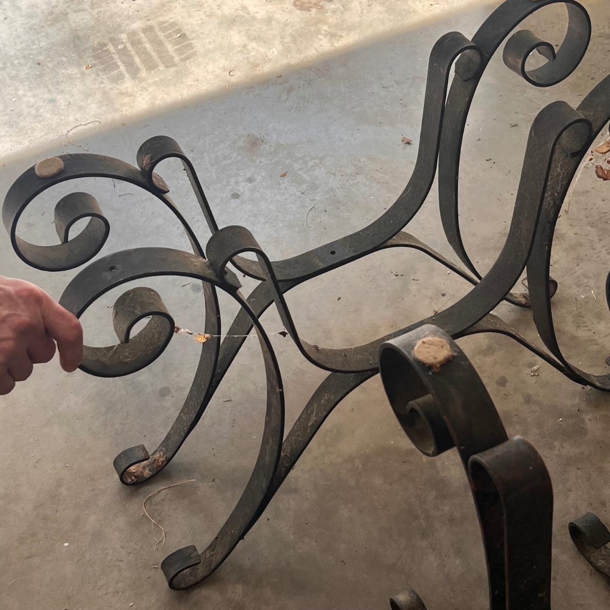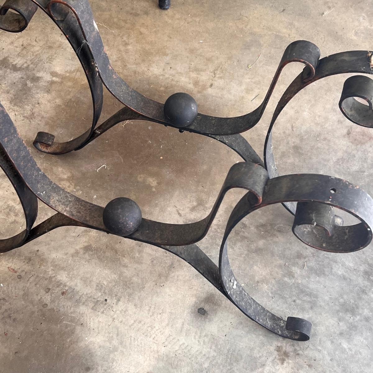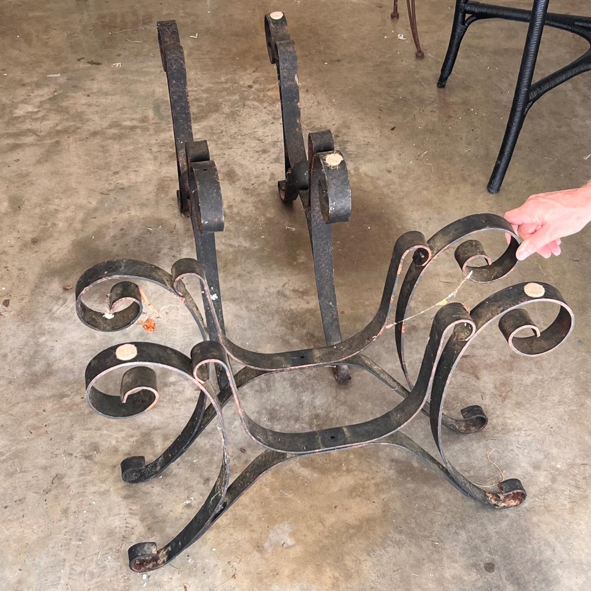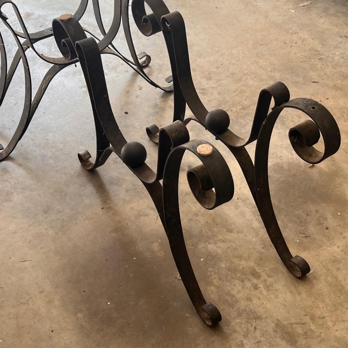Four decorative iron legs for a table; there is no top included so this is a project in the making. All the legs are the same size. The two without the decorative balls look like they would be the ends and the two with balls could be for a second table or used for the middle section for one table. A rod of some sort would be needed to support the sections.