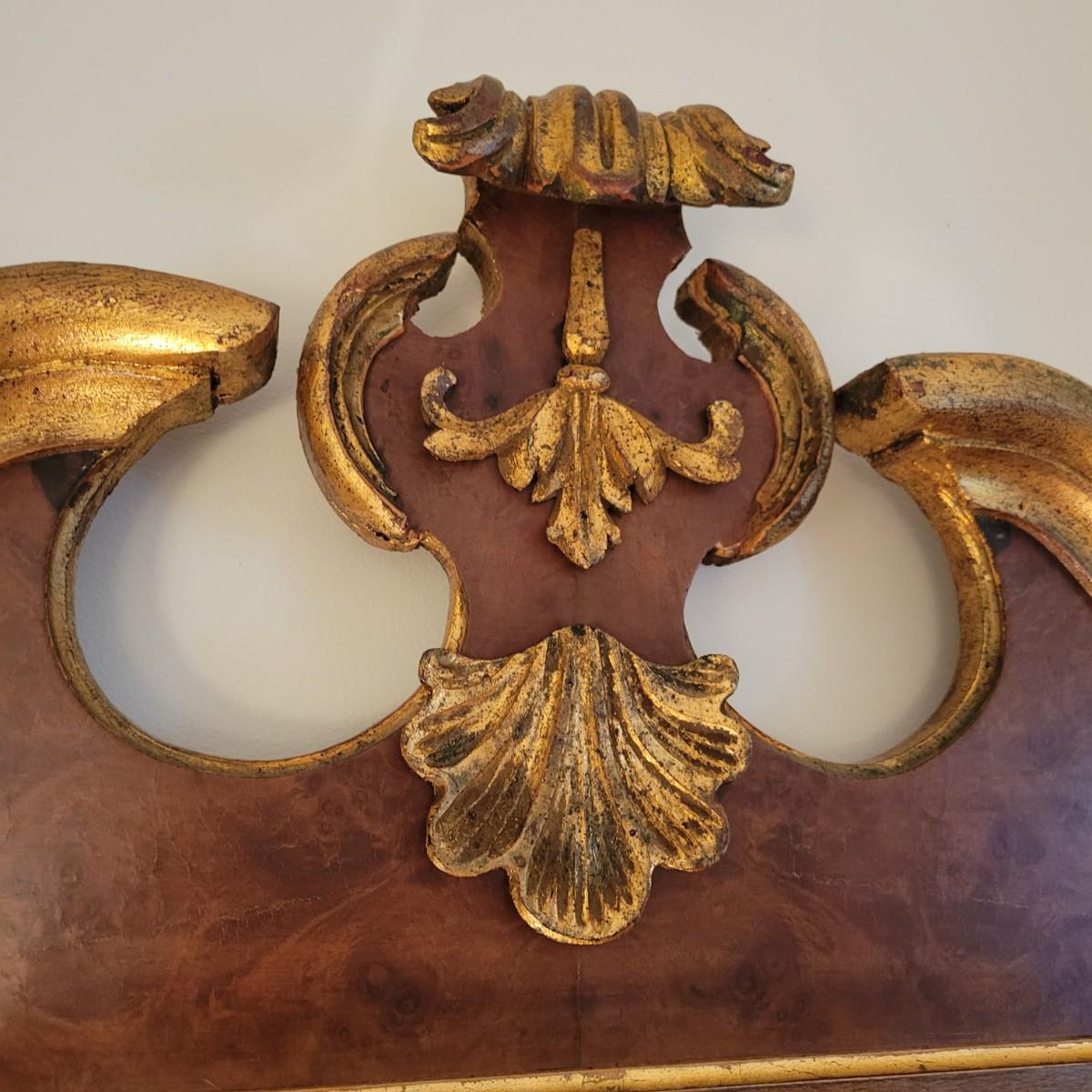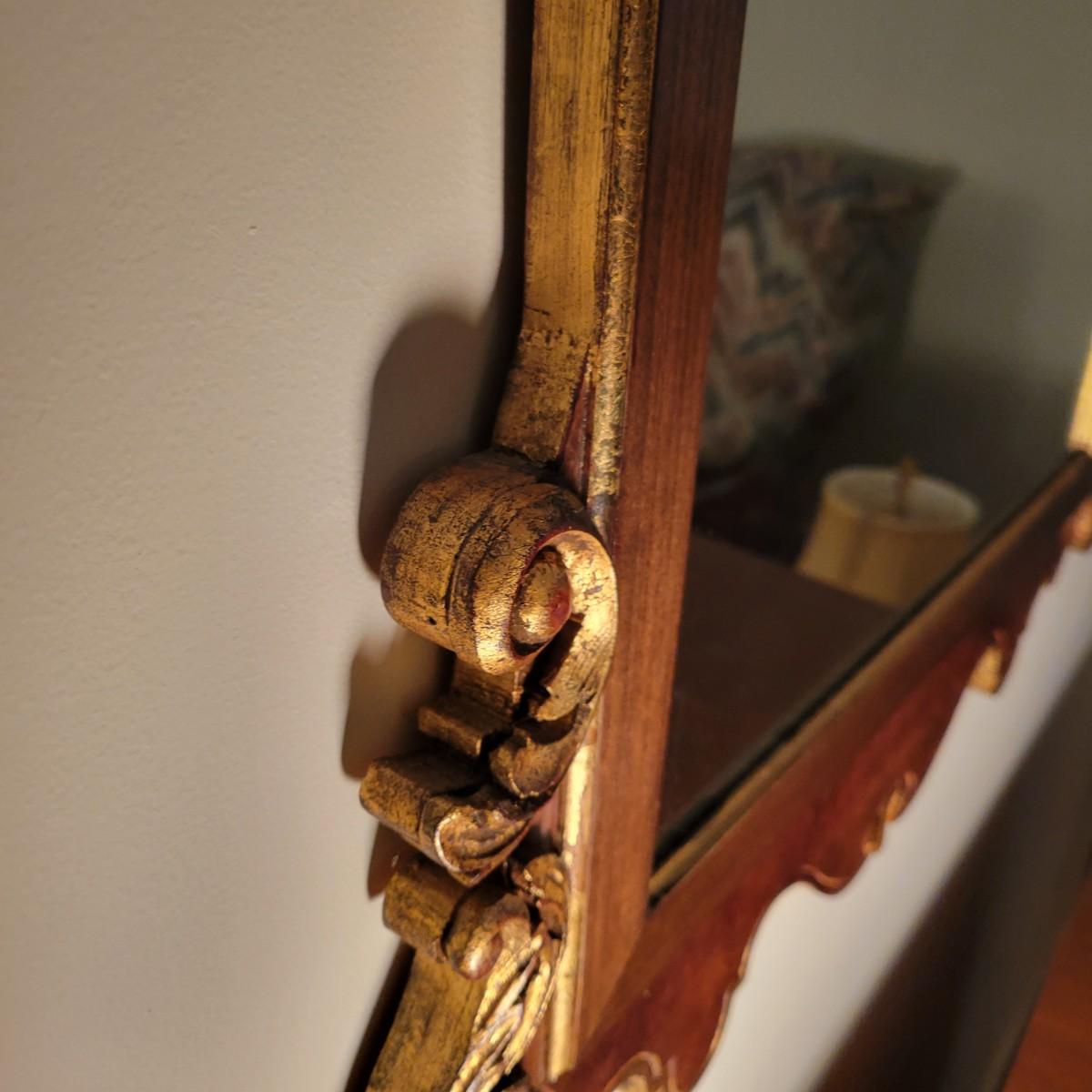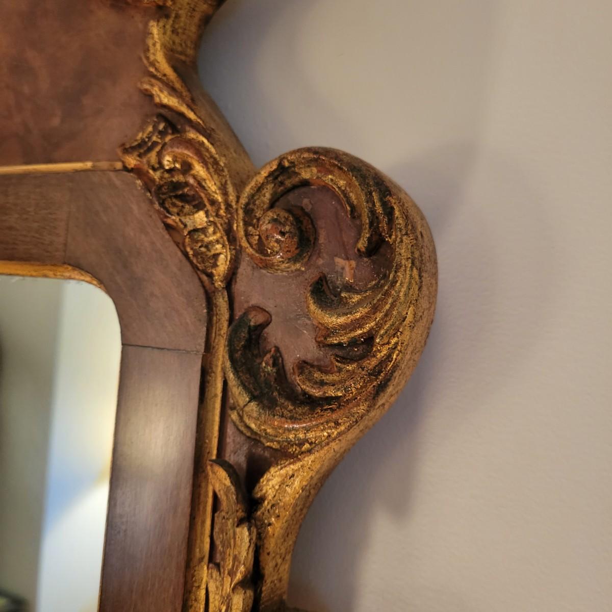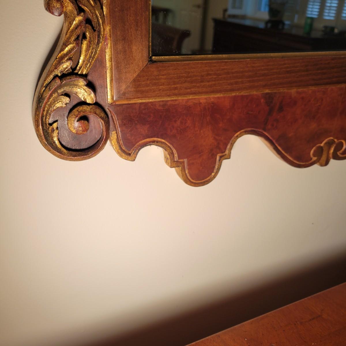 An ornate frame and mirror by La Barge in good condition with no notable damage. This piece was manufactured in Italy and features a maple veneer and what appears be a solid walnut frame with gold leaf accents. Measures approximately 25.5" x 49" x 1". Local pickup only