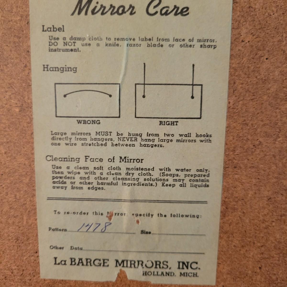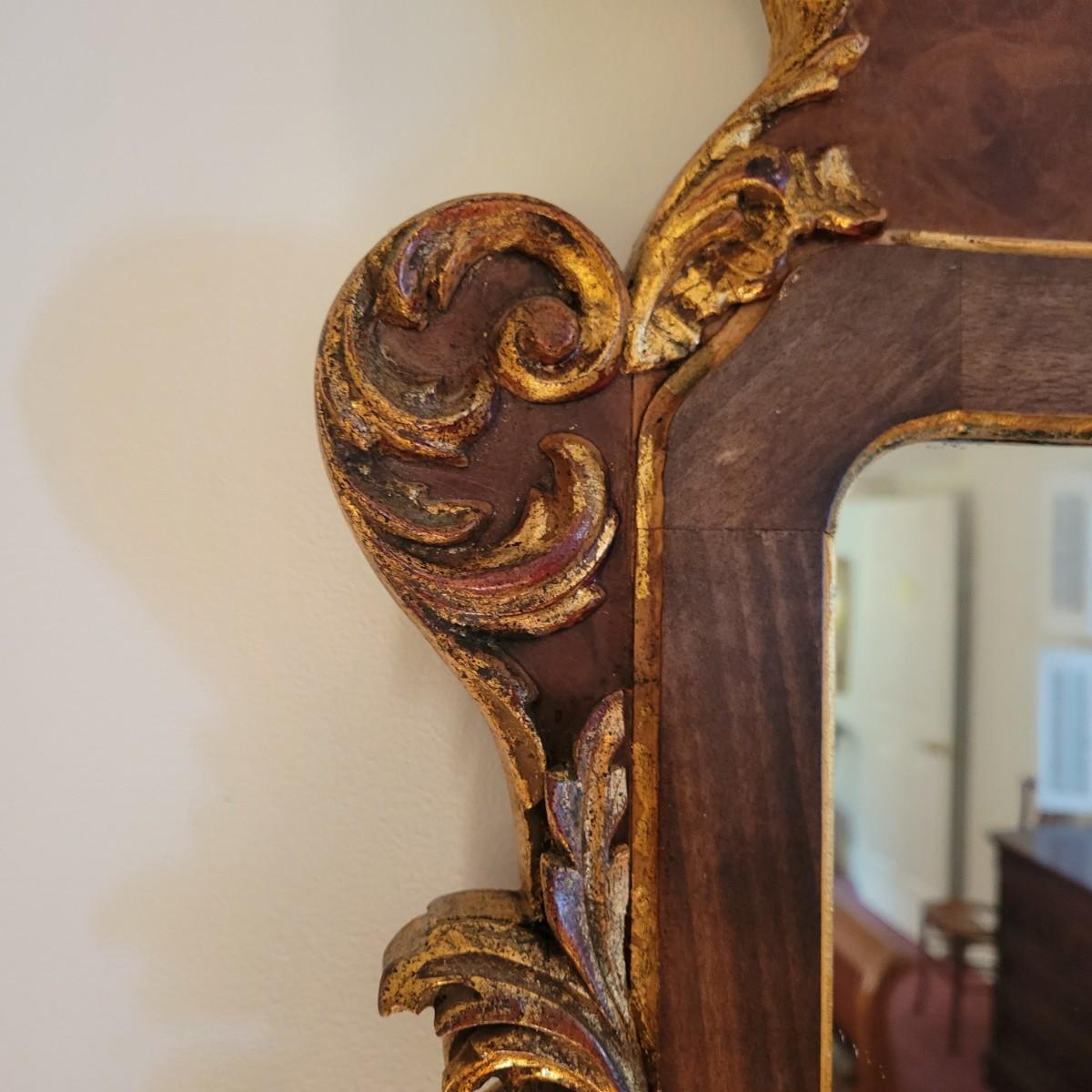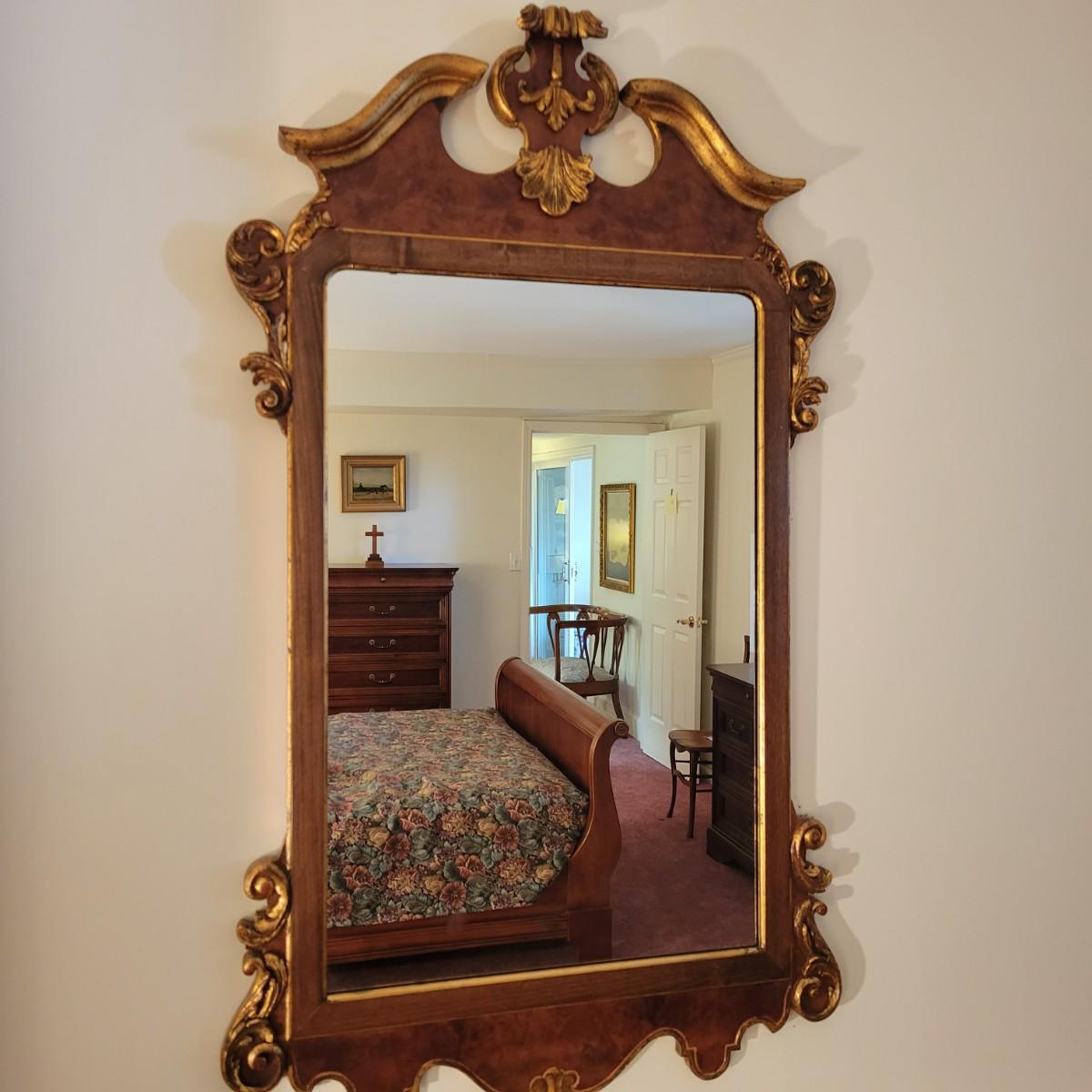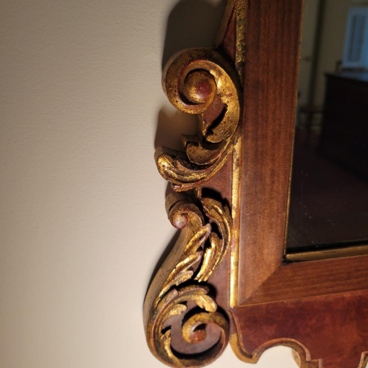 An ornate frame and mirror by La Barge in good condition with no notable damage. This piece was manufactured in Italy and features a maple veneer and what appears be a solid walnut frame with gold leaf accents. Measures approximately 25.5" x 49" x 1". Local pickup only