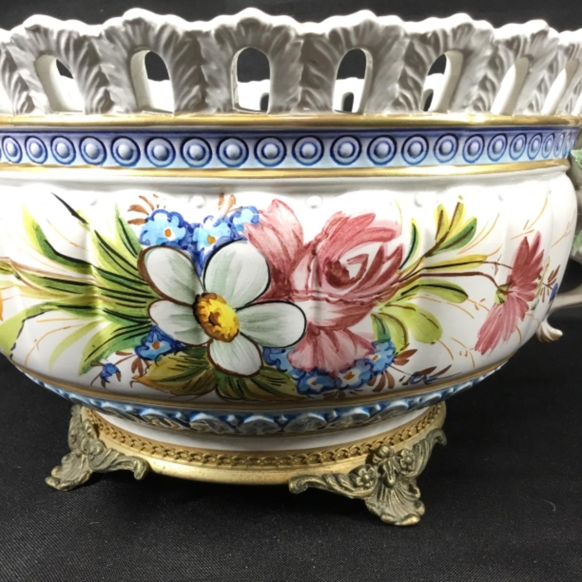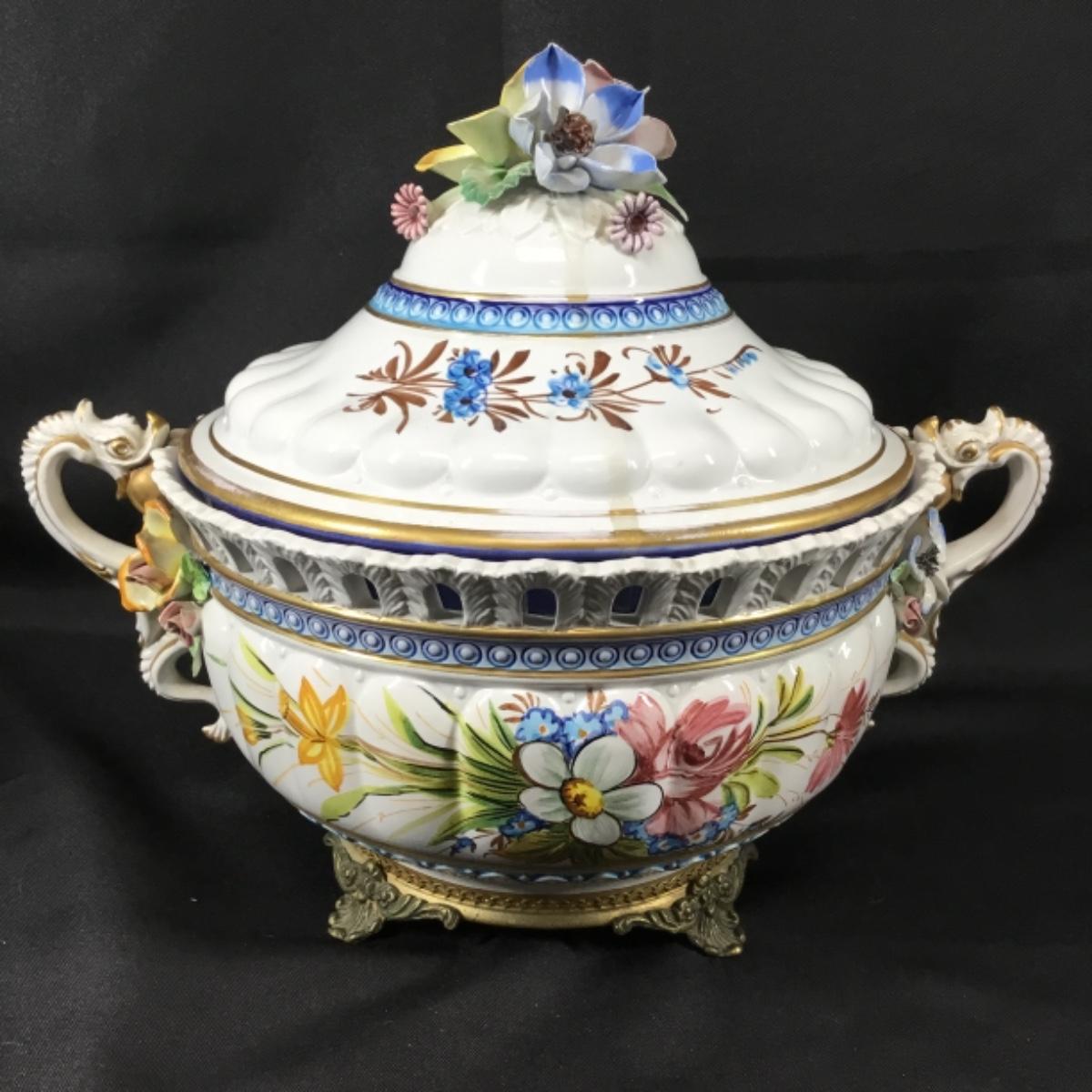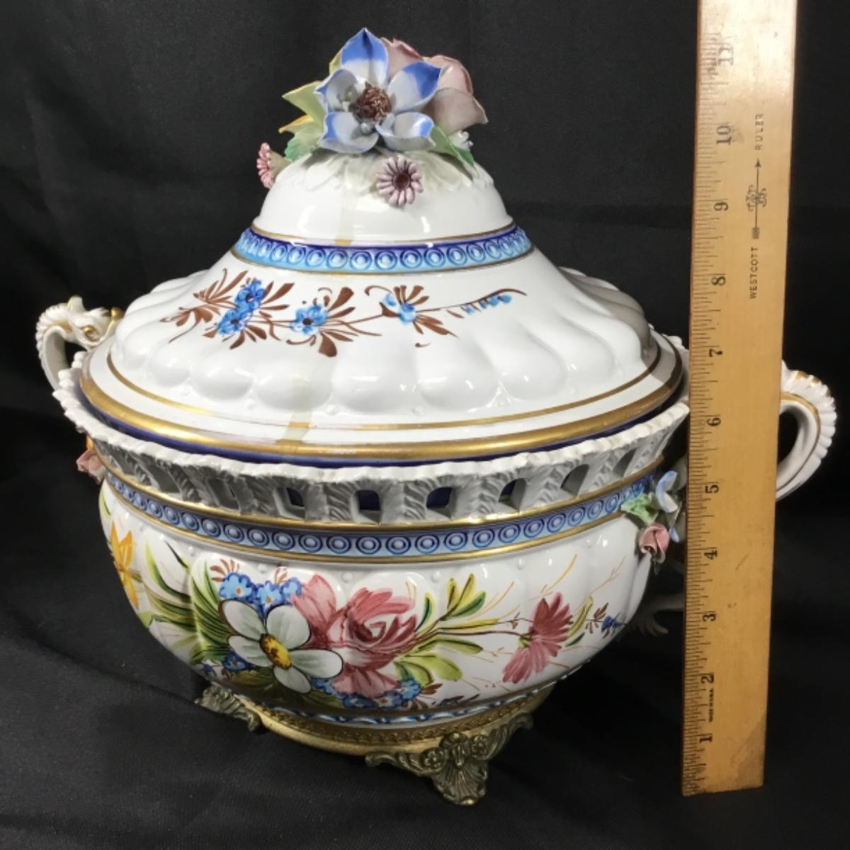 Up for auction is an ornate serving bowl. It appears to be made of ceramic with metal feet on the bottom. The gold glazing is worn on the rim of the lid; see pictures. There is crazing on the glaze on the body of the pot as well; see pictures. Signed on the bottom. Looks hand painted. A few chipped flower petals but not to noticeable.