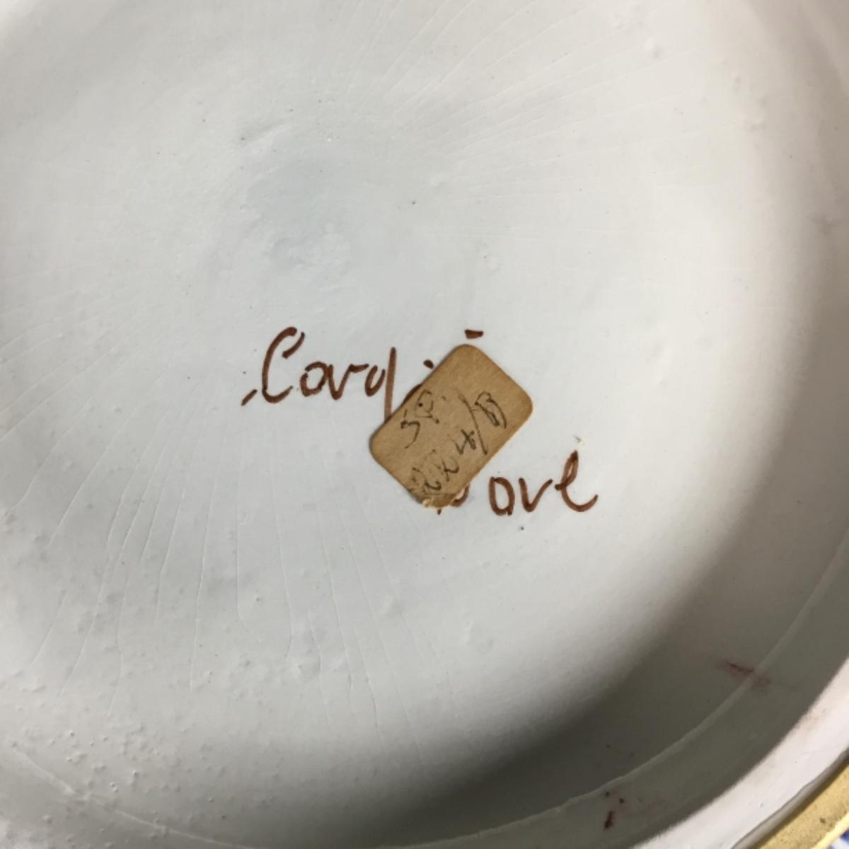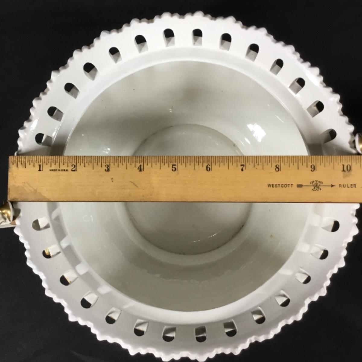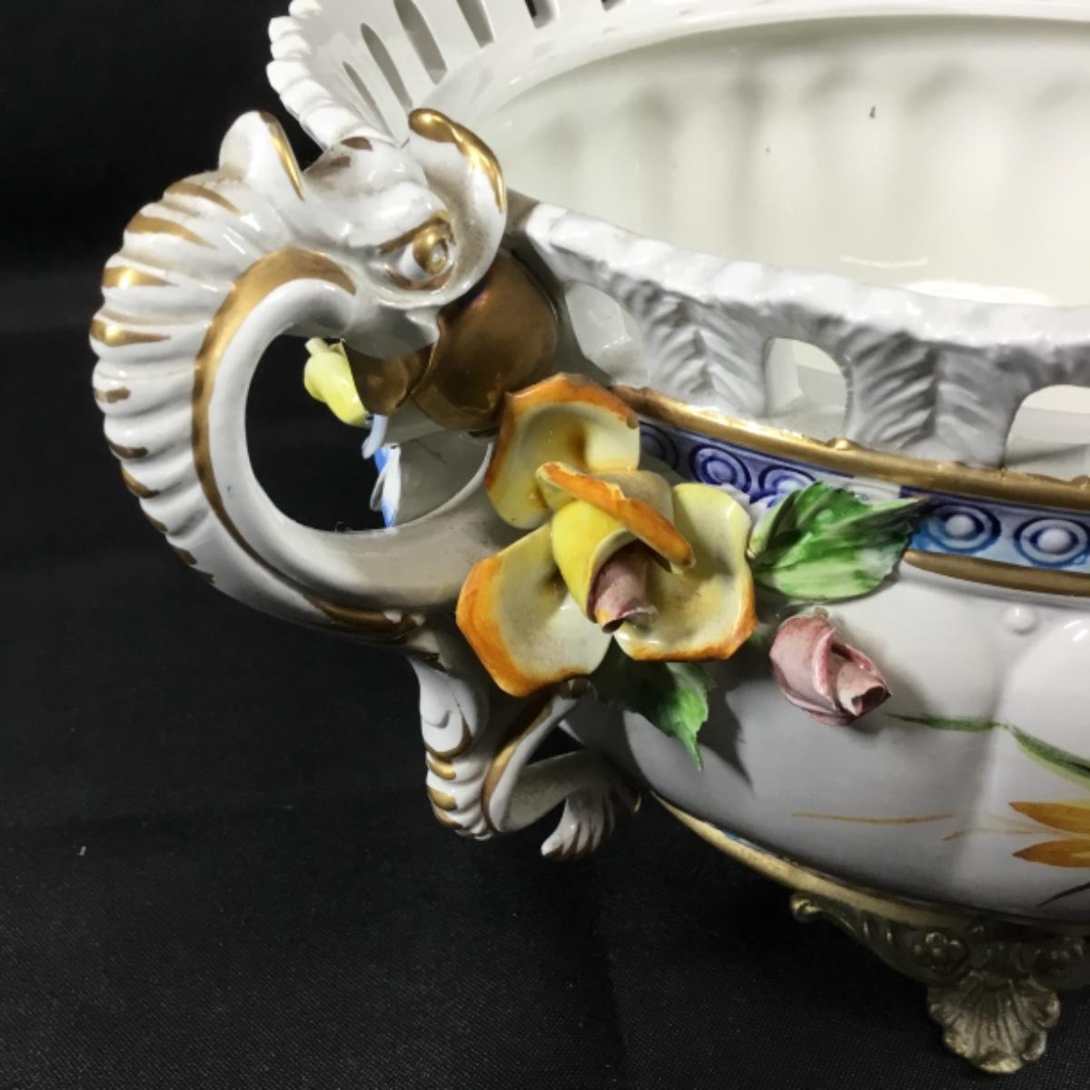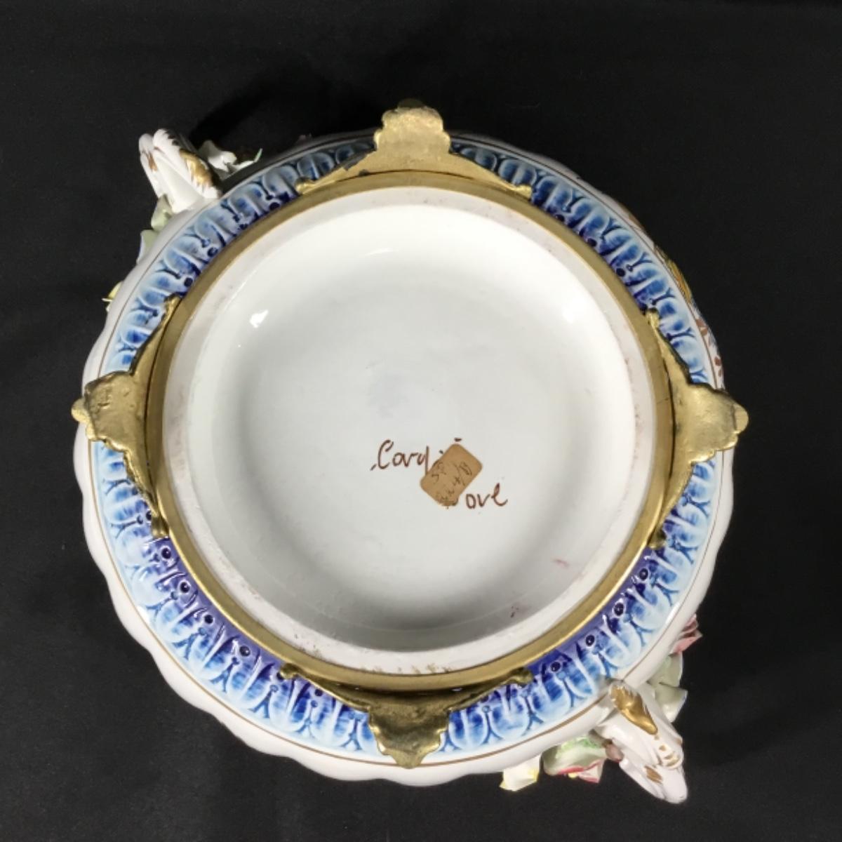 Up for auction is an ornate serving bowl. It appears to be made of ceramic with metal feet on the bottom. The gold glazing is worn on the rim of the lid; see pictures. There is crazing on the glaze on the body of the pot as well; see pictures. Signed on the bottom. Looks hand painted. A few chipped flower petals but not to noticeable.