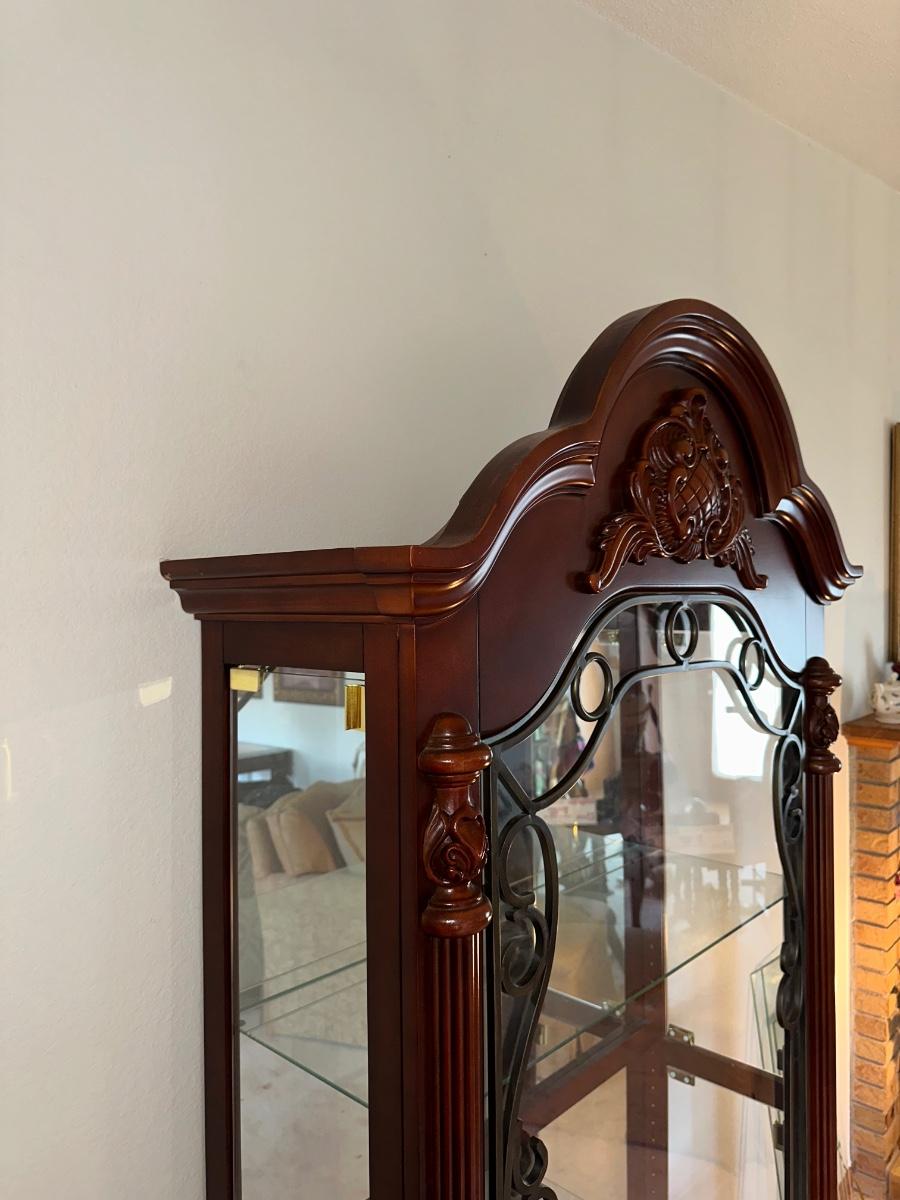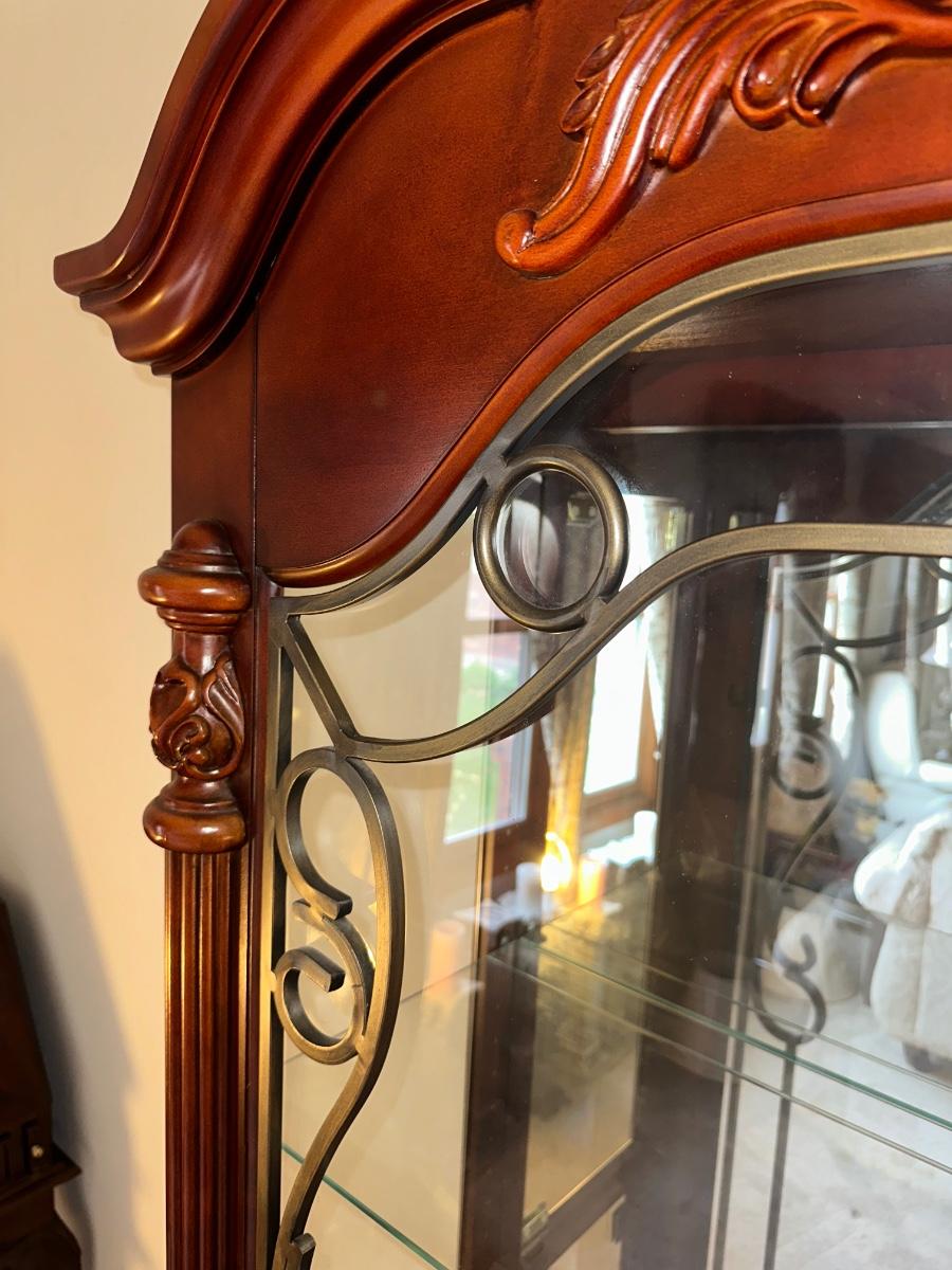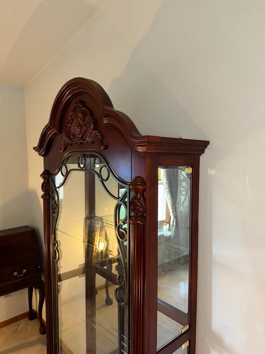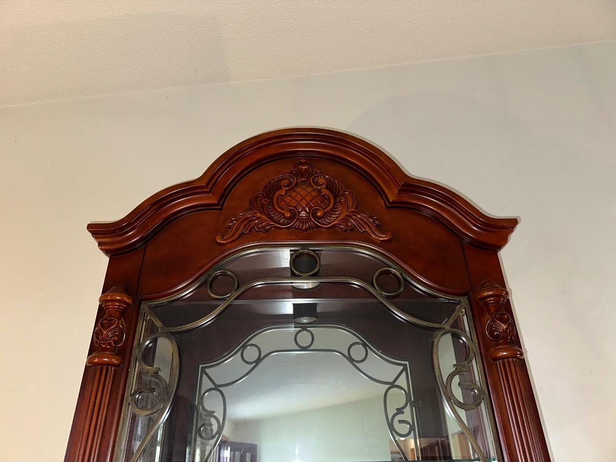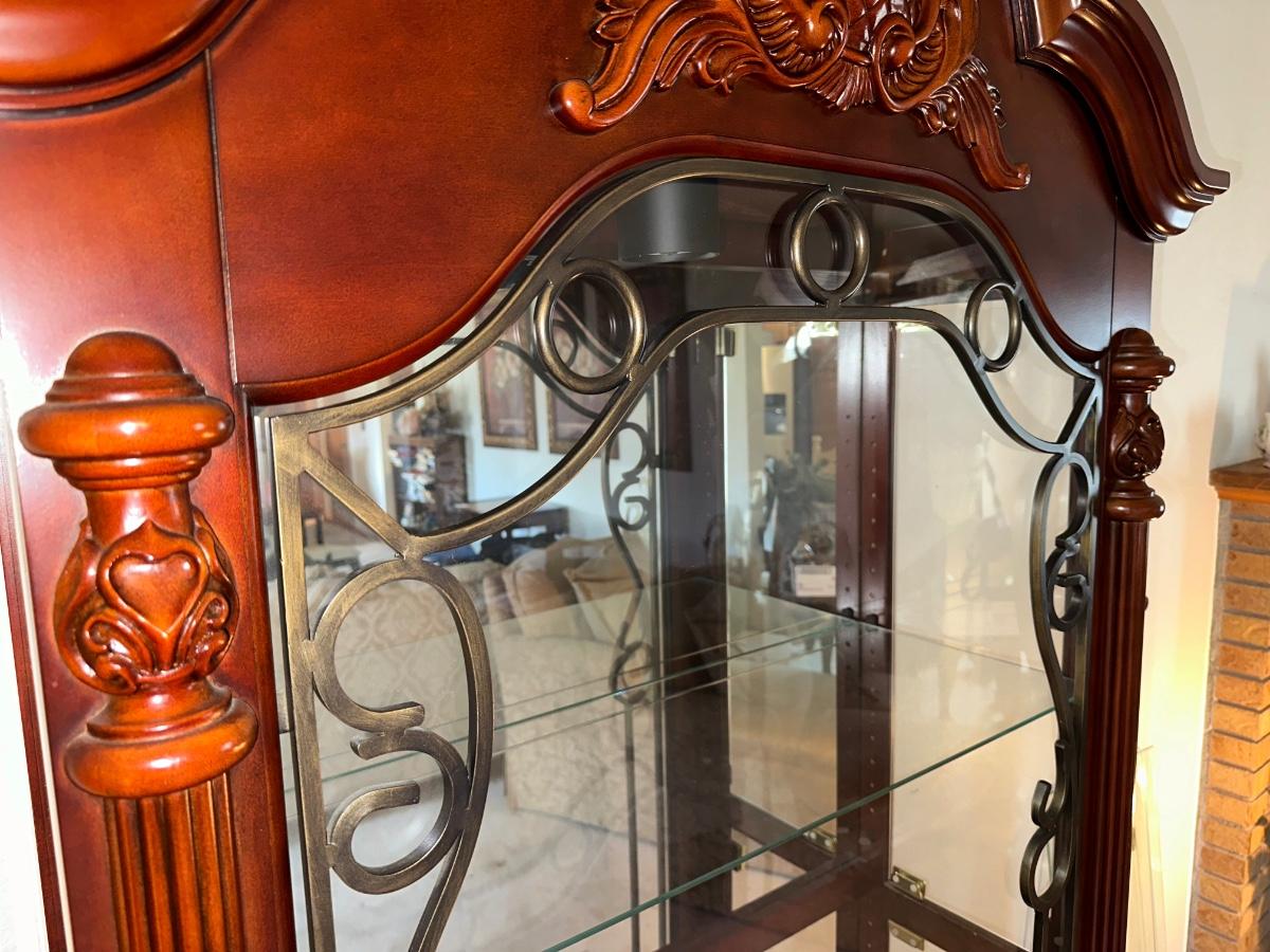 ORNATE LIGHTED CURIO CABINET WITH MIRRORED BACK