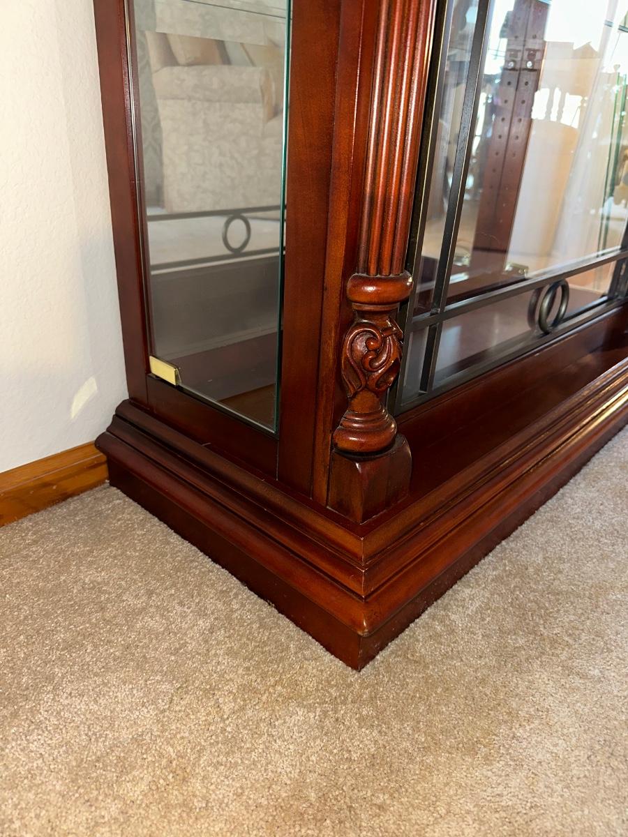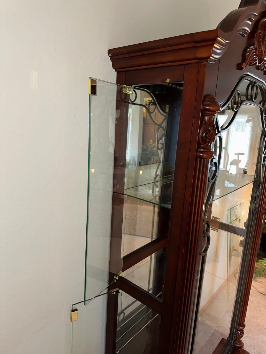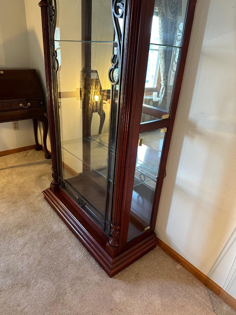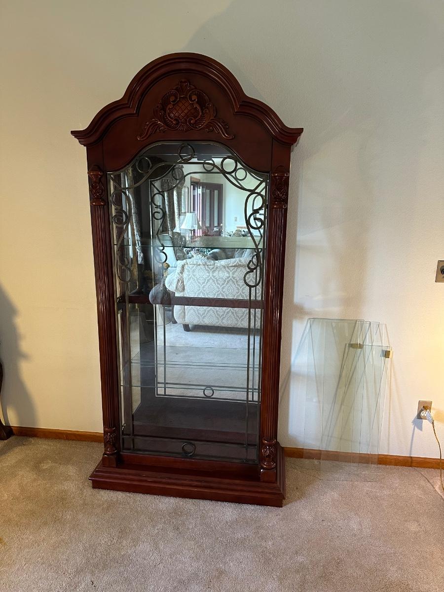 ORNATE LIGHTED CURIO CABINET WITH MIRRORED BACK