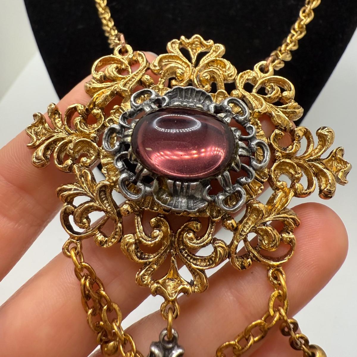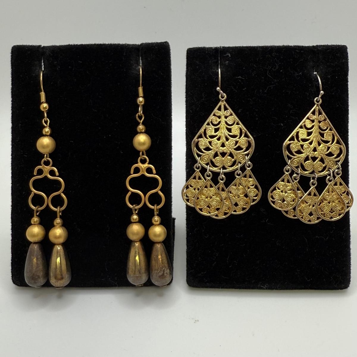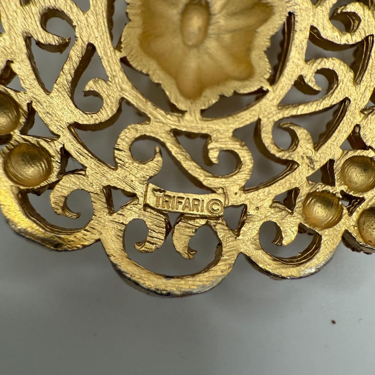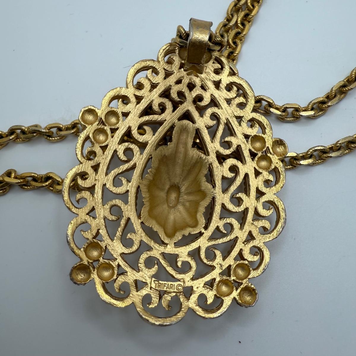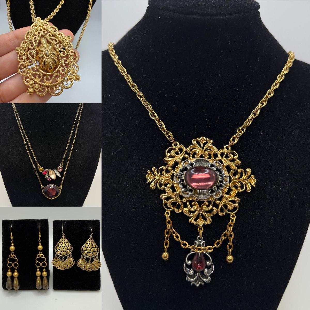 Three gorgeous ornate gold necklaces with two pairs of earrings for pierced ears. Two necklaces have gemstones. Two are double stranded. The single stranded necklace stamped “ART” is adjustable from about 20-23”. The other two necklaces are labeled Trifari and Chloe & Isabel.