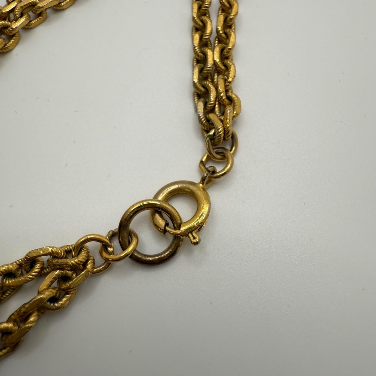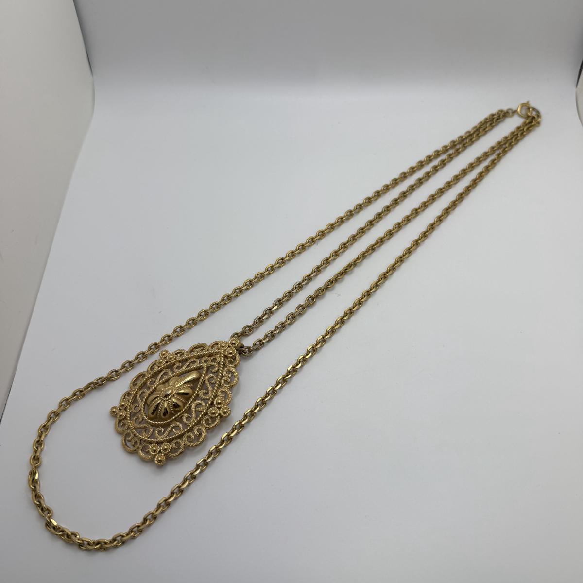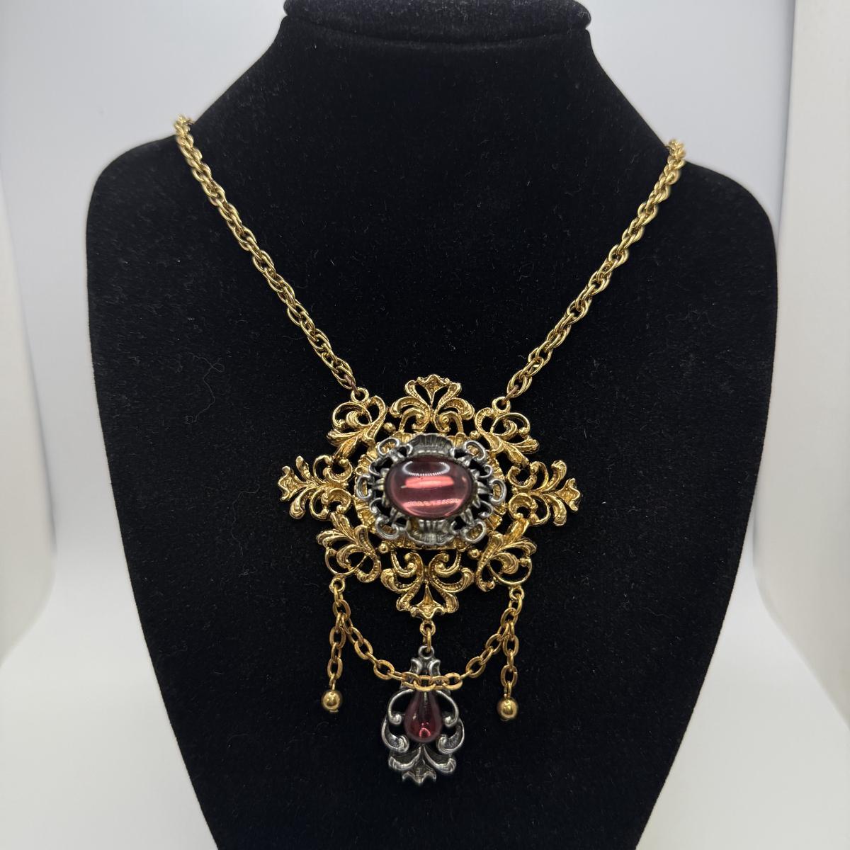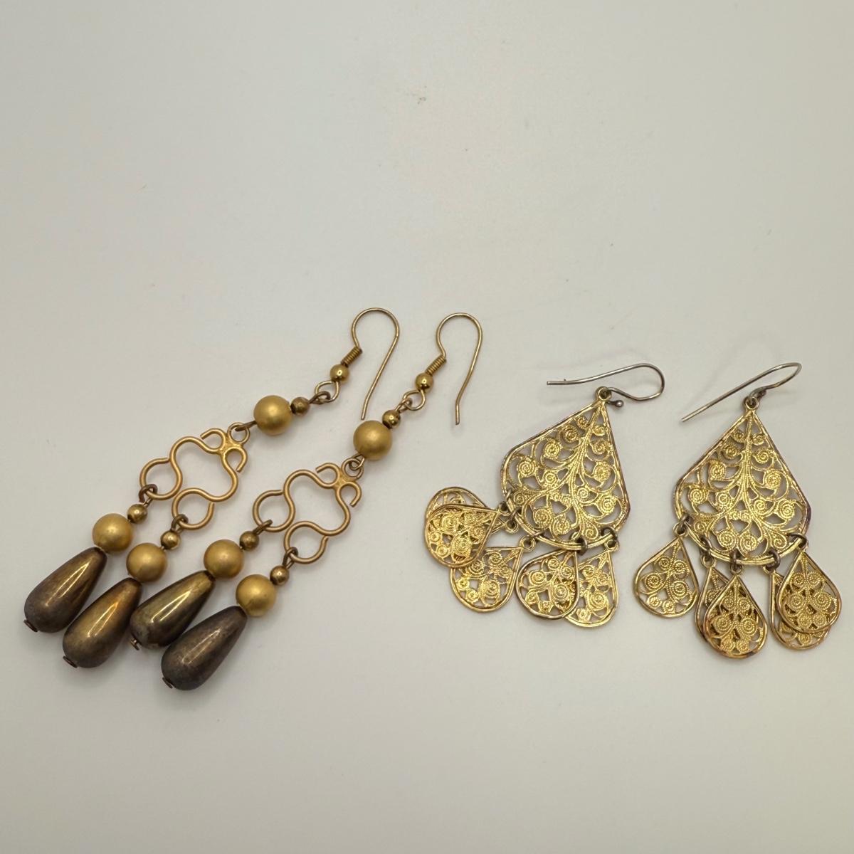 Three gorgeous ornate gold necklaces with two pairs of earrings for pierced ears. Two necklaces have gemstones. Two are double stranded. The single stranded necklace stamped “ART” is adjustable from about 20-23”. The other two necklaces are labeled Trifari and Chloe & Isabel.