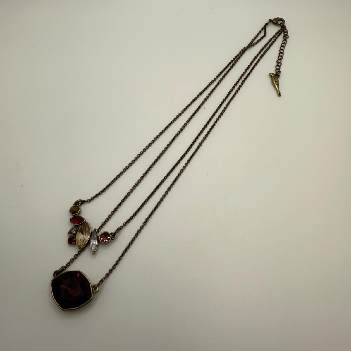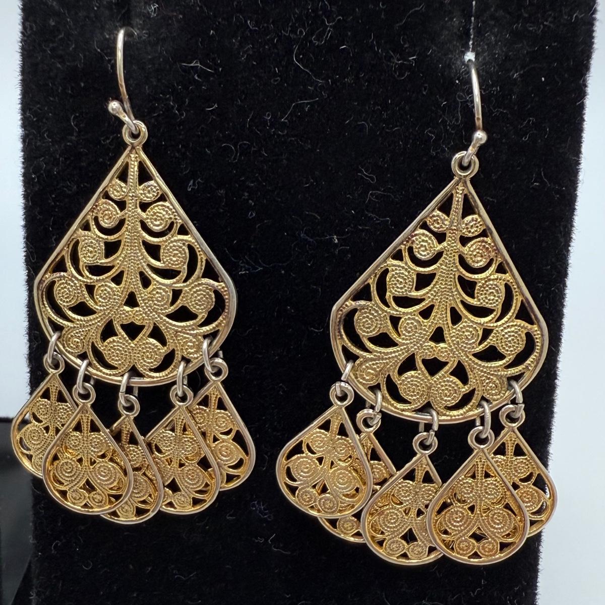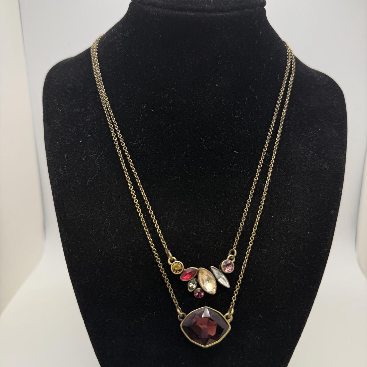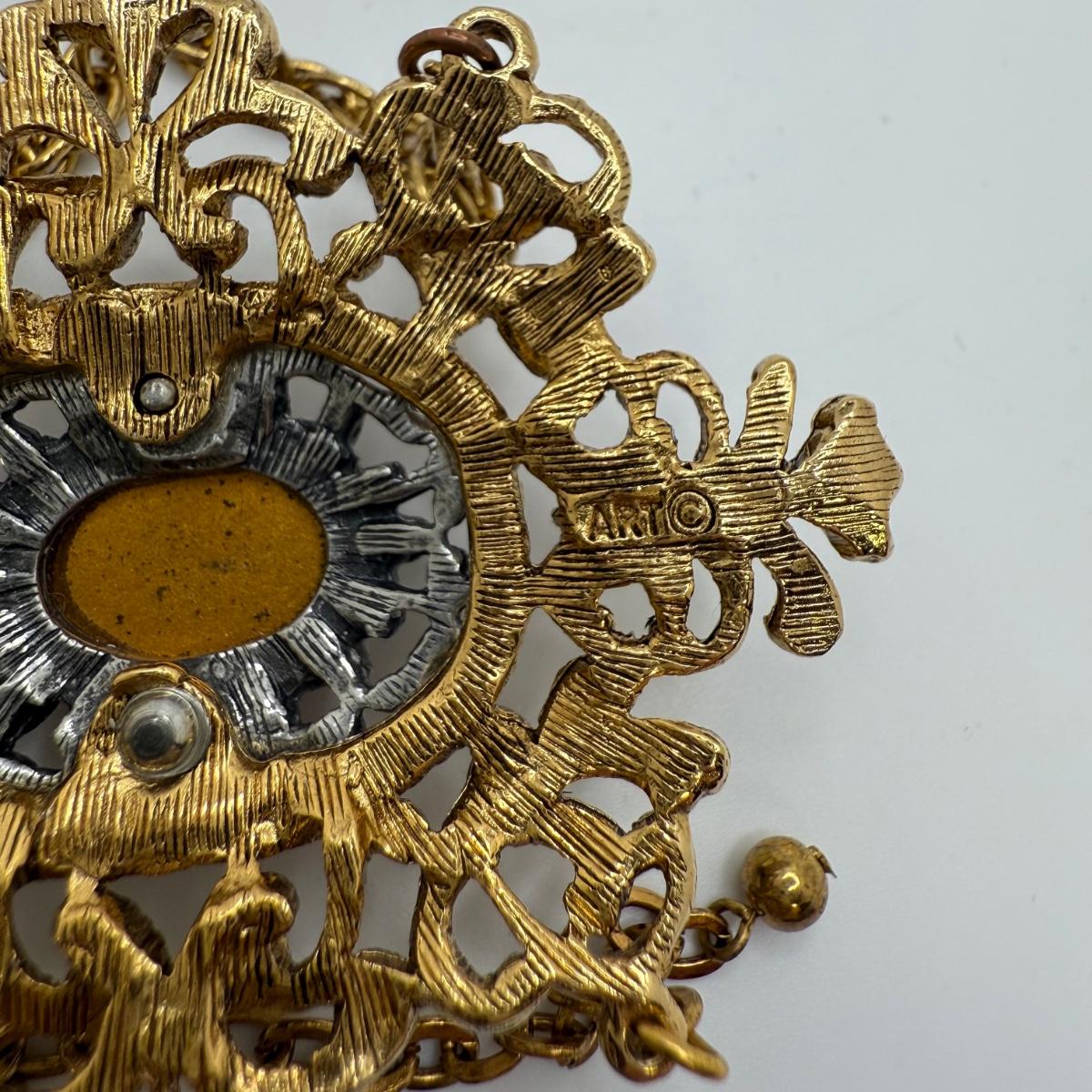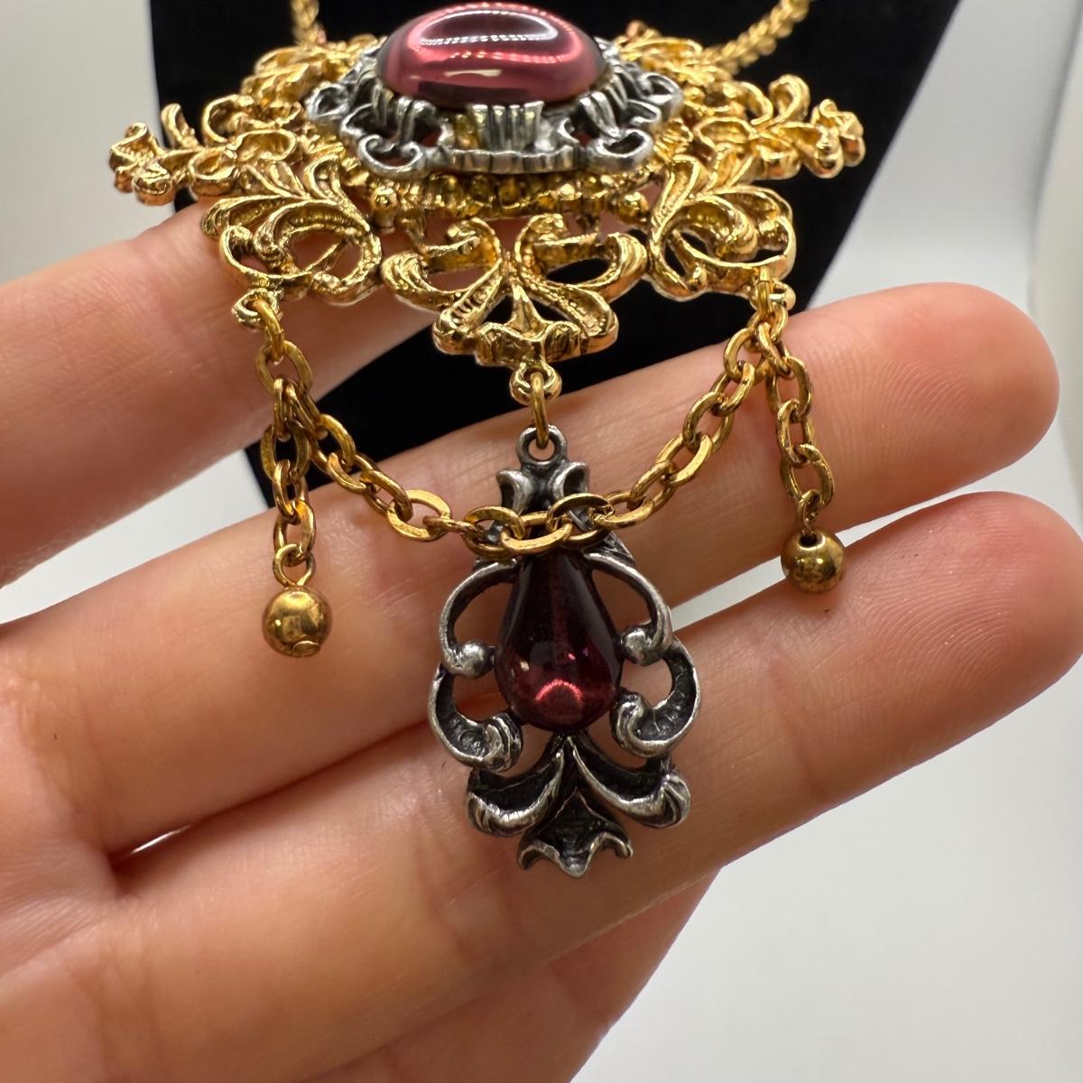 Three gorgeous ornate gold necklaces with two pairs of earrings for pierced ears. Two necklaces have gemstones. Two are double stranded. The single stranded necklace stamped “ART” is adjustable from about 20-23”. The other two necklaces are labeled Trifari and Chloe & Isabel.