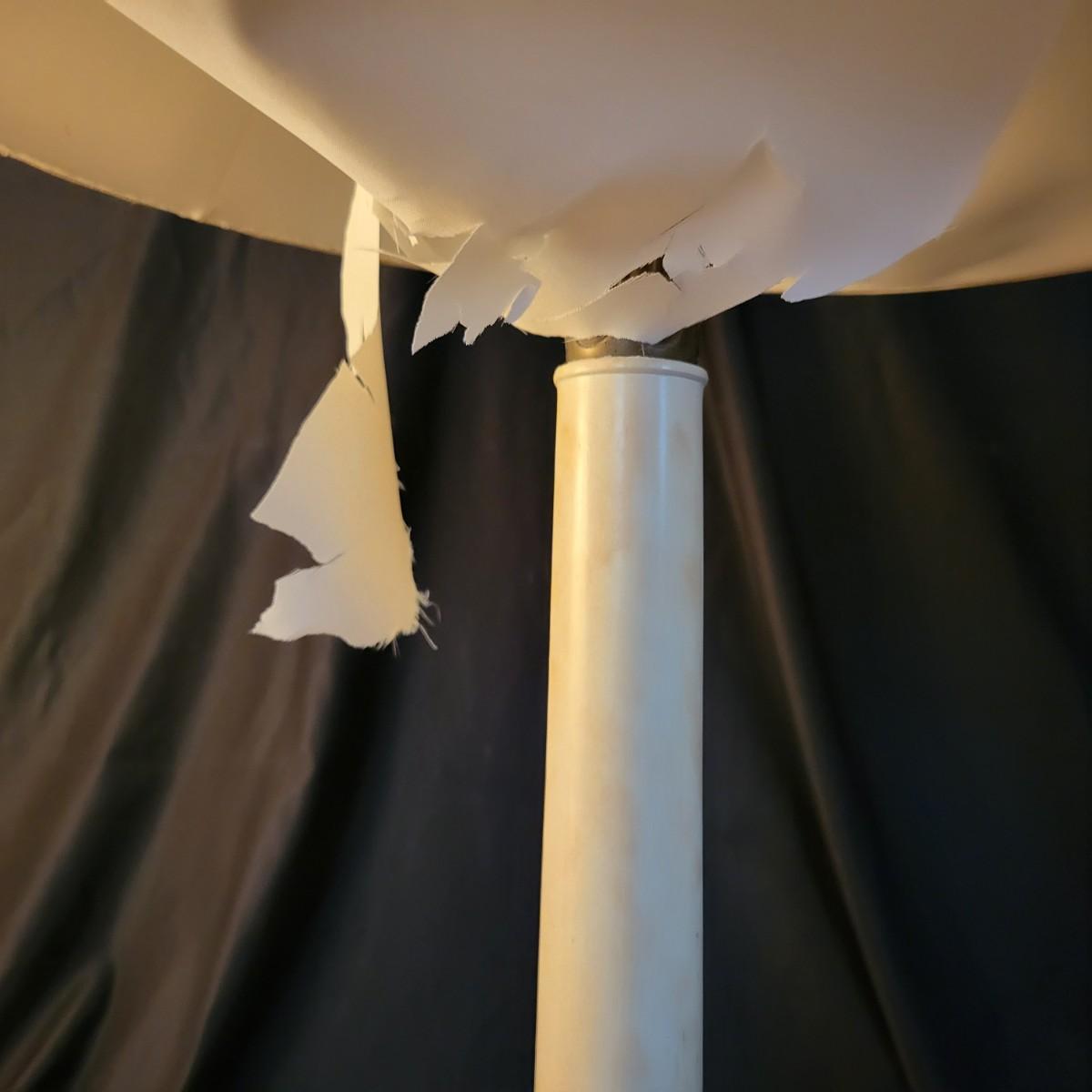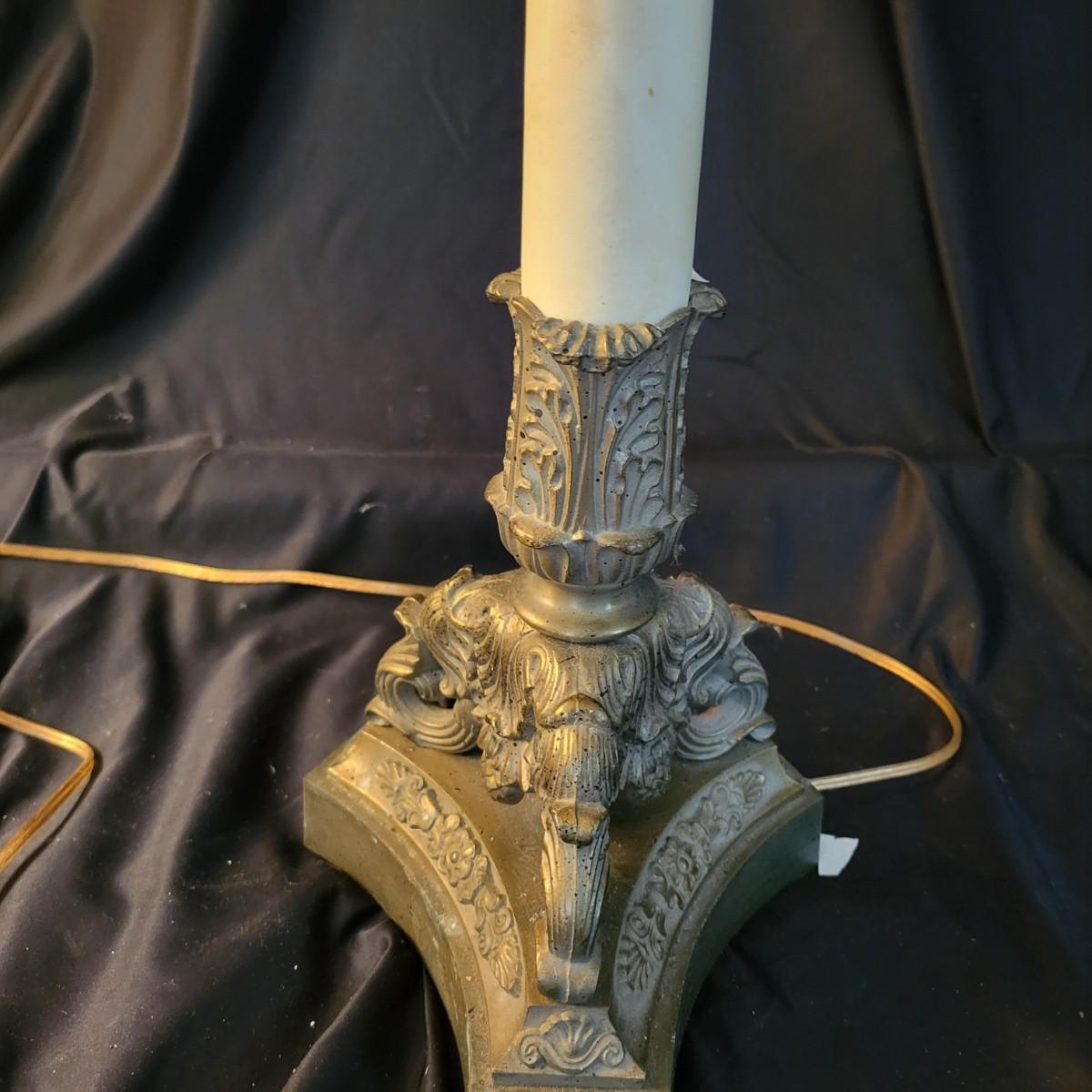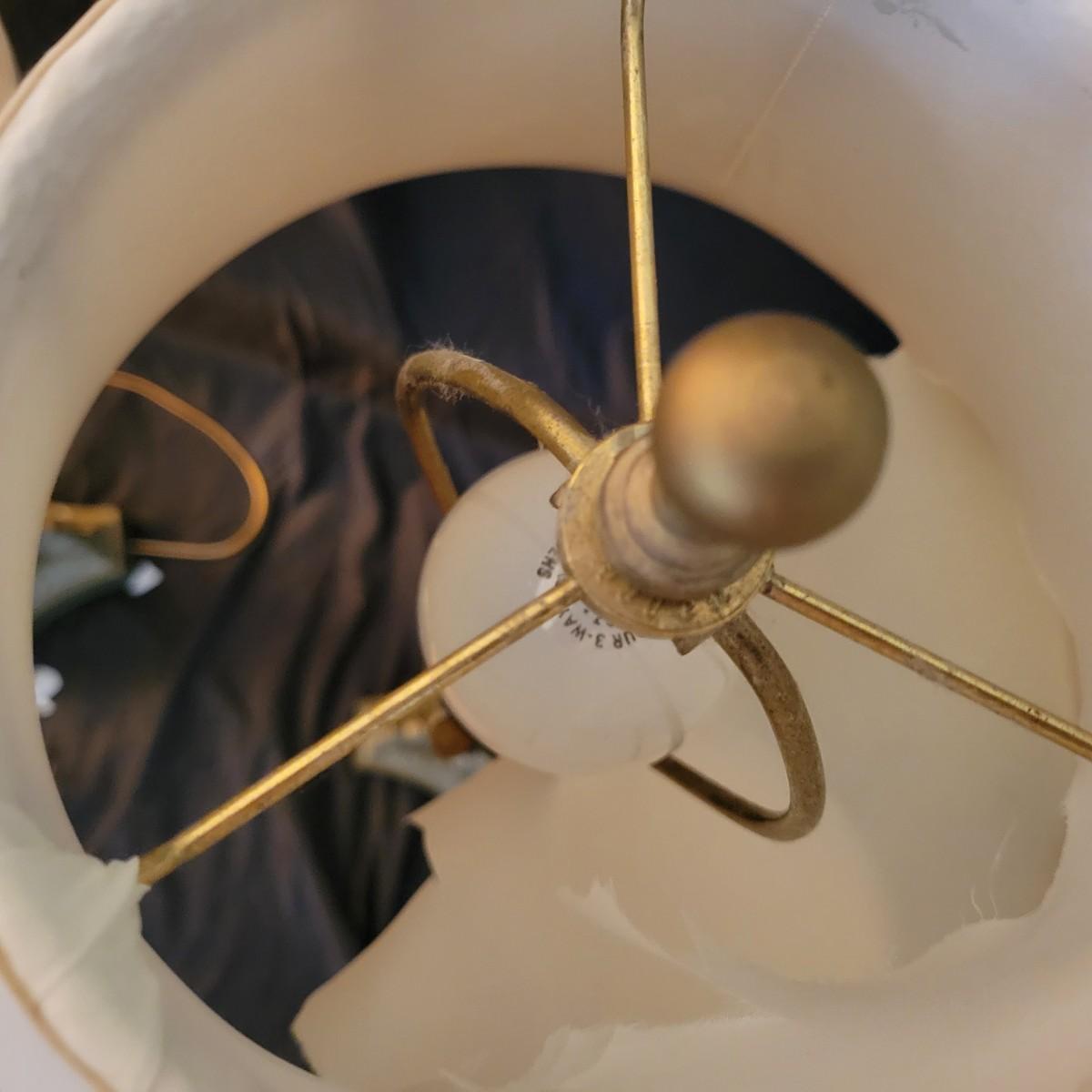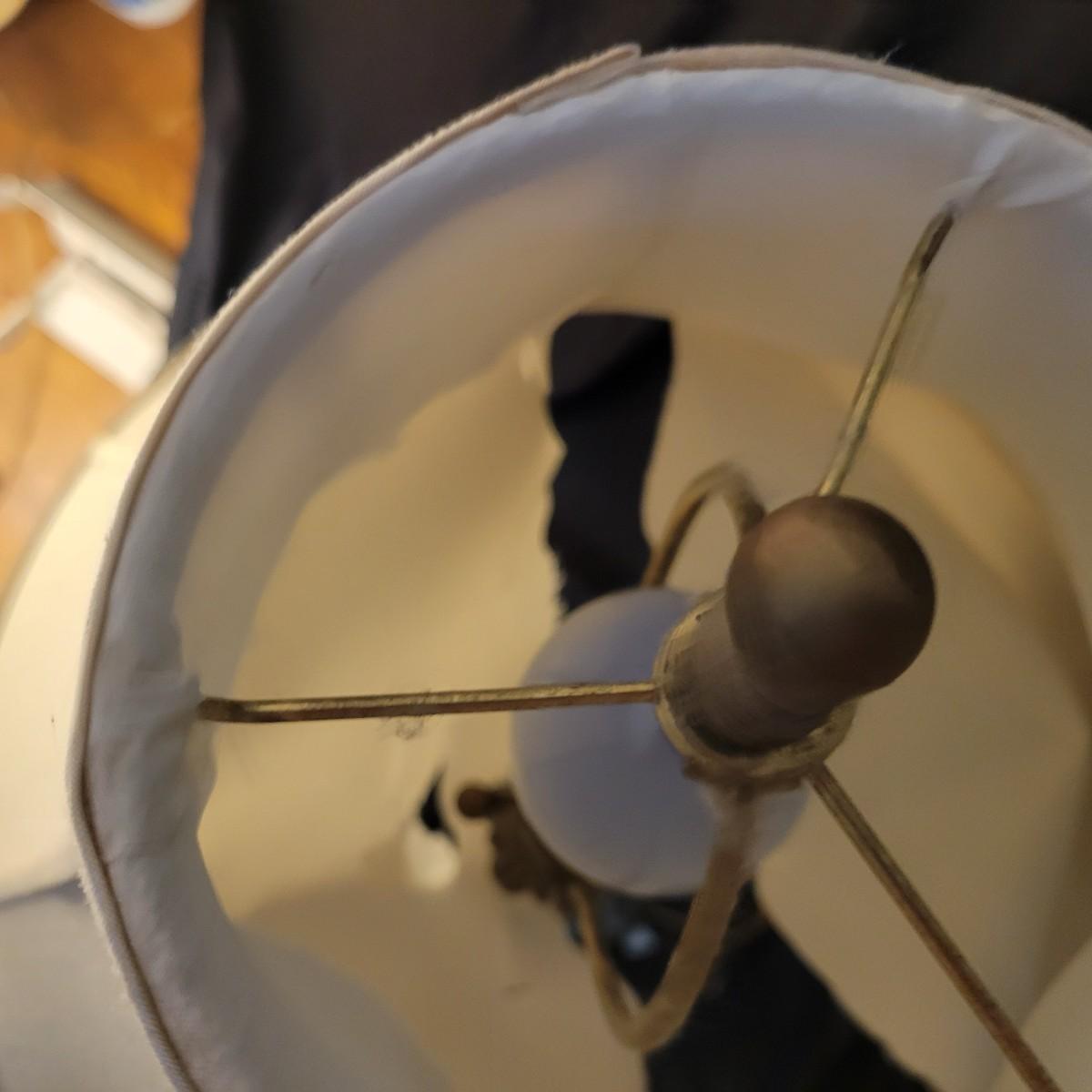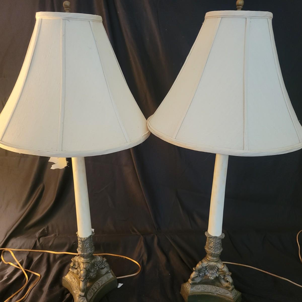 A pair of lamps with metal bases and cream shades. Both lamps were tested and work. Interior of shades is torn. 17"D x 36" tall. Local pickup only