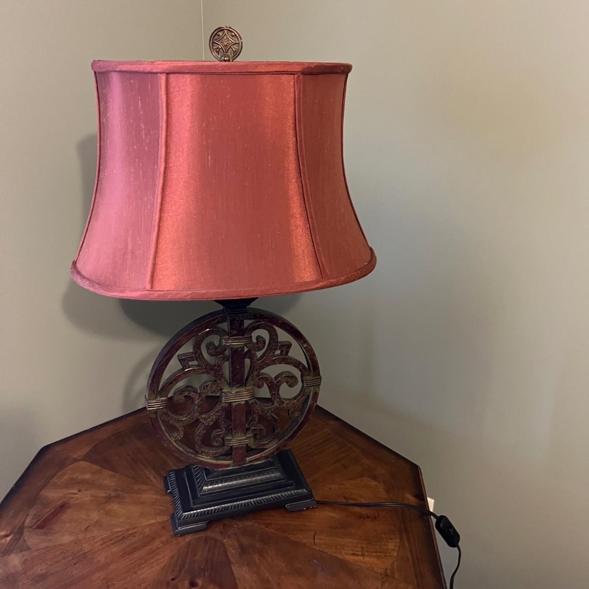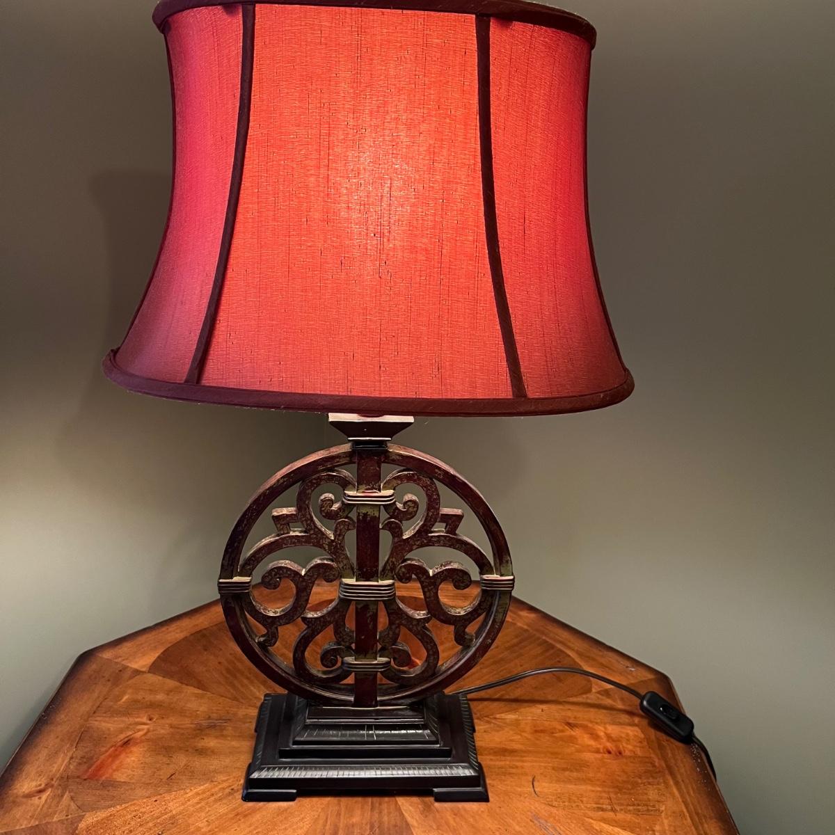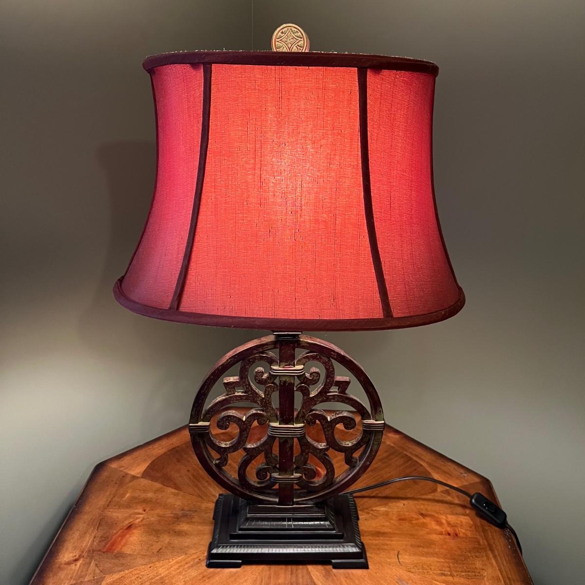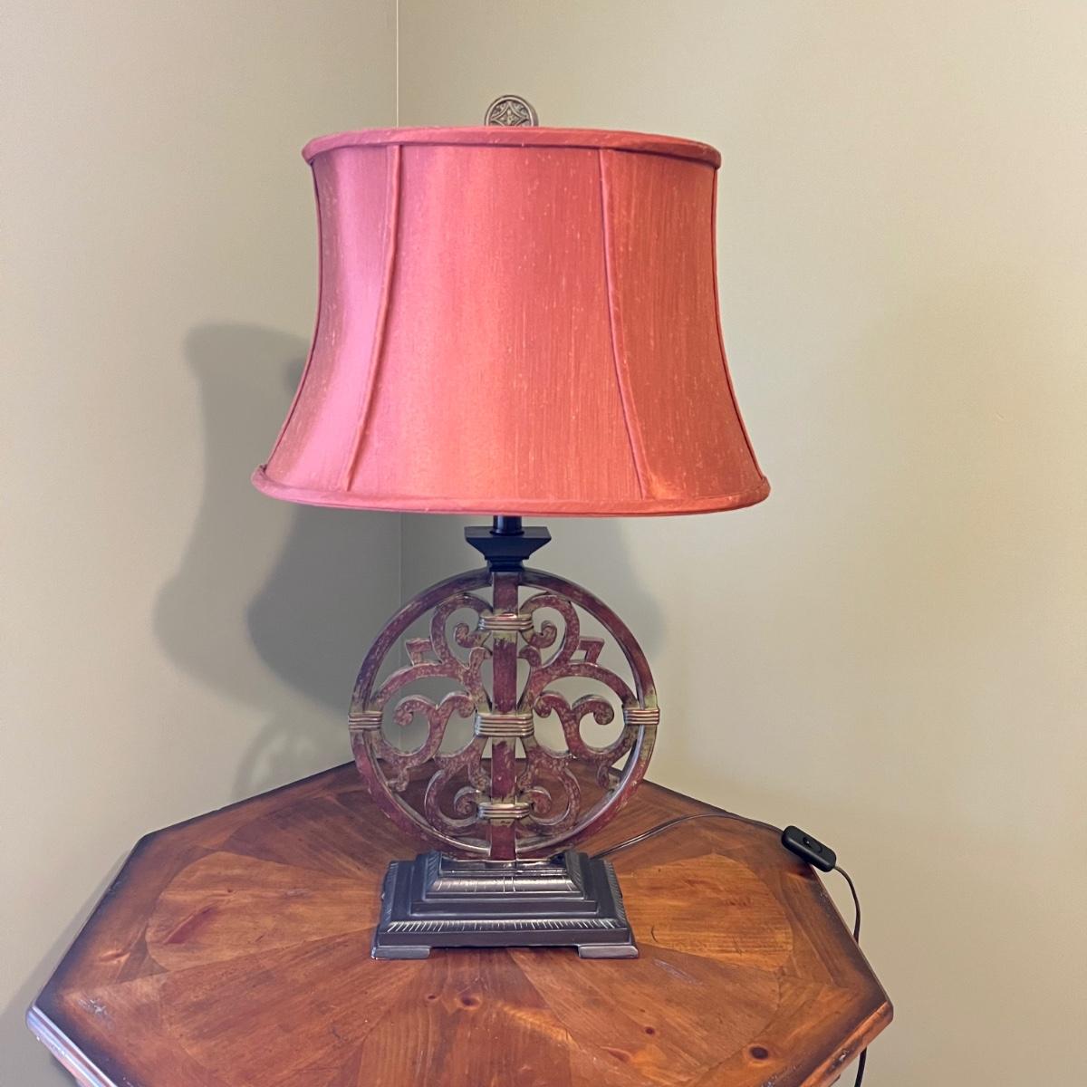 This table lamp is metal, the circle has an antiqued bronze finish and is on a dark brown metal base. It has an in-line on/off switch and a pinkish red shade. Lamp powered on when plugged in.
