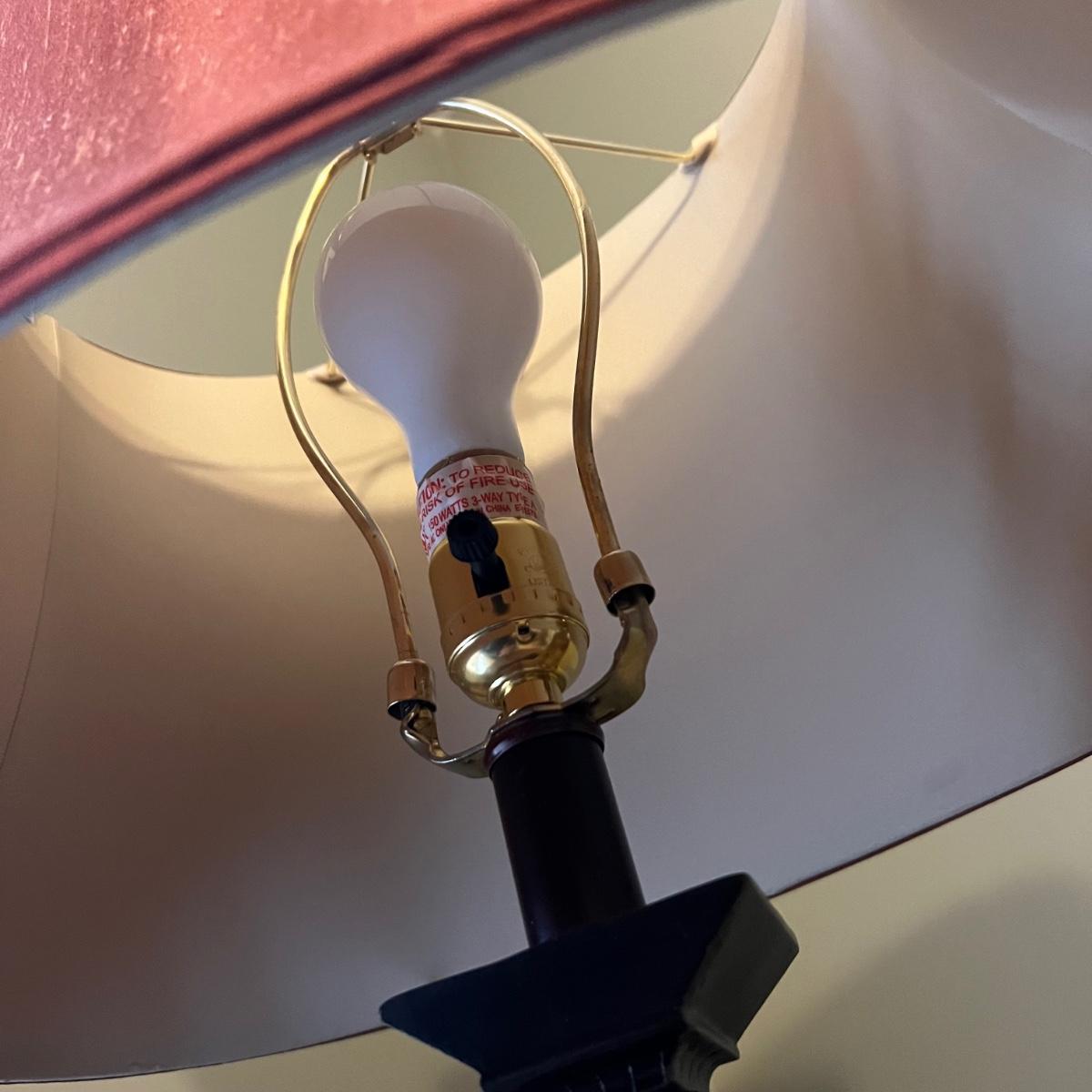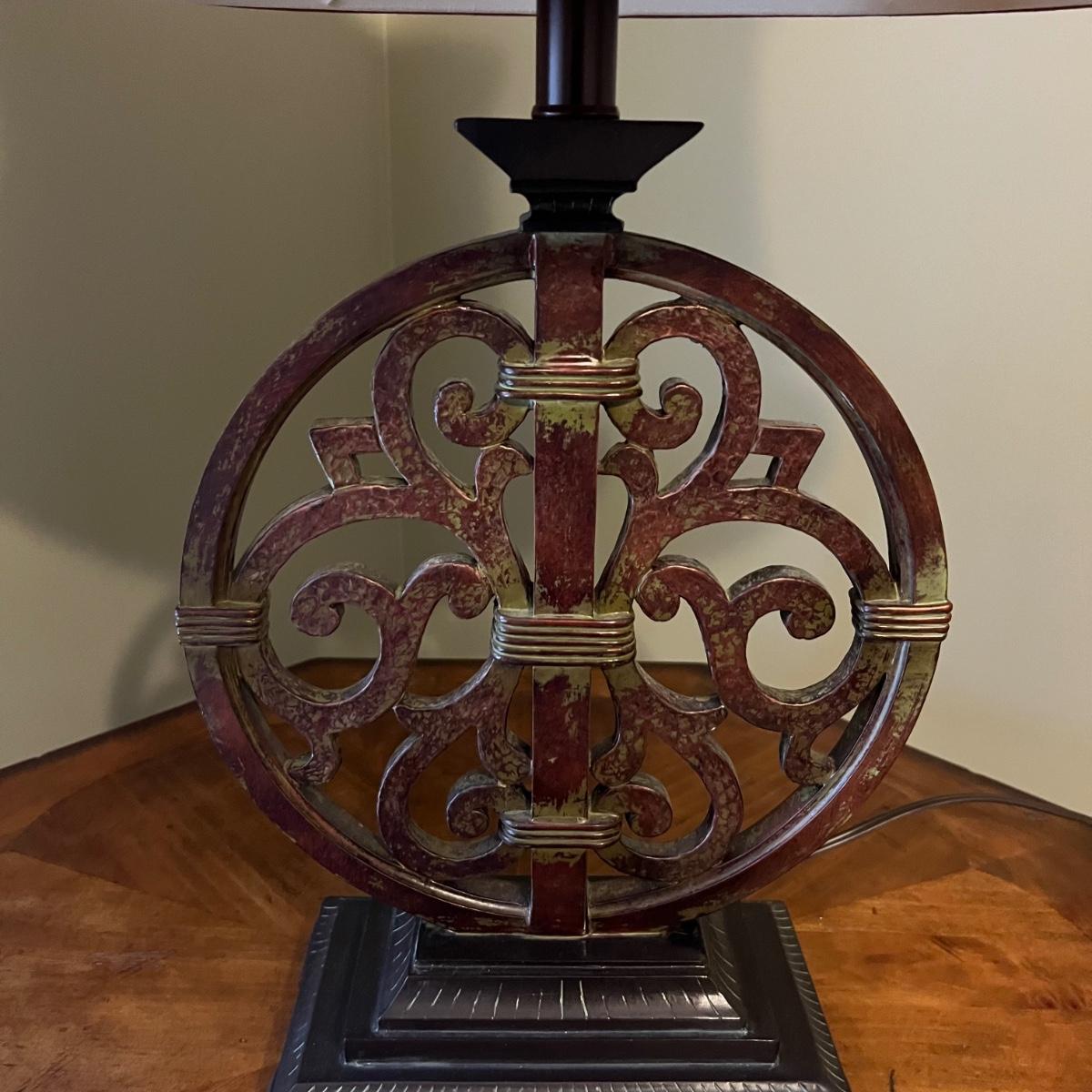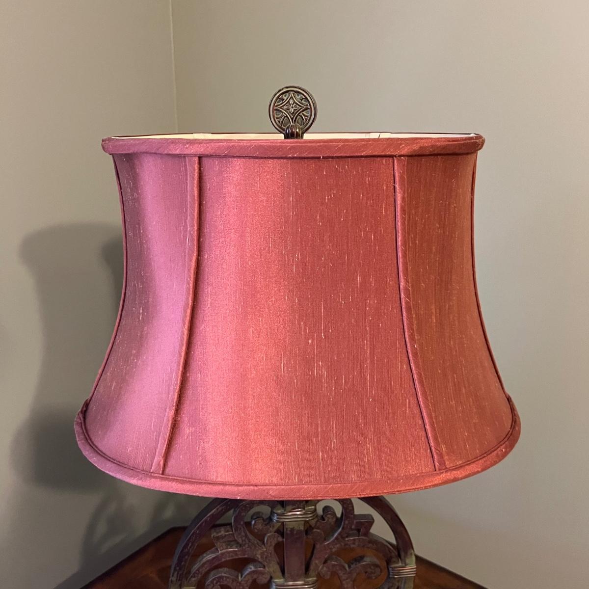 This table lamp is metal, the circle has an antiqued bronze finish and is on a dark brown metal base. It has an in-line on/off switch and a pinkish red shade. Lamp powered on when plugged in.