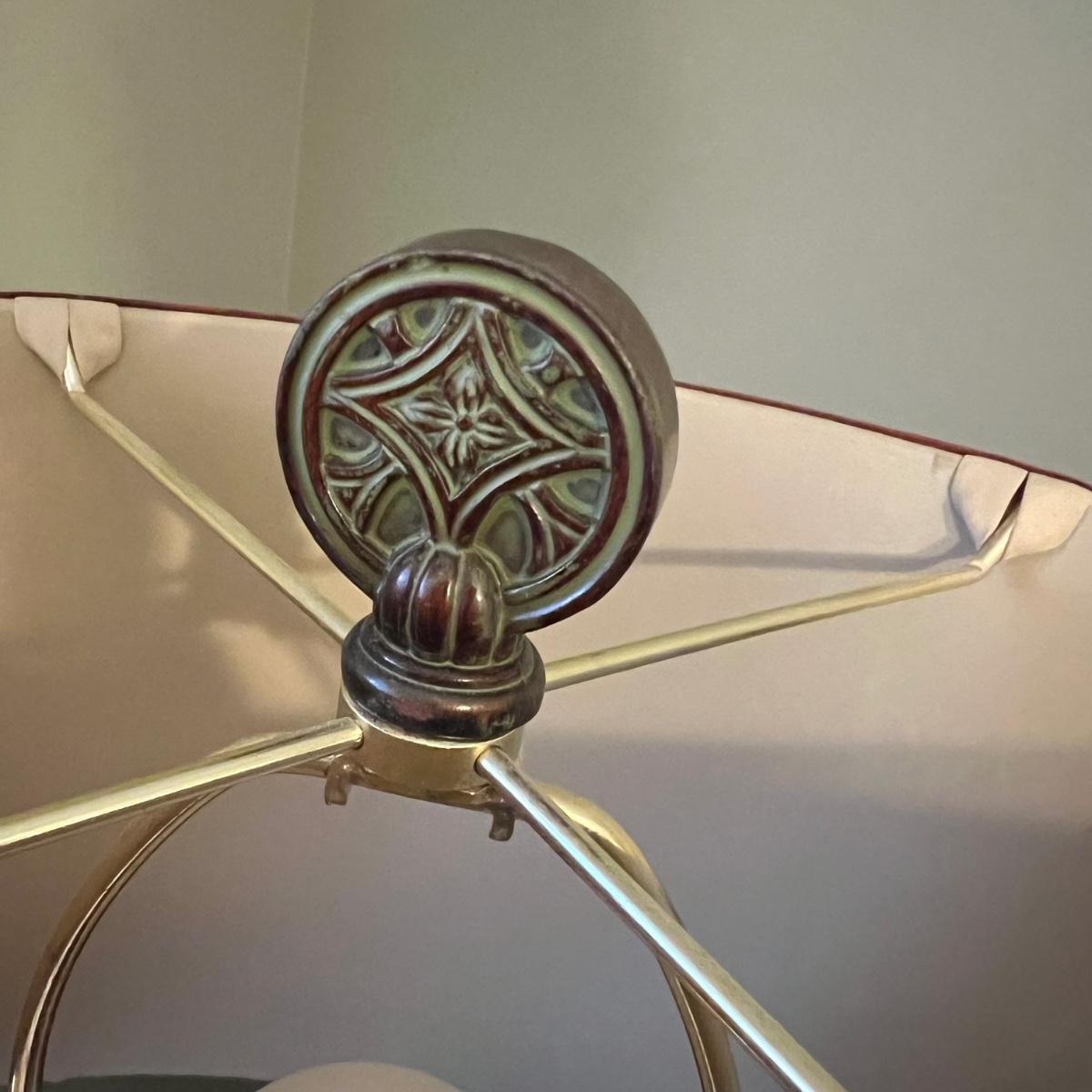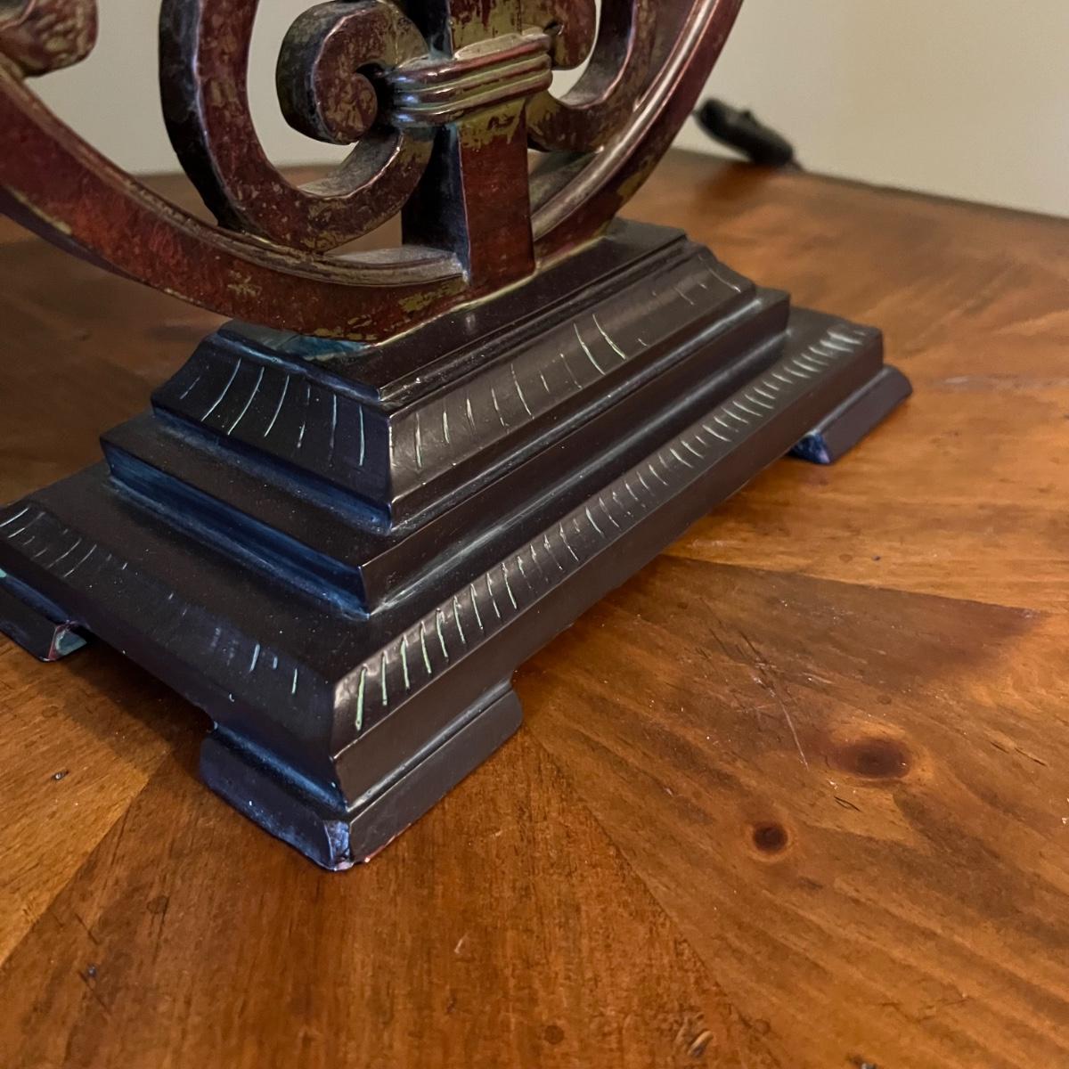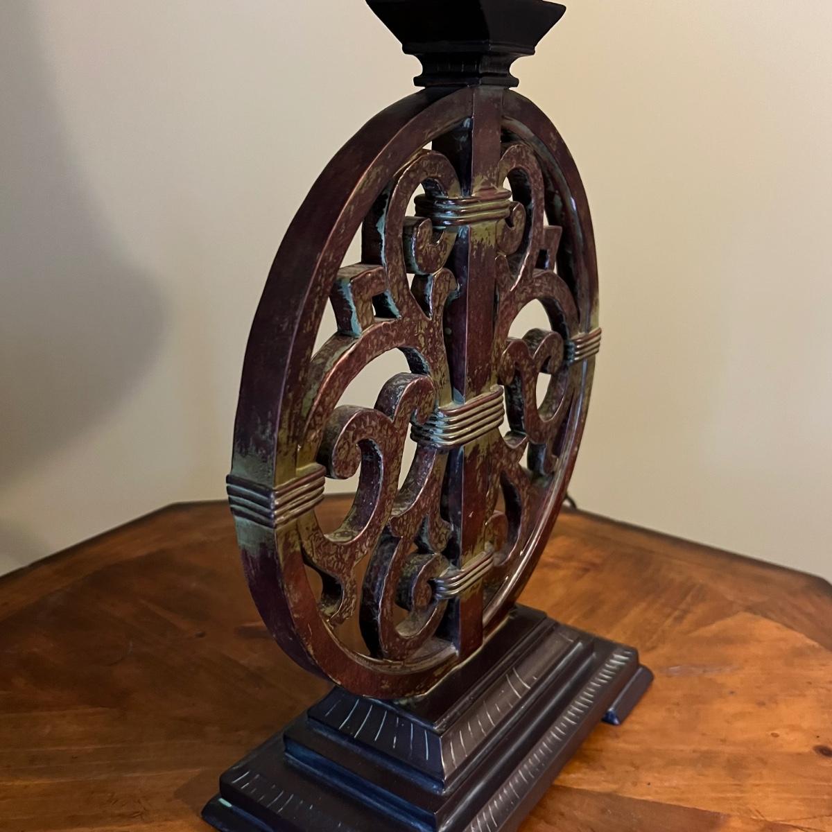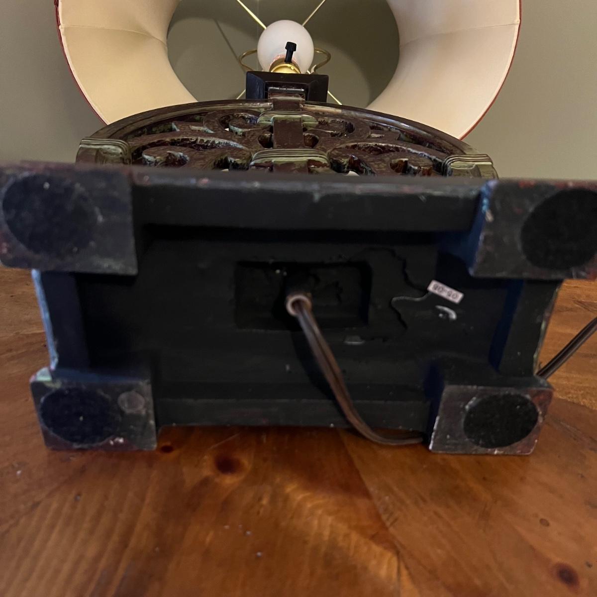 This table lamp is metal, the circle has an antiqued bronze finish and is on a dark brown metal base. It has an in-line on/off switch and a pinkish red shade. Lamp powered on when plugged in.