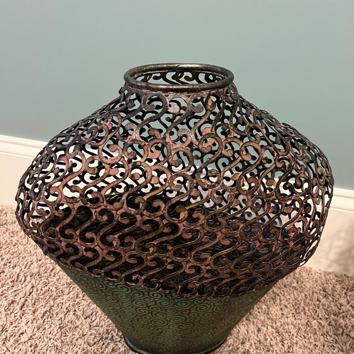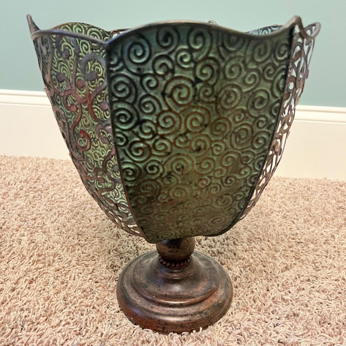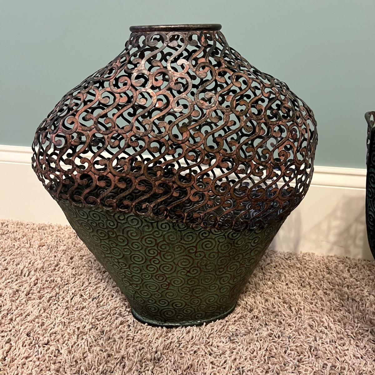 A pair of metal vases or planters. Both have green metal mixed with a filigree style lace like metal sections. The taller piece measures 16” (widest point) x 5” x 17”H.