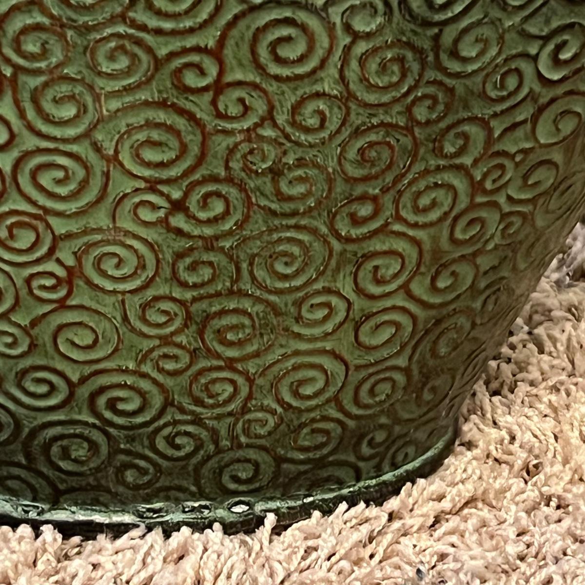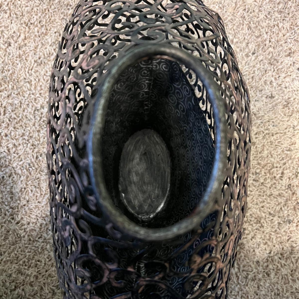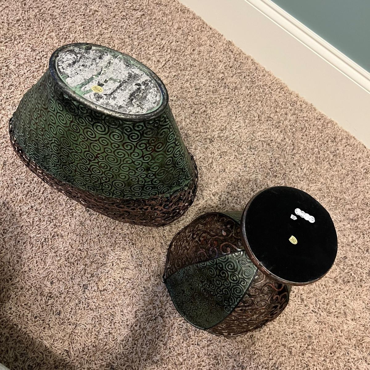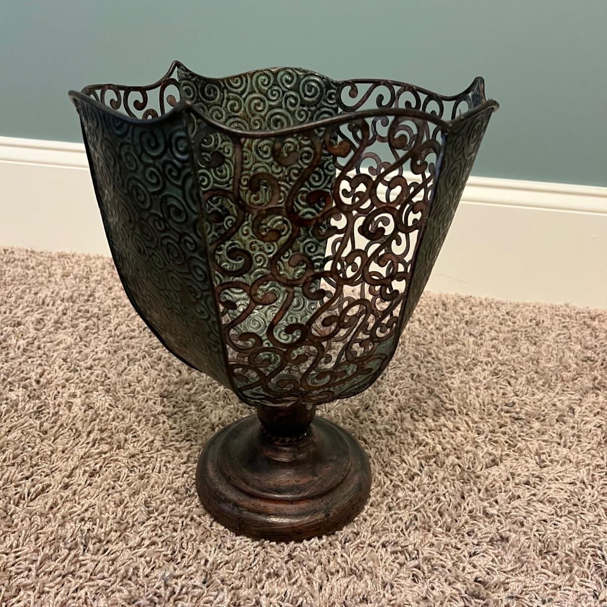 A pair of metal vases or planters. Both have green metal mixed with a filigree style lace like metal sections. The taller piece measures 16” (widest point) x 5” x 17”H.