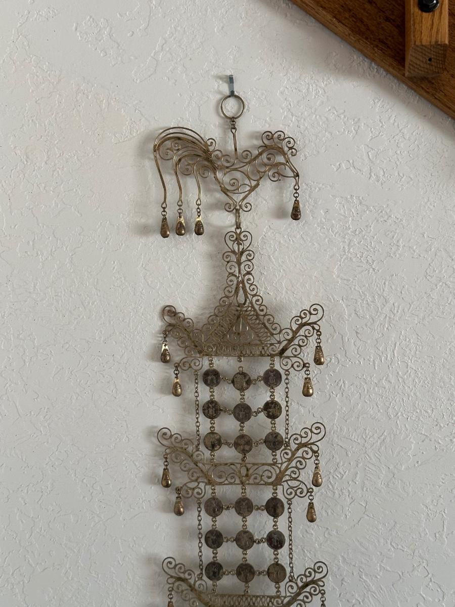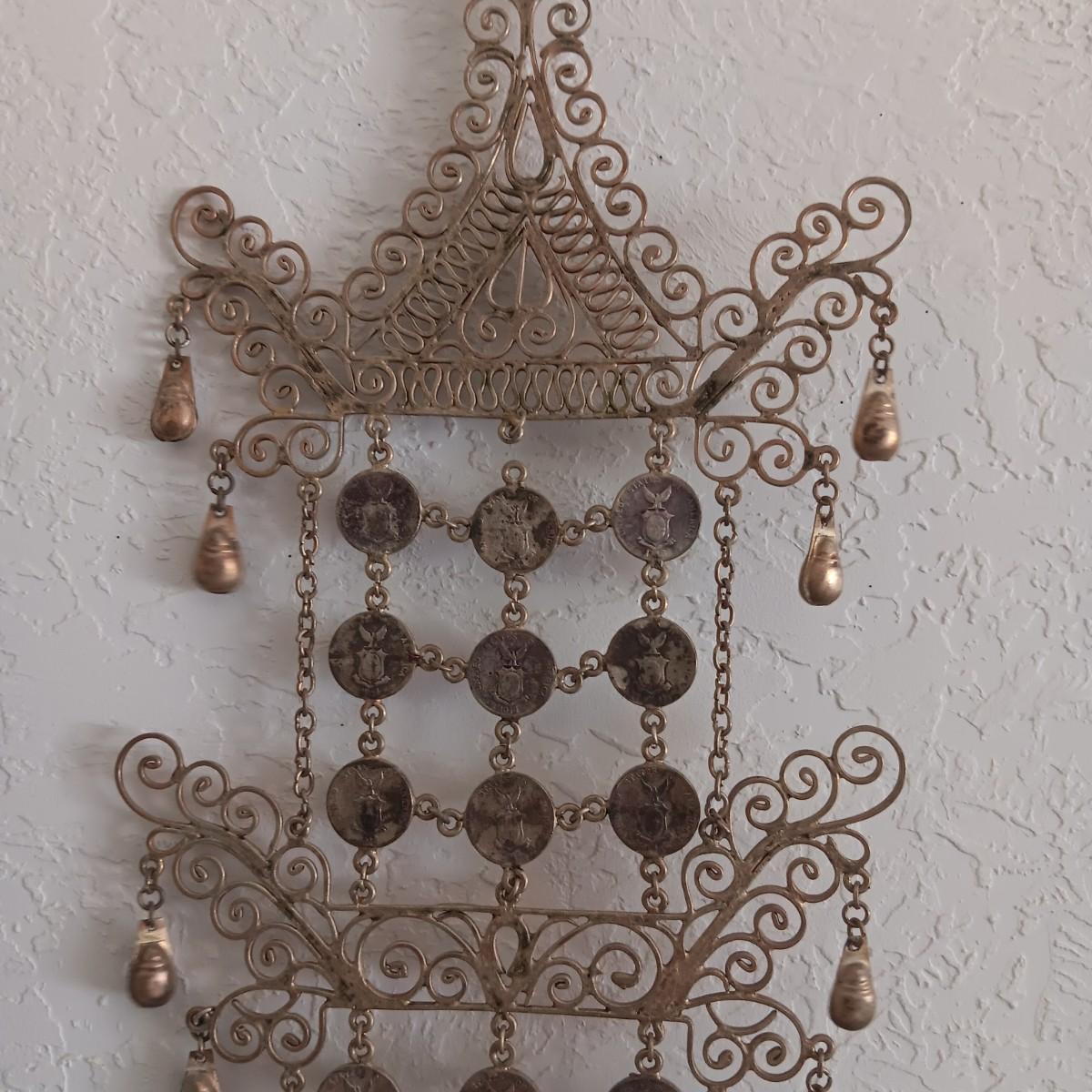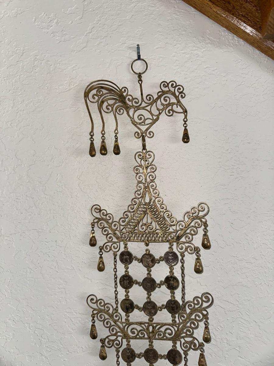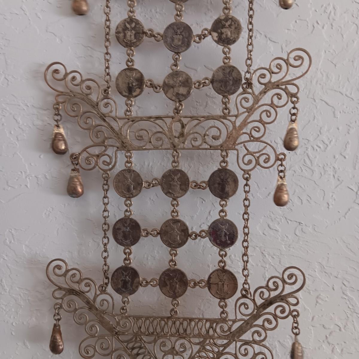 ORNATE METAL WALL ART FROM THE PHILIPPINES AND WOODEN STACKING STOOLS WITH WOVEN TOPS