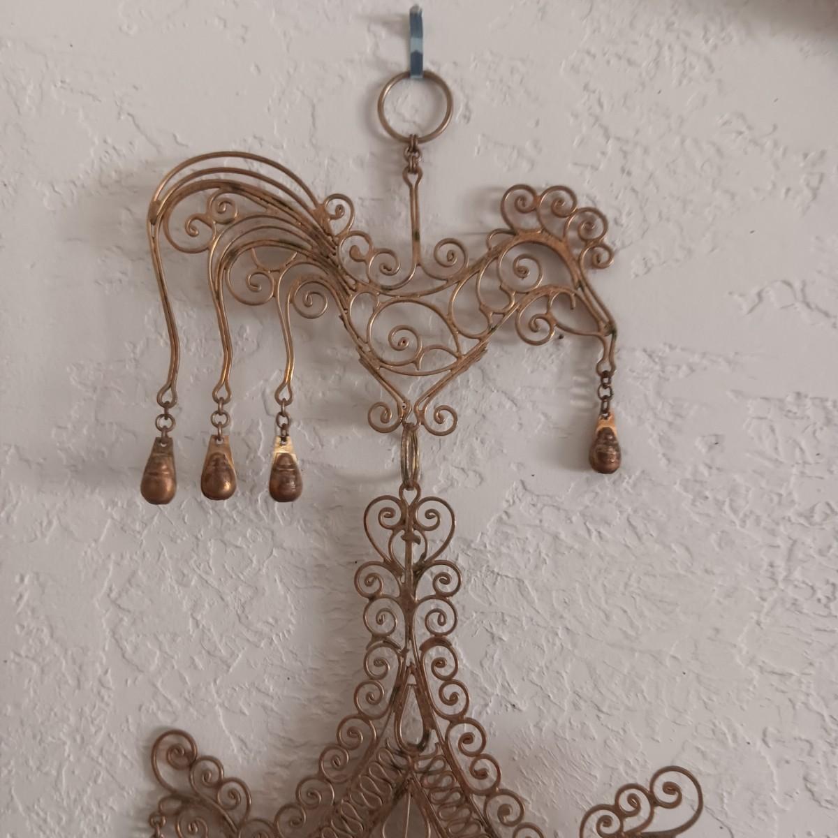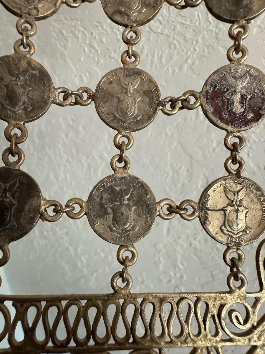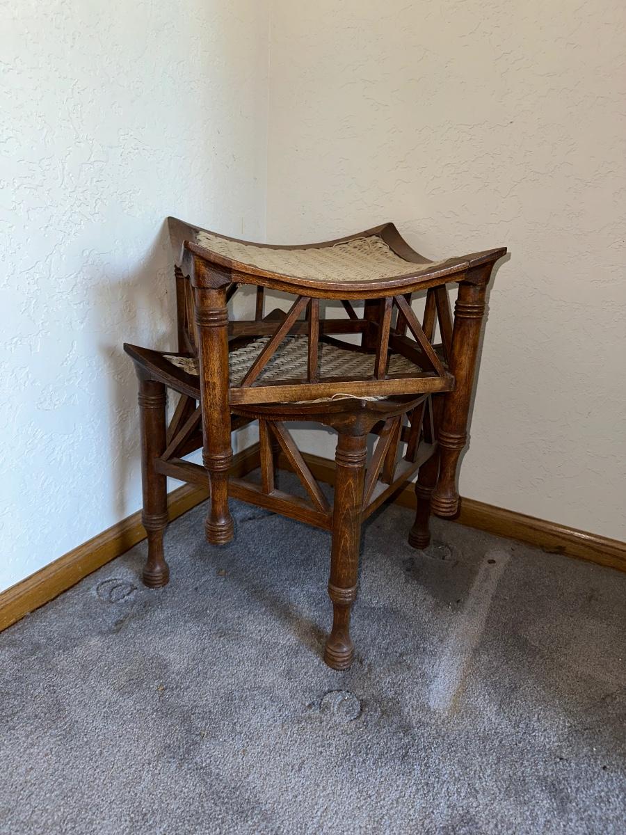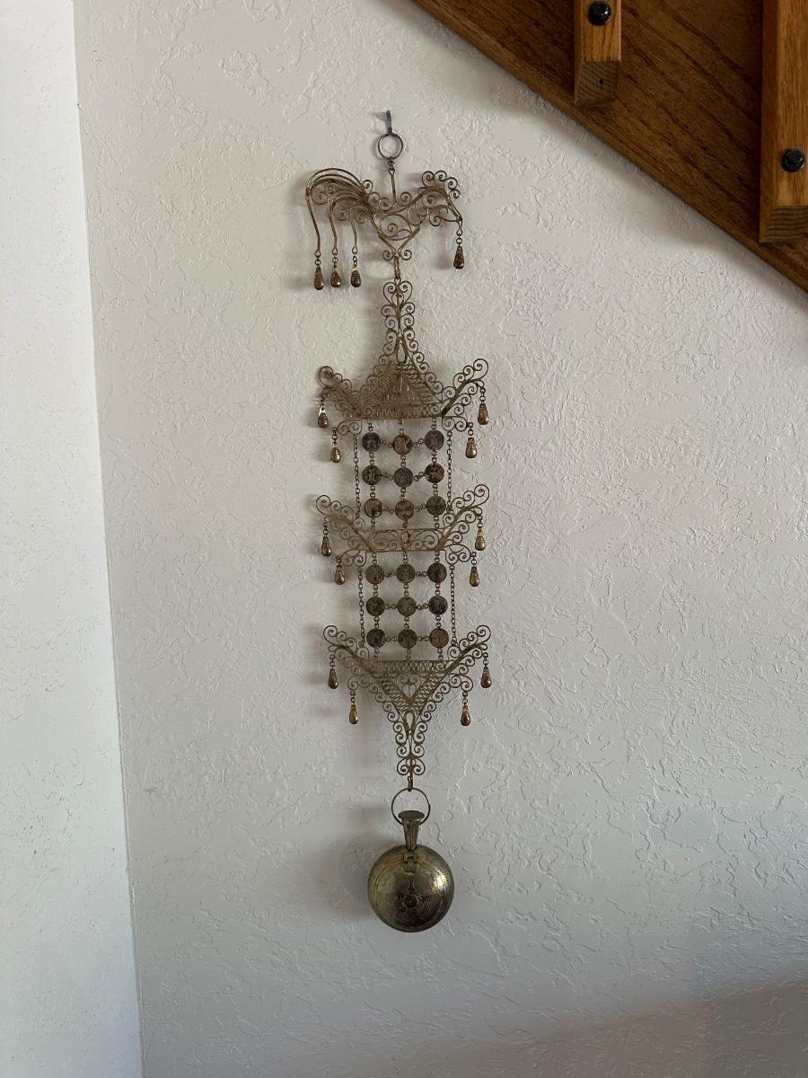 ORNATE METAL WALL ART FROM THE PHILIPPINES AND WOODEN STACKING STOOLS WITH WOVEN TOPS
