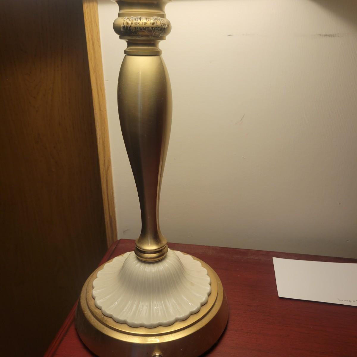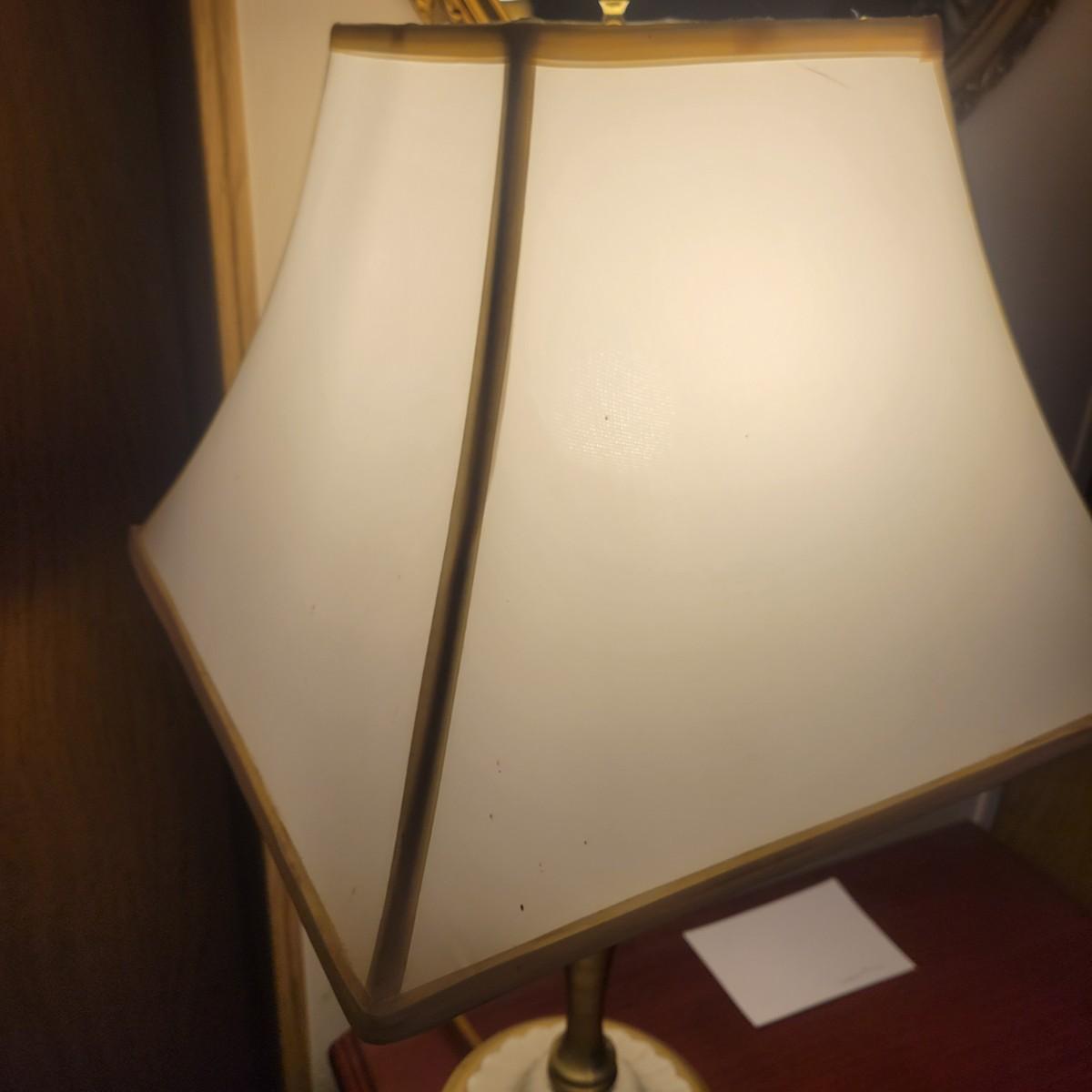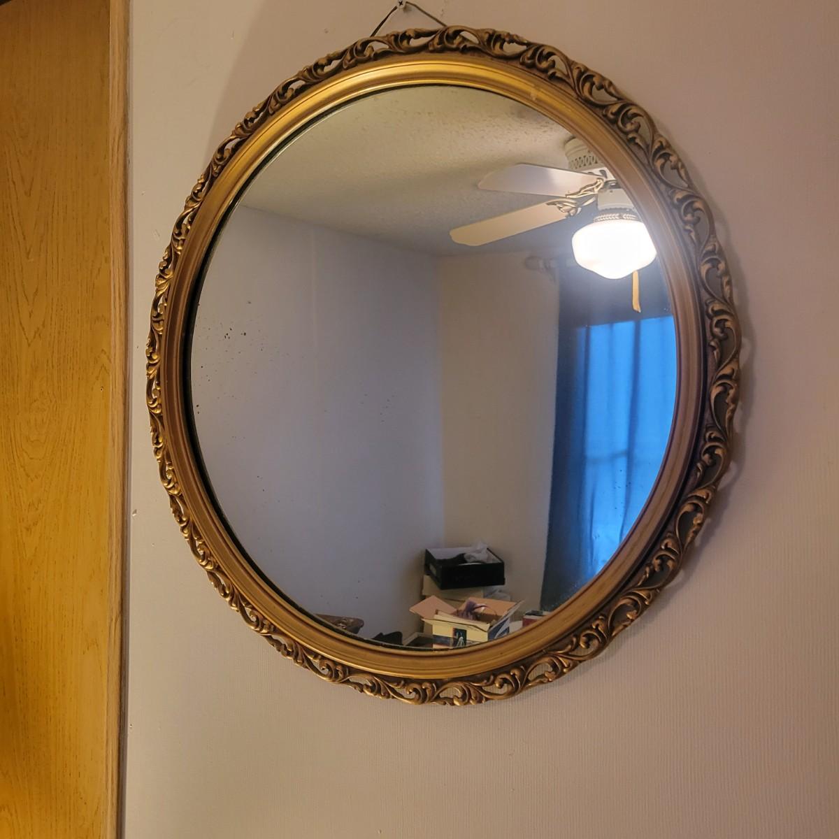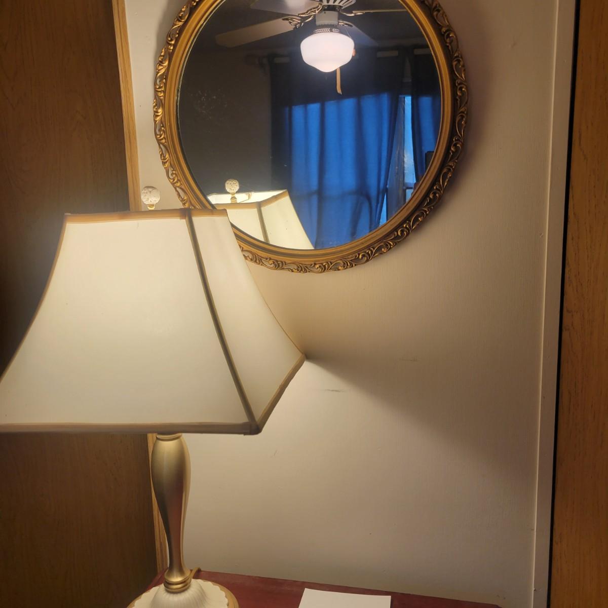 An ornate gold framed mirror in good condition, mirror does black flecks showing from the back of the mirror. Measures approximately 20.5". Lamp in is good condition with no notable damage. Lamp is metal with a porcelain and metal base. Shade is also in good condition. Measures approximately 15" x 29". Local pickup only