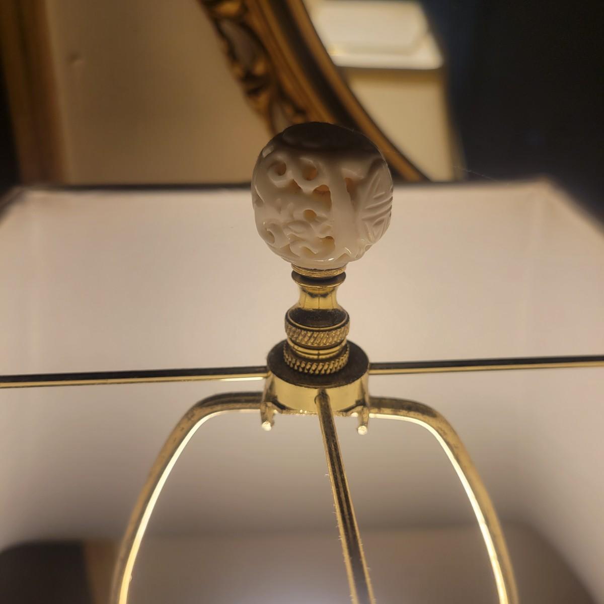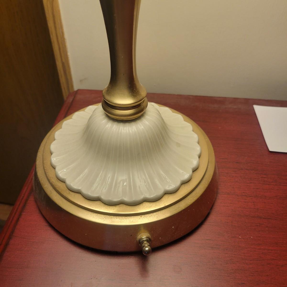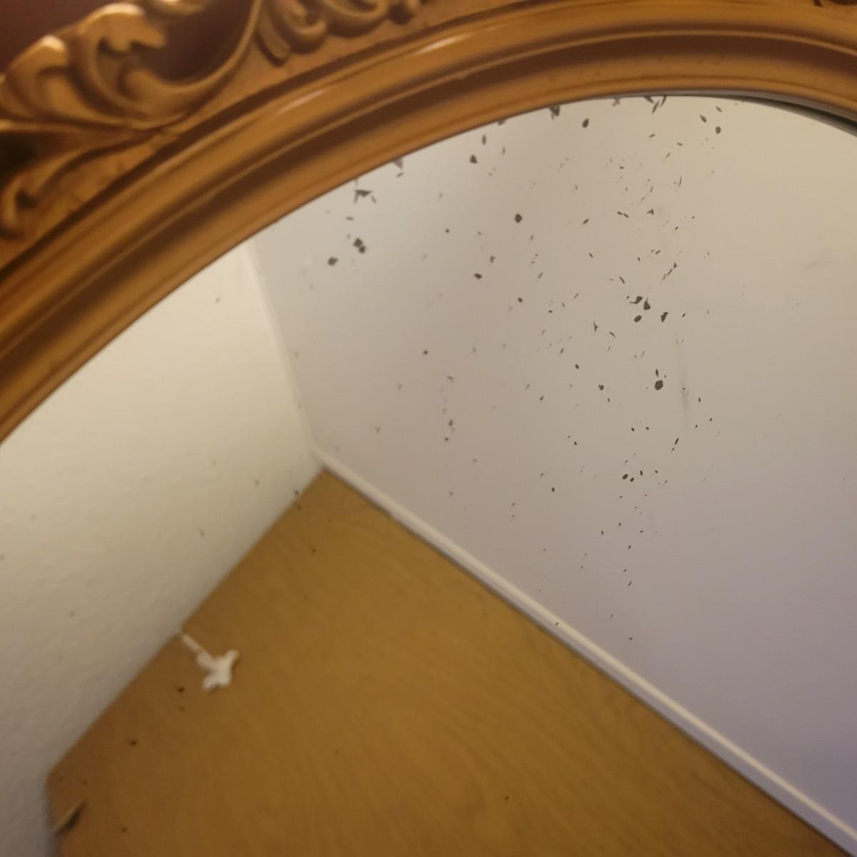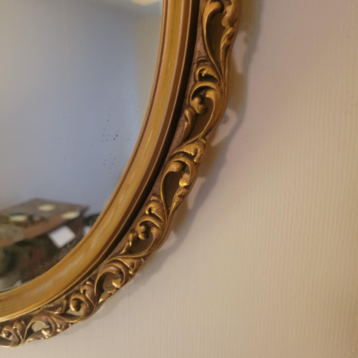 An ornate gold framed mirror in good condition, mirror does black flecks showing from the back of the mirror. Measures approximately 20.5". Lamp in is good condition with no notable damage. Lamp is metal with a porcelain and metal base. Shade is also in good condition. Measures approximately 15" x 29". Local pickup only