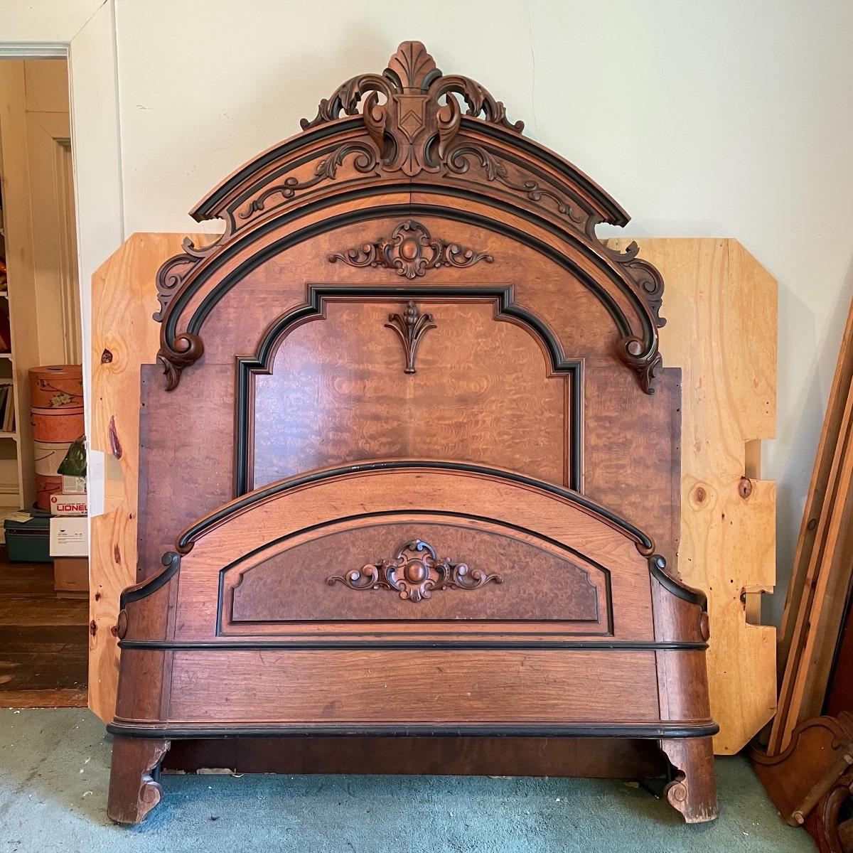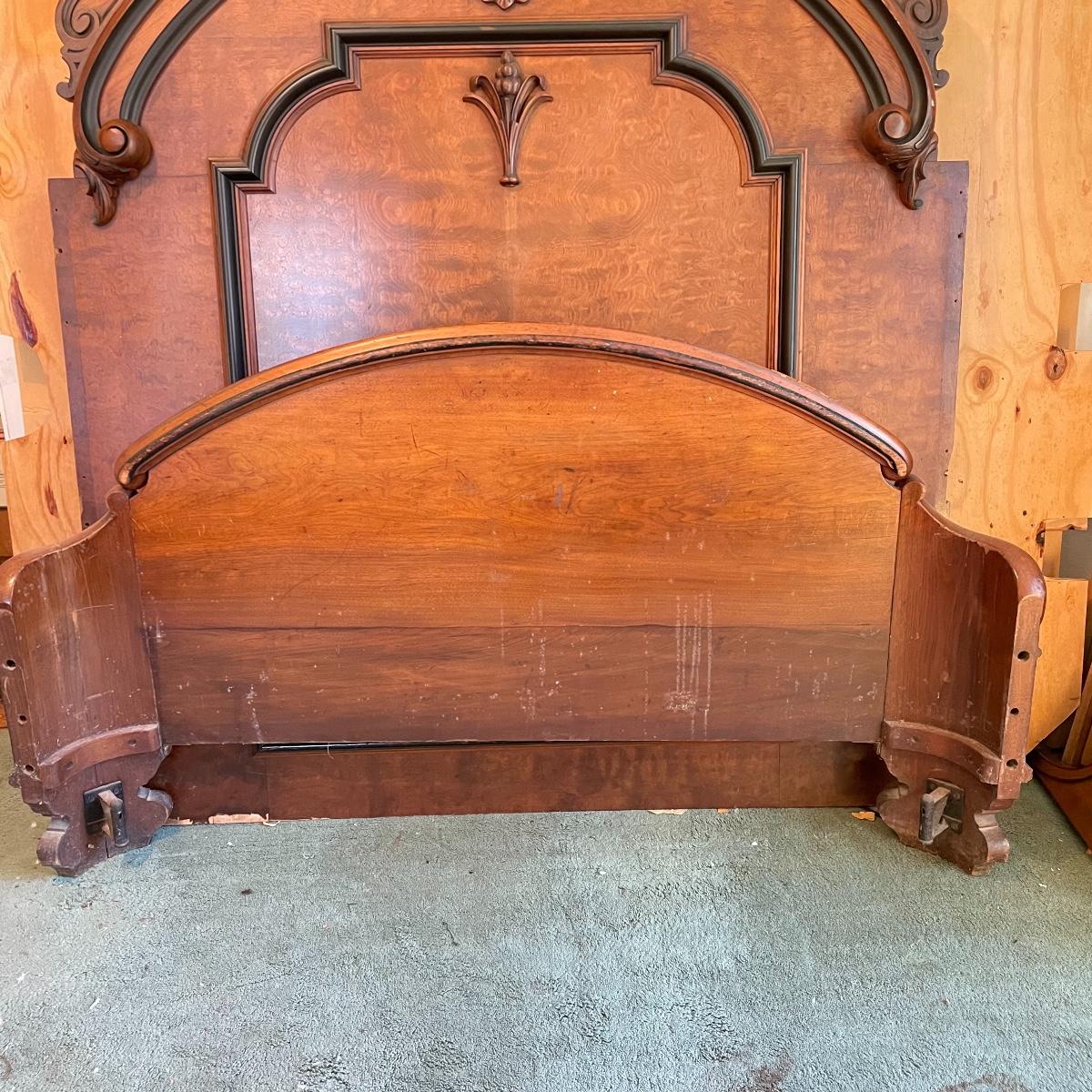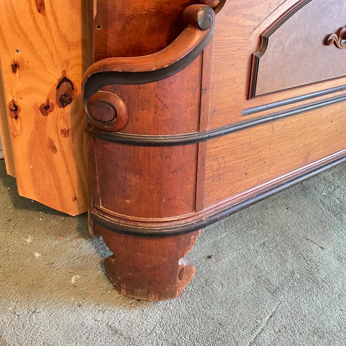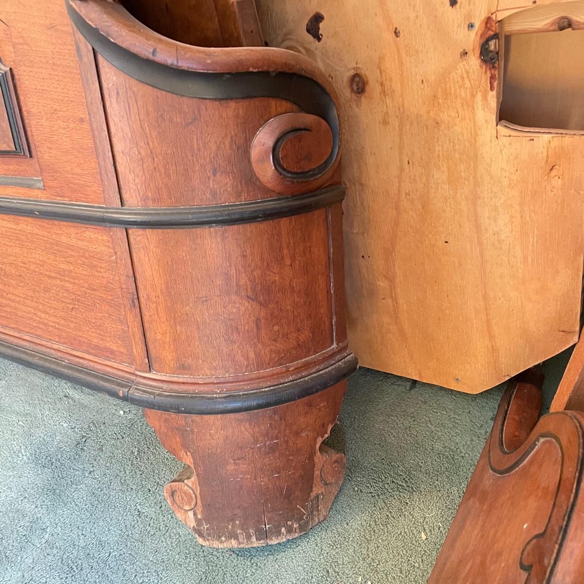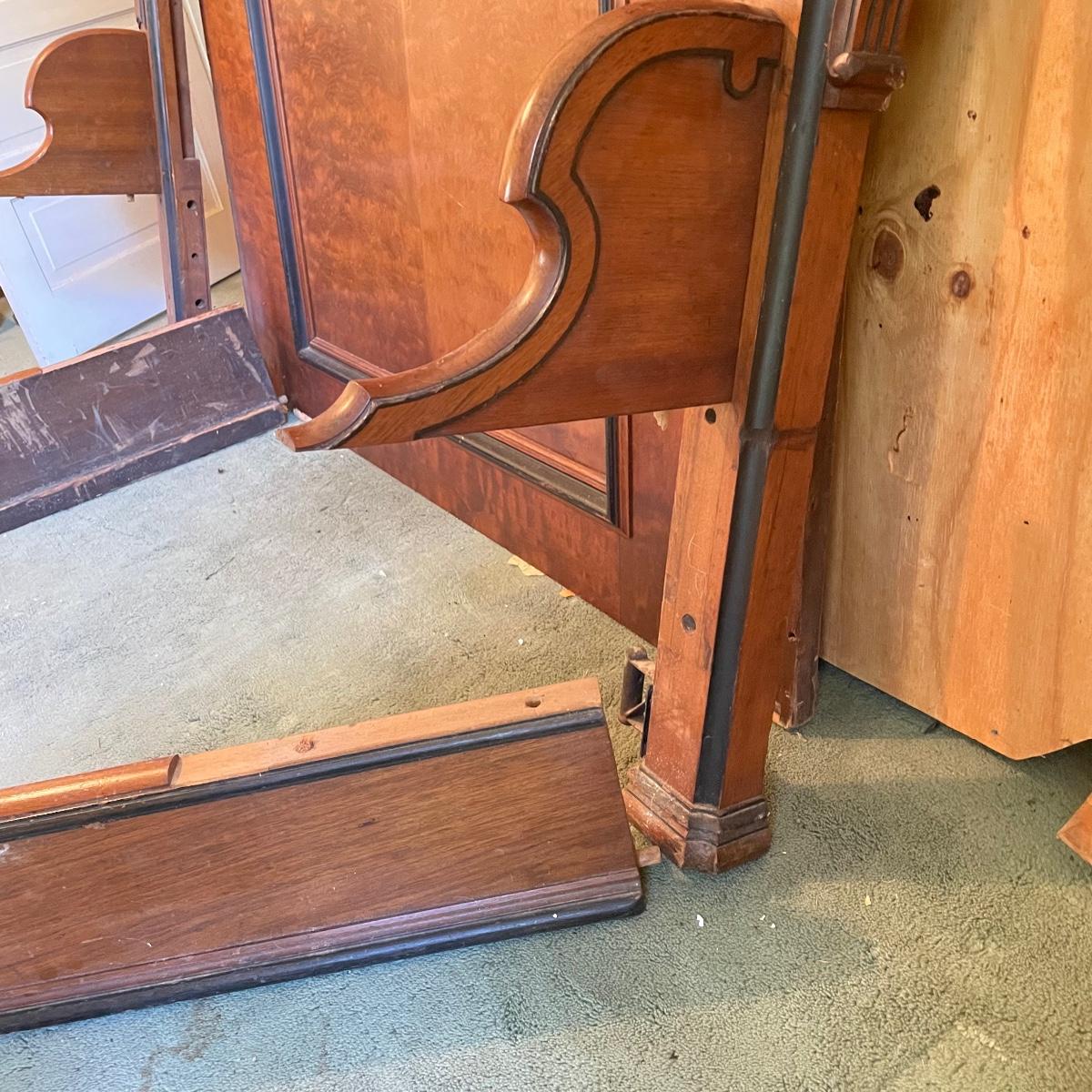 Stunning carved antique bed belonging to the Trapp family for multiple generations with a matching dresser in Lot 247. Headboard will attach to side pieces 23” off the ground, making the total height approximately 104” tall and approximately 77” wide. Note: the sides of the headboard will sit lower when assembled, Bed is not shown fully assembled in images. The footboard 65” x 40”, holding just under a 60”wide mattress. The side rails are 72.75” long. Some dowel attachments have broken or need replaced along with a few other areas noted in photos. Pieces include four feet w/screws, two large headboard edges along with two smaller accents, two side rails, four bed slats, and Headboard/footboard. See images. Local pick up only. Please bring help to load, bed is located upstairs. Mattress will likely need to be custom made to fit.
