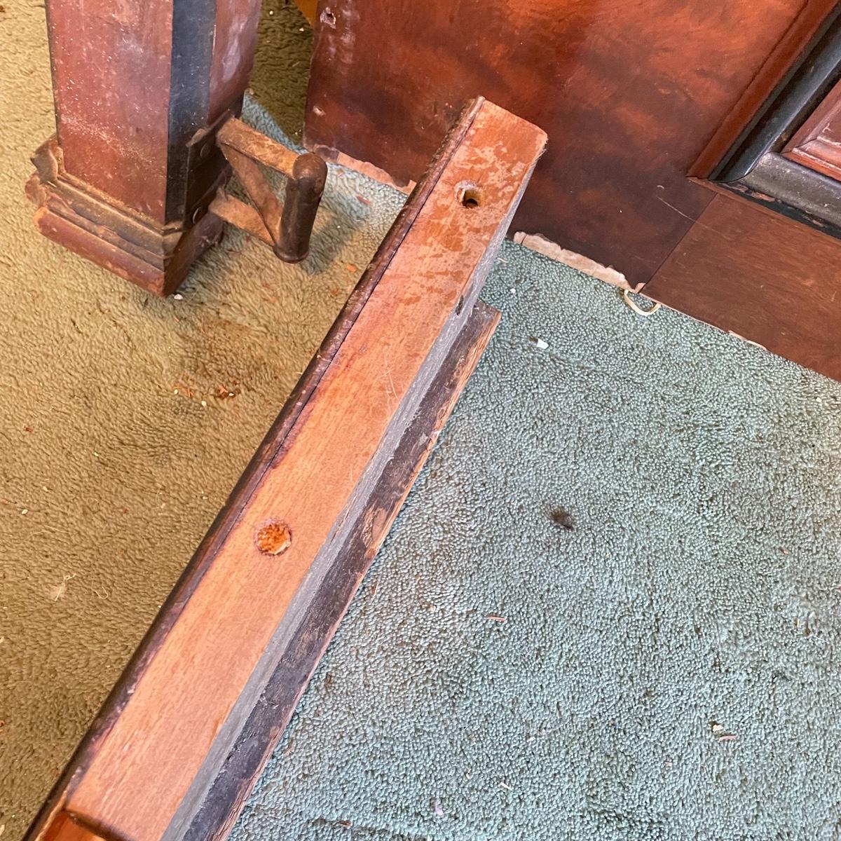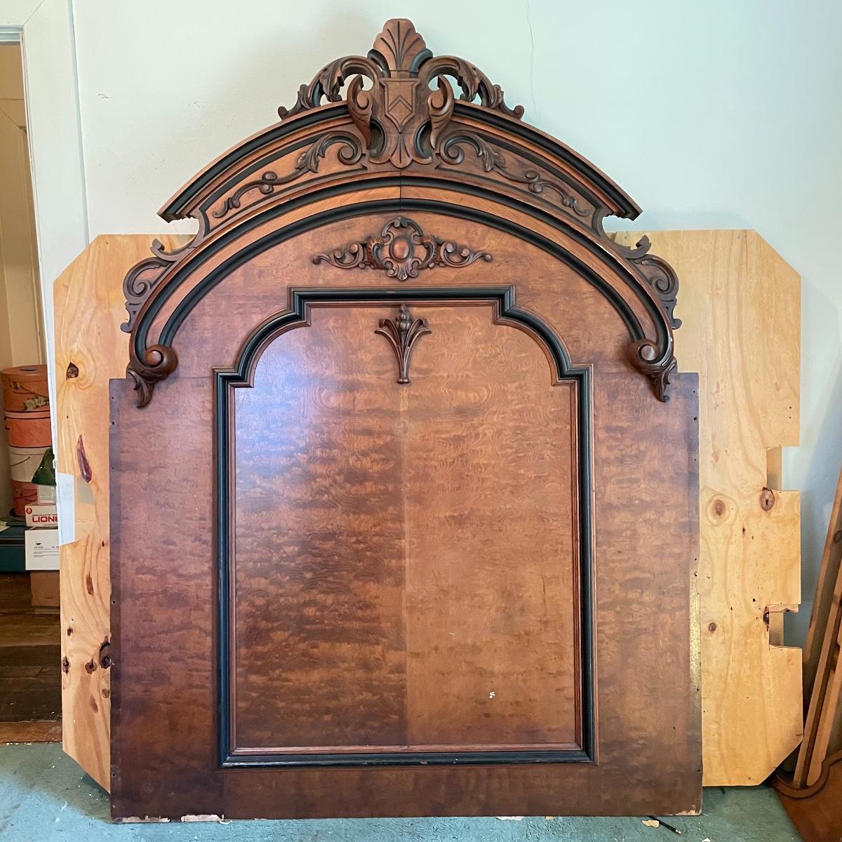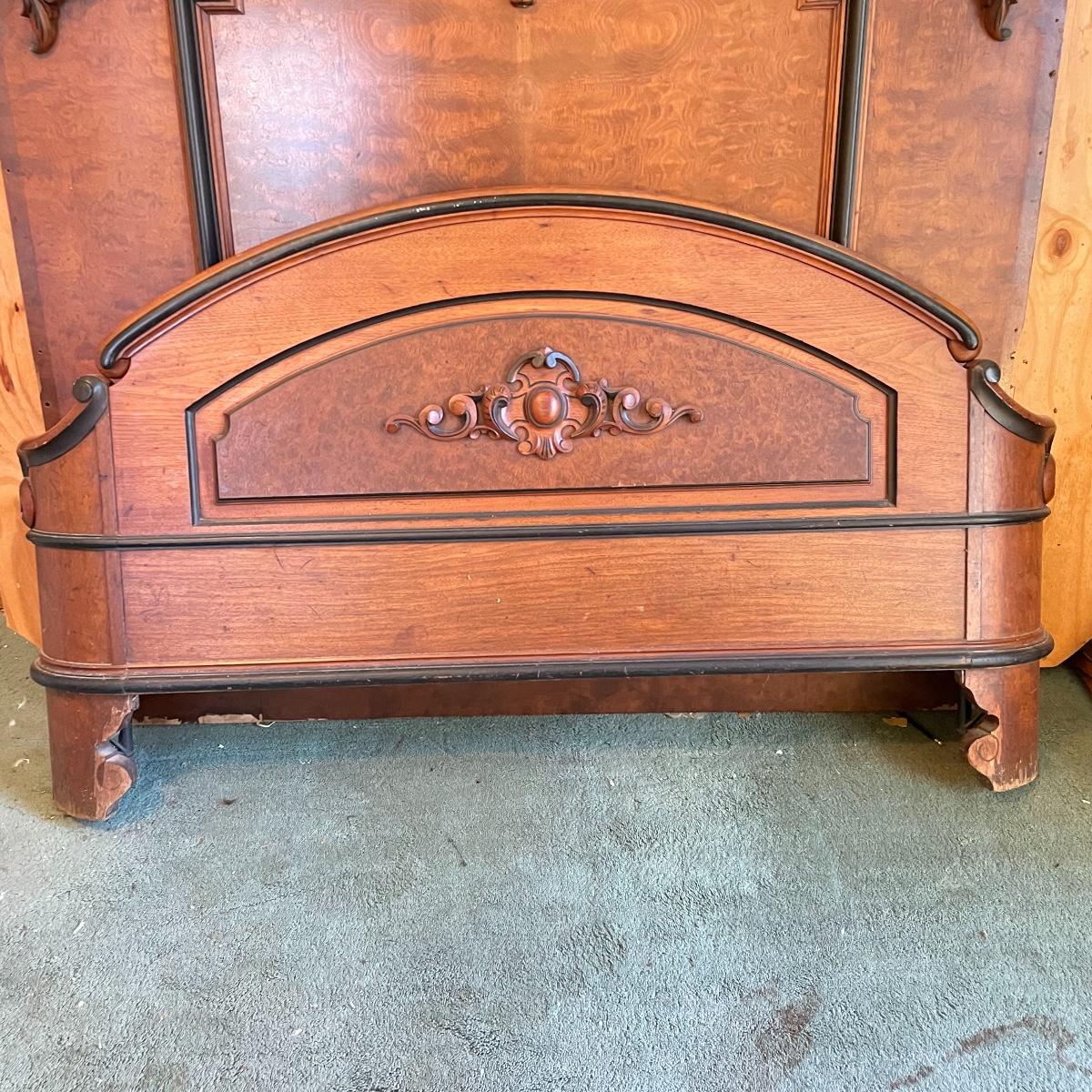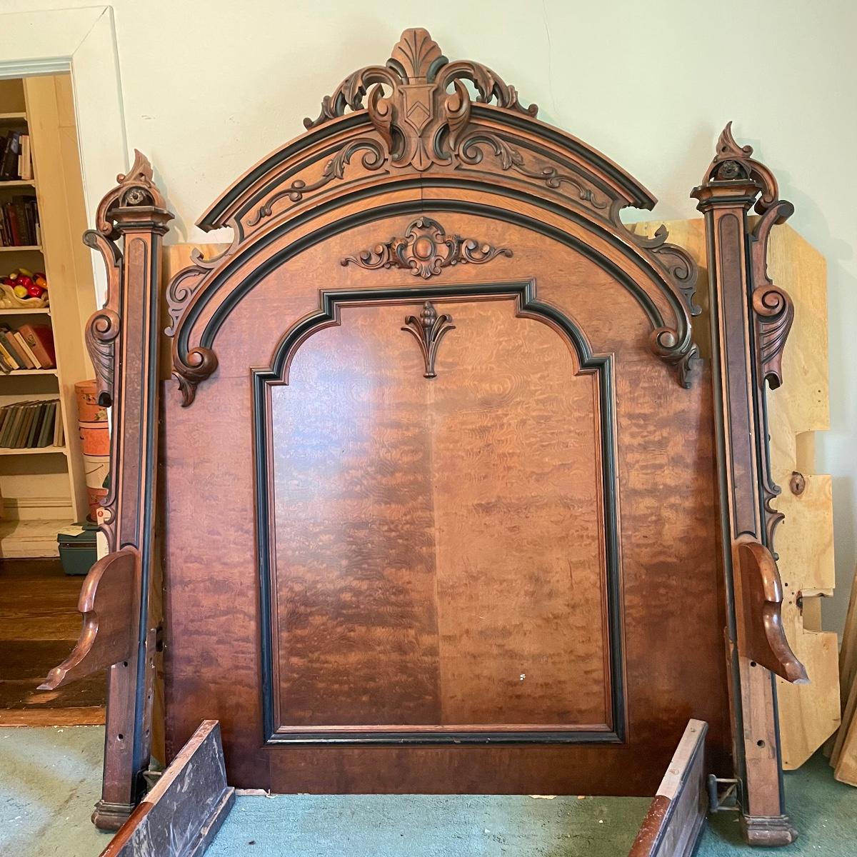 Stunning carved antique bed belonging to the Trapp family for multiple generations with a matching dresser in Lot 247. Headboard will attach to side pieces 23” off the ground, making the total height approximately 104” tall and approximately 77” wide. Note: the sides of the headboard will sit lower when assembled, Bed is not shown fully assembled in images. The footboard 65” x 40”, holding just under a 60”wide mattress. The side rails are 72.75” long. Some dowel attachments have broken or need replaced along with a few other areas noted in photos. Pieces include four feet w/screws, two large headboard edges along with two smaller accents, two side rails, four bed slats, and Headboard/footboard. See images. Local pick up only. Please bring help to load, bed is located upstairs. Mattress will likely need to be custom made to fit.