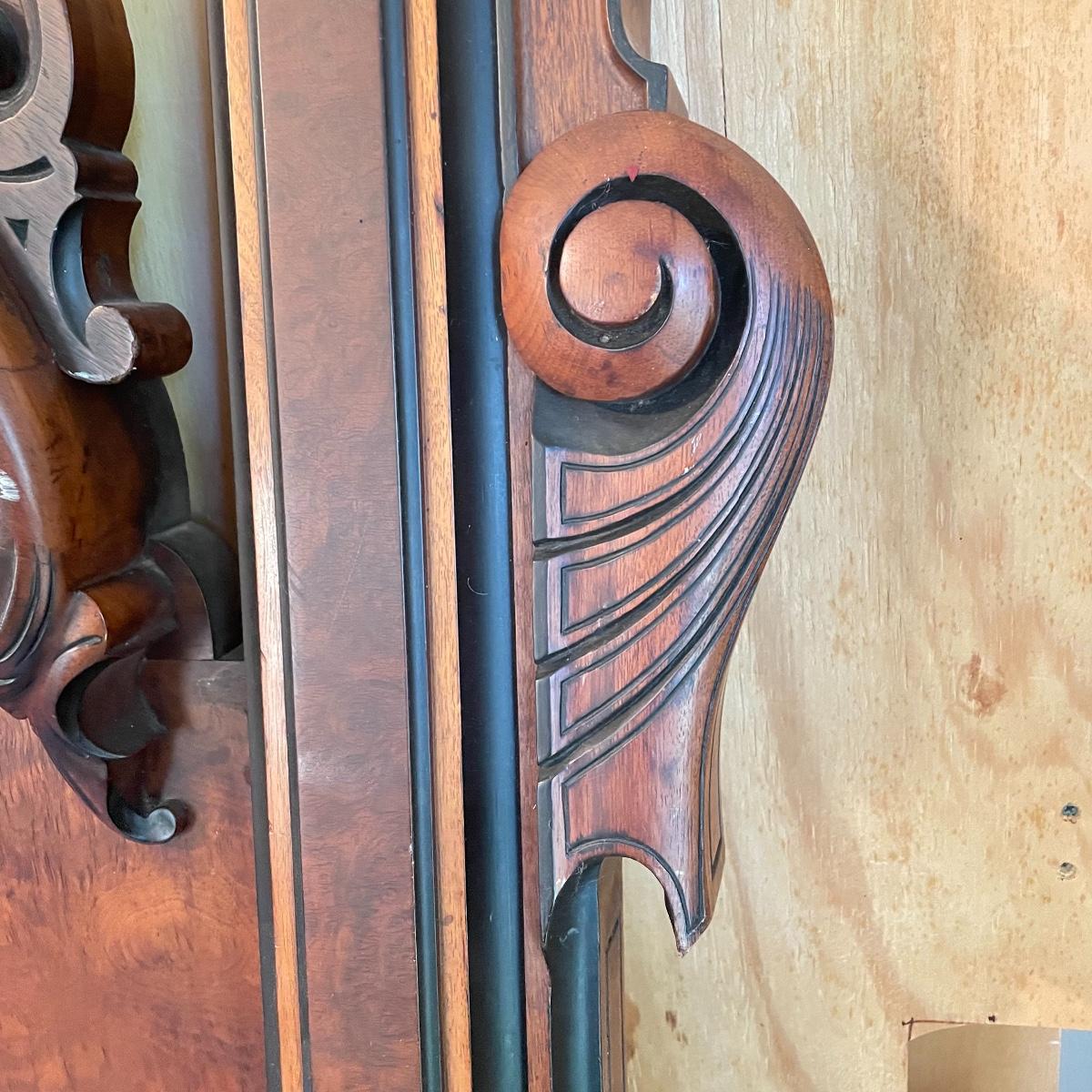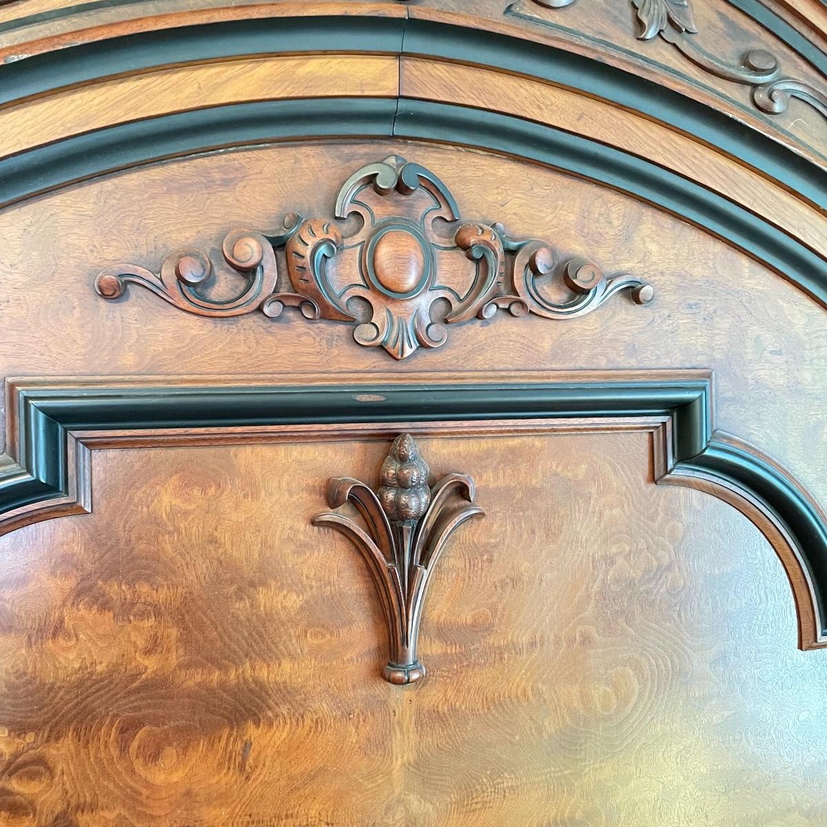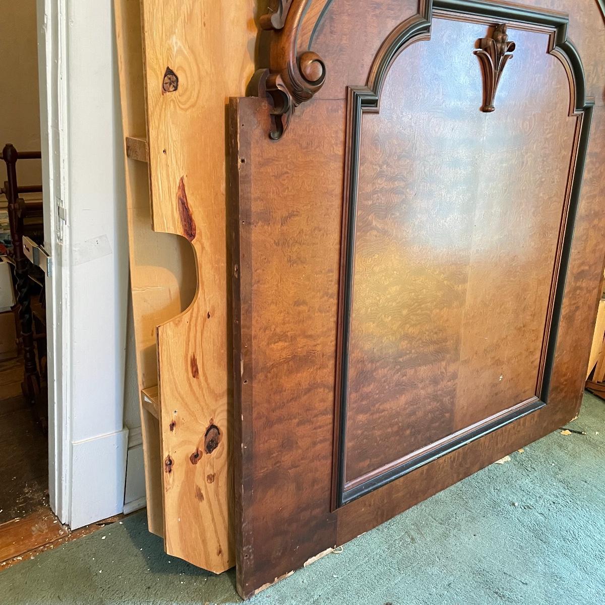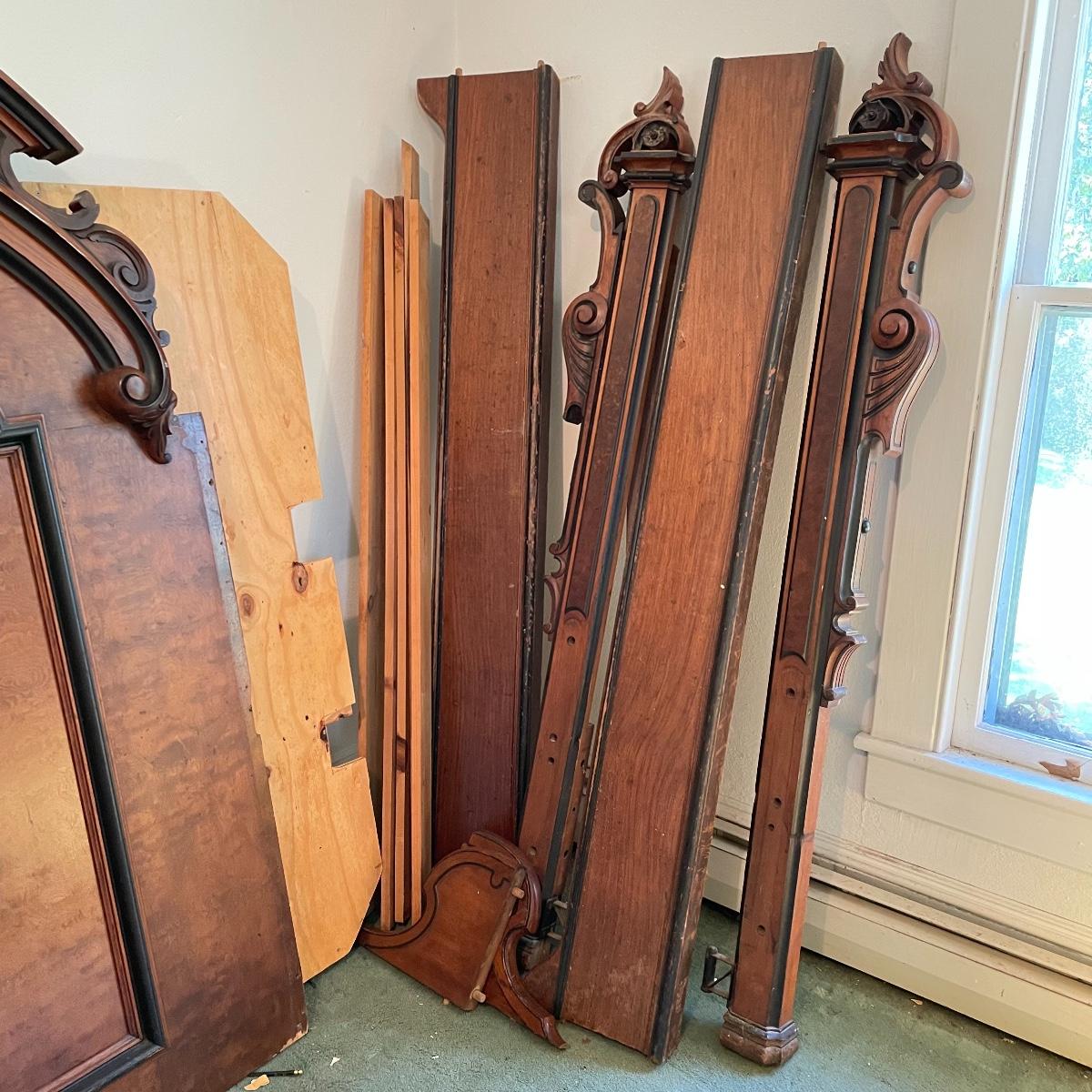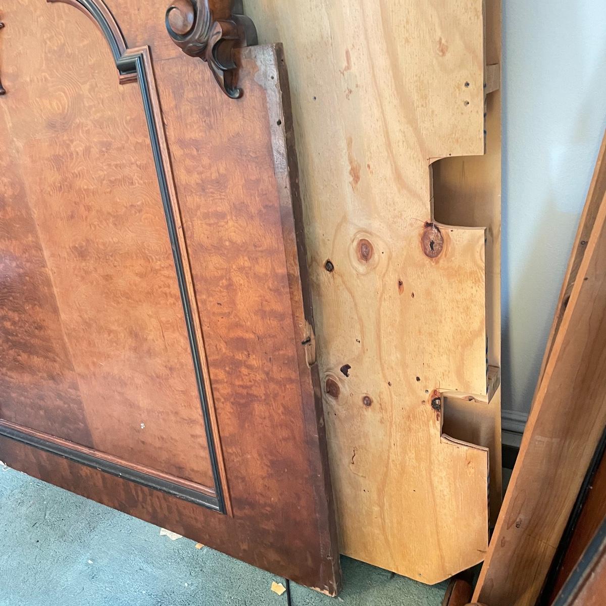 Stunning carved antique bed belonging to the Trapp family for multiple generations with a matching dresser in Lot 247. Headboard will attach to side pieces 23” off the ground, making the total height approximately 104” tall and approximately 77” wide. Note: the sides of the headboard will sit lower when assembled, Bed is not shown fully assembled in images. The footboard 65” x 40”, holding just under a 60”wide mattress. The side rails are 72.75” long. Some dowel attachments have broken or need replaced along with a few other areas noted in photos. Pieces include four feet w/screws, two large headboard edges along with two smaller accents, two side rails, four bed slats, and Headboard/footboard. See images. Local pick up only. Please bring help to load, bed is located upstairs. Mattress will likely need to be custom made to fit.