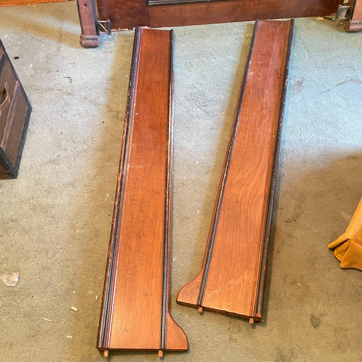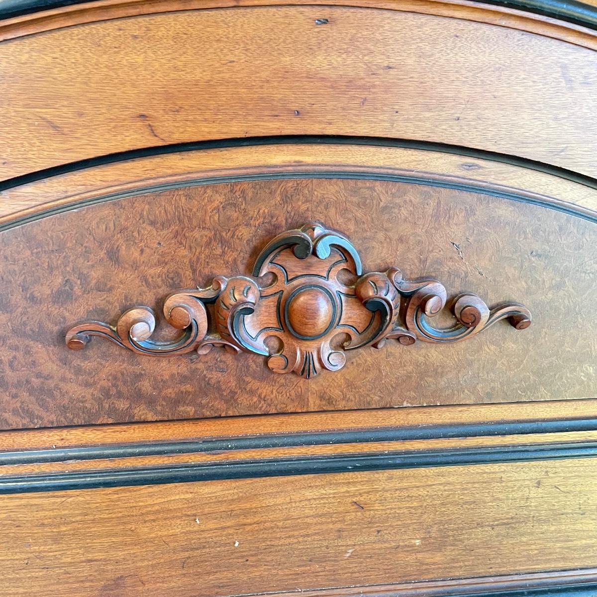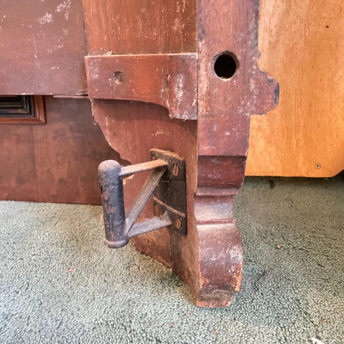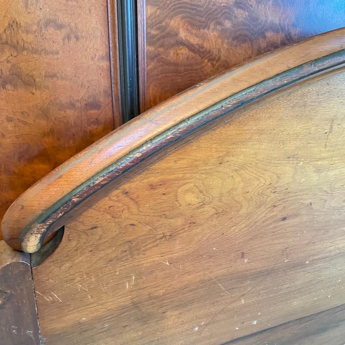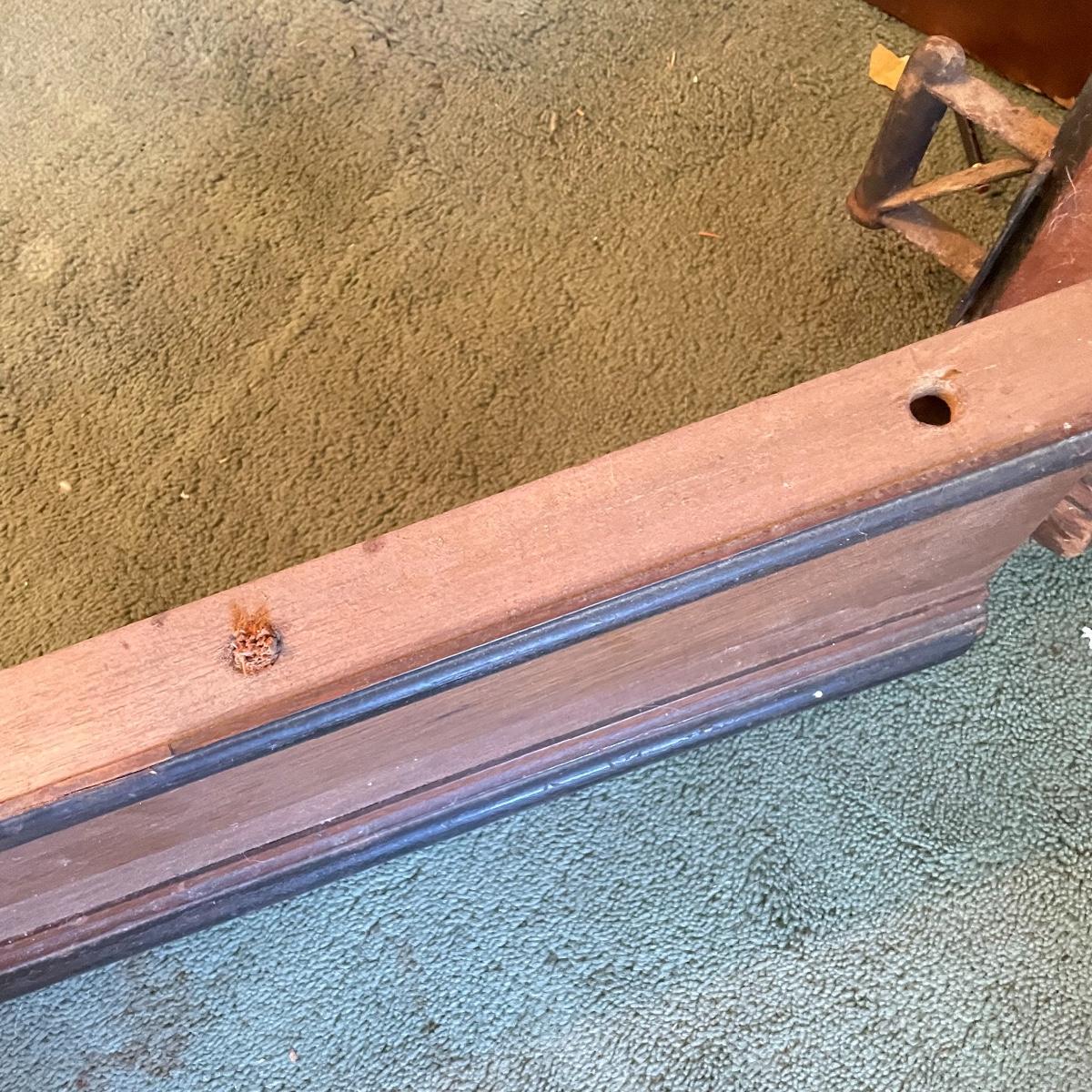 Stunning carved antique bed belonging to the Trapp family for multiple generations with a matching dresser in Lot 247. Headboard will attach to side pieces 23” off the ground, making the total height approximately 104” tall and approximately 77” wide. Note: the sides of the headboard will sit lower when assembled, Bed is not shown fully assembled in images. The footboard 65” x 40”, holding just under a 60”wide mattress. The side rails are 72.75” long. Some dowel attachments have broken or need replaced along with a few other areas noted in photos. Pieces include four feet w/screws, two large headboard edges along with two smaller accents, two side rails, four bed slats, and Headboard/footboard. See images. Local pick up only. Please bring help to load, bed is located upstairs. Mattress will likely need to be custom made to fit.