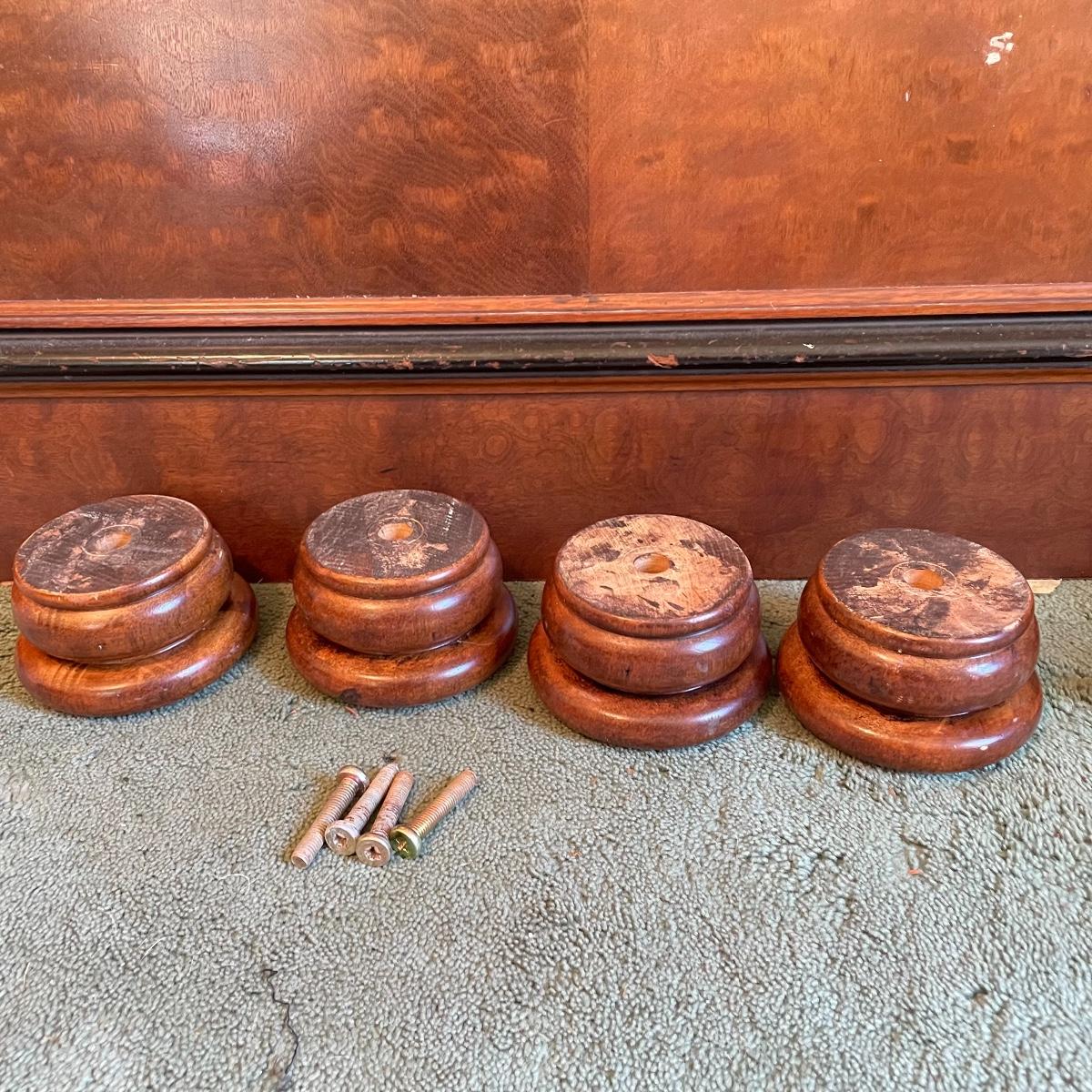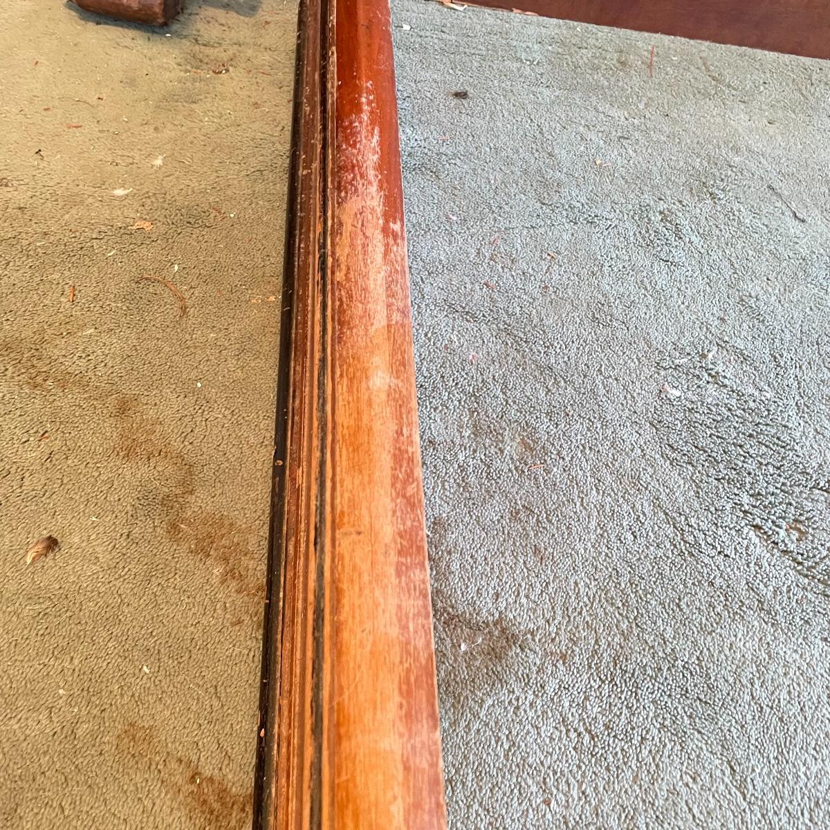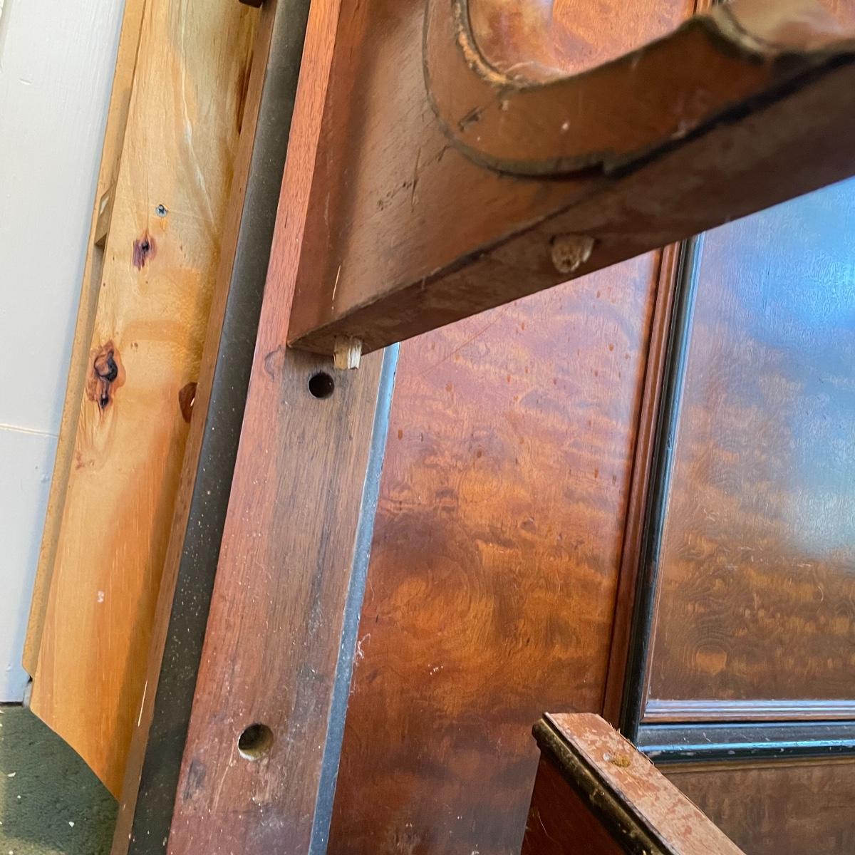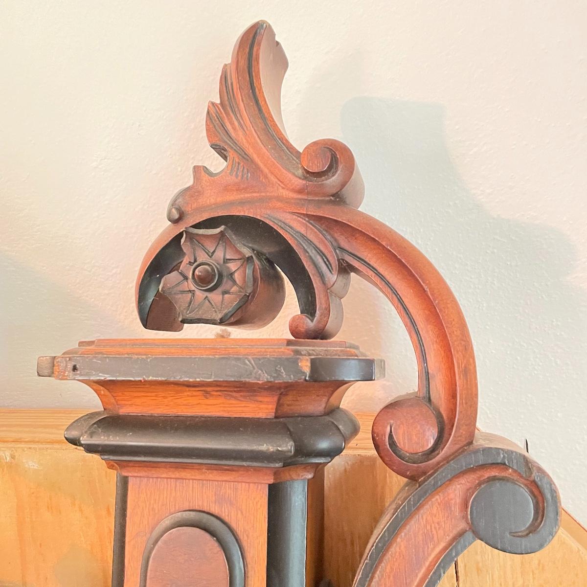 Stunning carved antique bed belonging to the Trapp family for multiple generations with a matching dresser in Lot 247. Headboard will attach to side pieces 23” off the ground, making the total height approximately 104” tall and approximately 77” wide. Note: the sides of the headboard will sit lower when assembled, Bed is not shown fully assembled in images. The footboard 65” x 40”, holding just under a 60”wide mattress. The side rails are 72.75” long. Some dowel attachments have broken or need replaced along with a few other areas noted in photos. Pieces include four feet w/screws, two large headboard edges along with two smaller accents, two side rails, four bed slats, and Headboard/footboard. See images. Local pick up only. Please bring help to load, bed is located upstairs. Mattress will likely need to be custom made to fit.