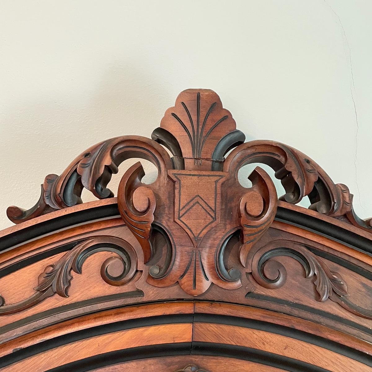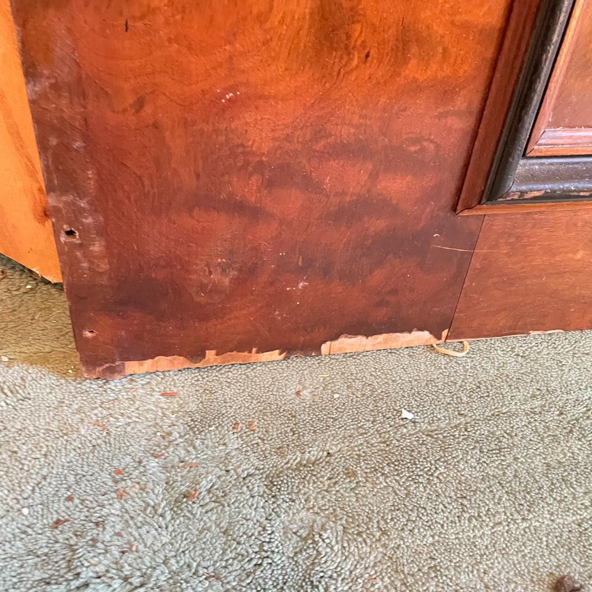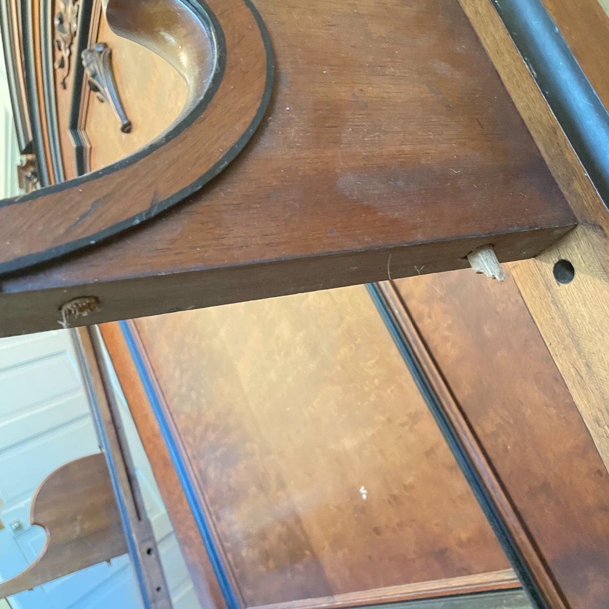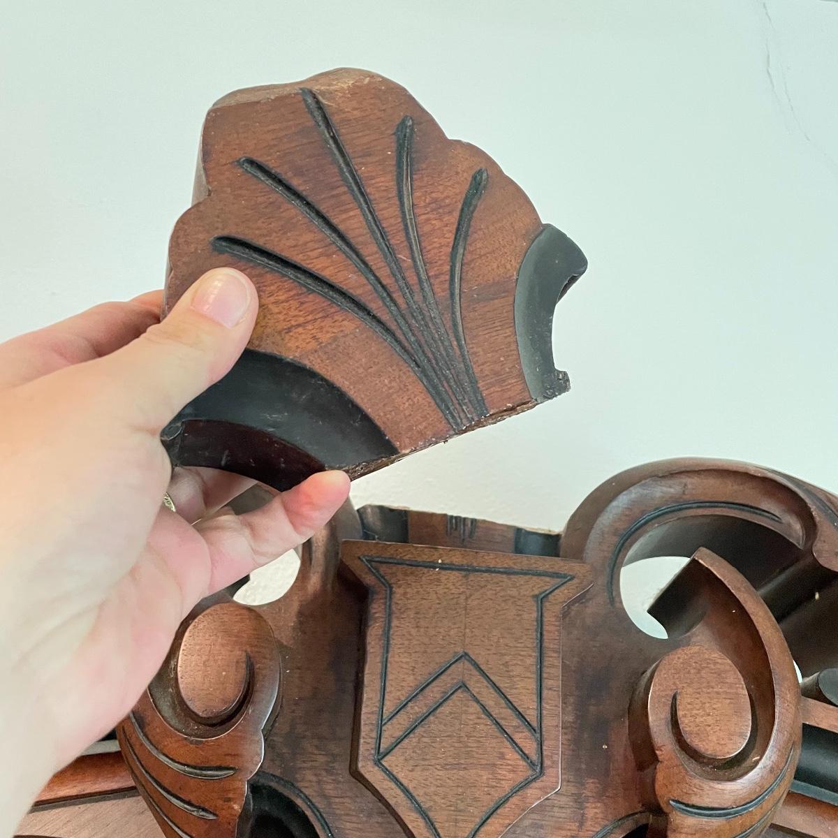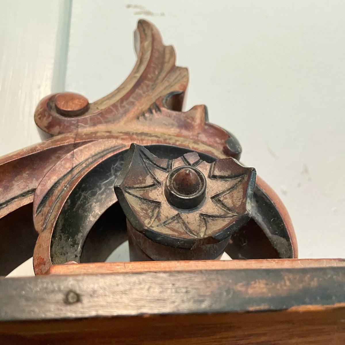 Stunning carved antique bed belonging to the Trapp family for multiple generations with a matching dresser in Lot 247. Headboard will attach to side pieces 23” off the ground, making the total height approximately 104” tall and approximately 77” wide. Note: the sides of the headboard will sit lower when assembled, Bed is not shown fully assembled in images. The footboard 65” x 40”, holding just under a 60”wide mattress. The side rails are 72.75” long. Some dowel attachments have broken or need replaced along with a few other areas noted in photos. Pieces include four feet w/screws, two large headboard edges along with two smaller accents, two side rails, four bed slats, and Headboard/footboard. See images. Local pick up only. Please bring help to load, bed is located upstairs. Mattress will likely need to be custom made to fit.