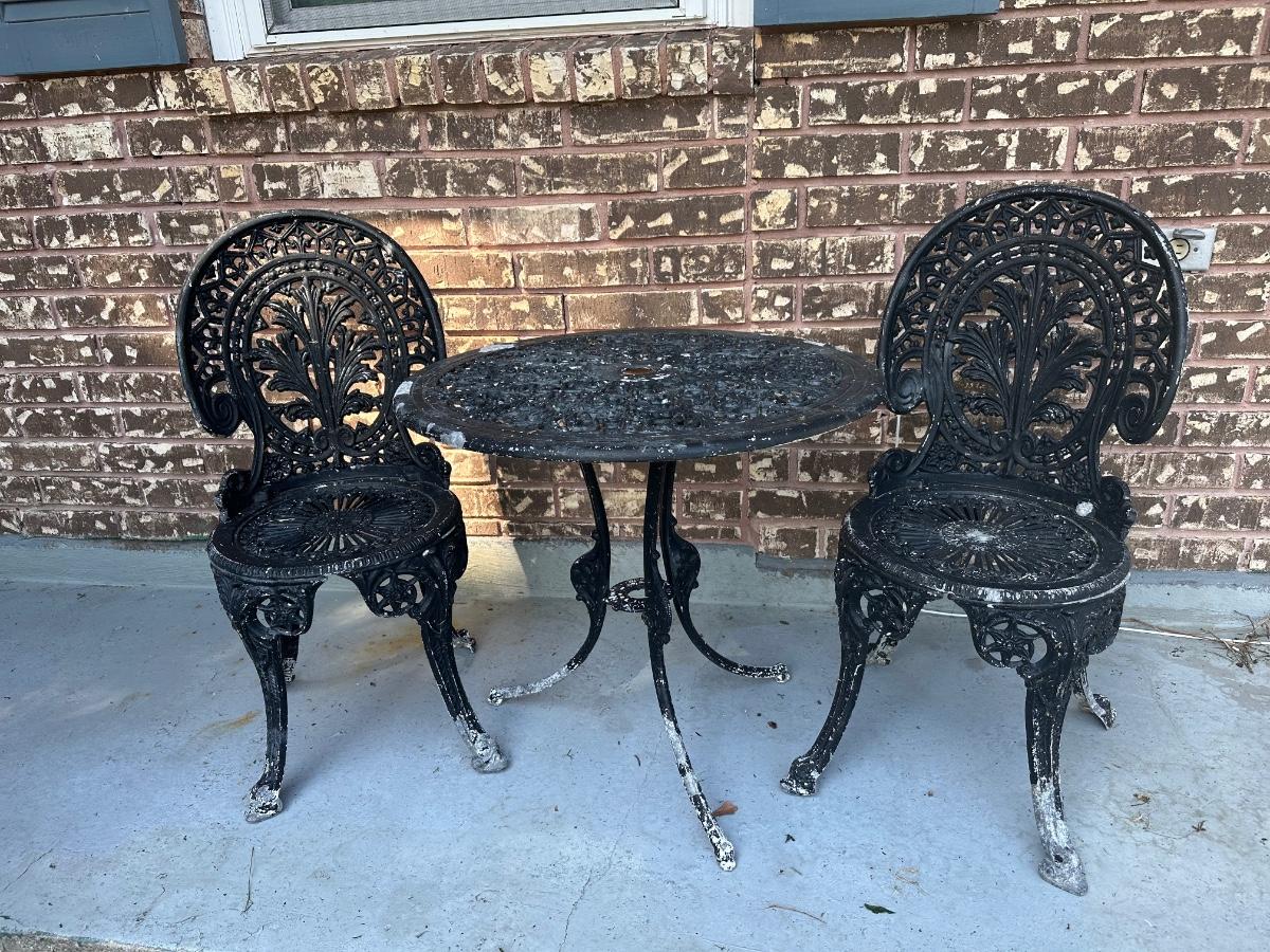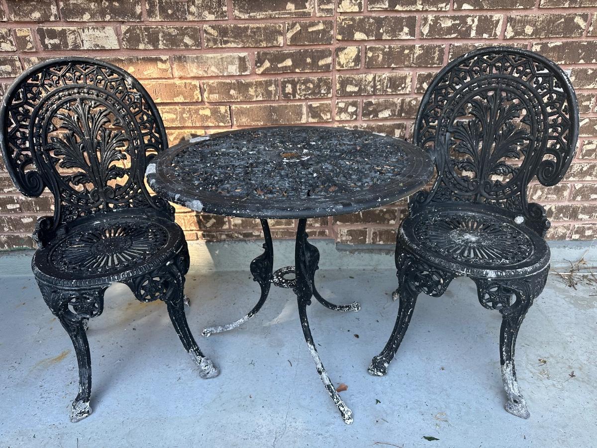 Decorative aluminum 3-piece outdoor bistro set including a round table and two matching chairs.