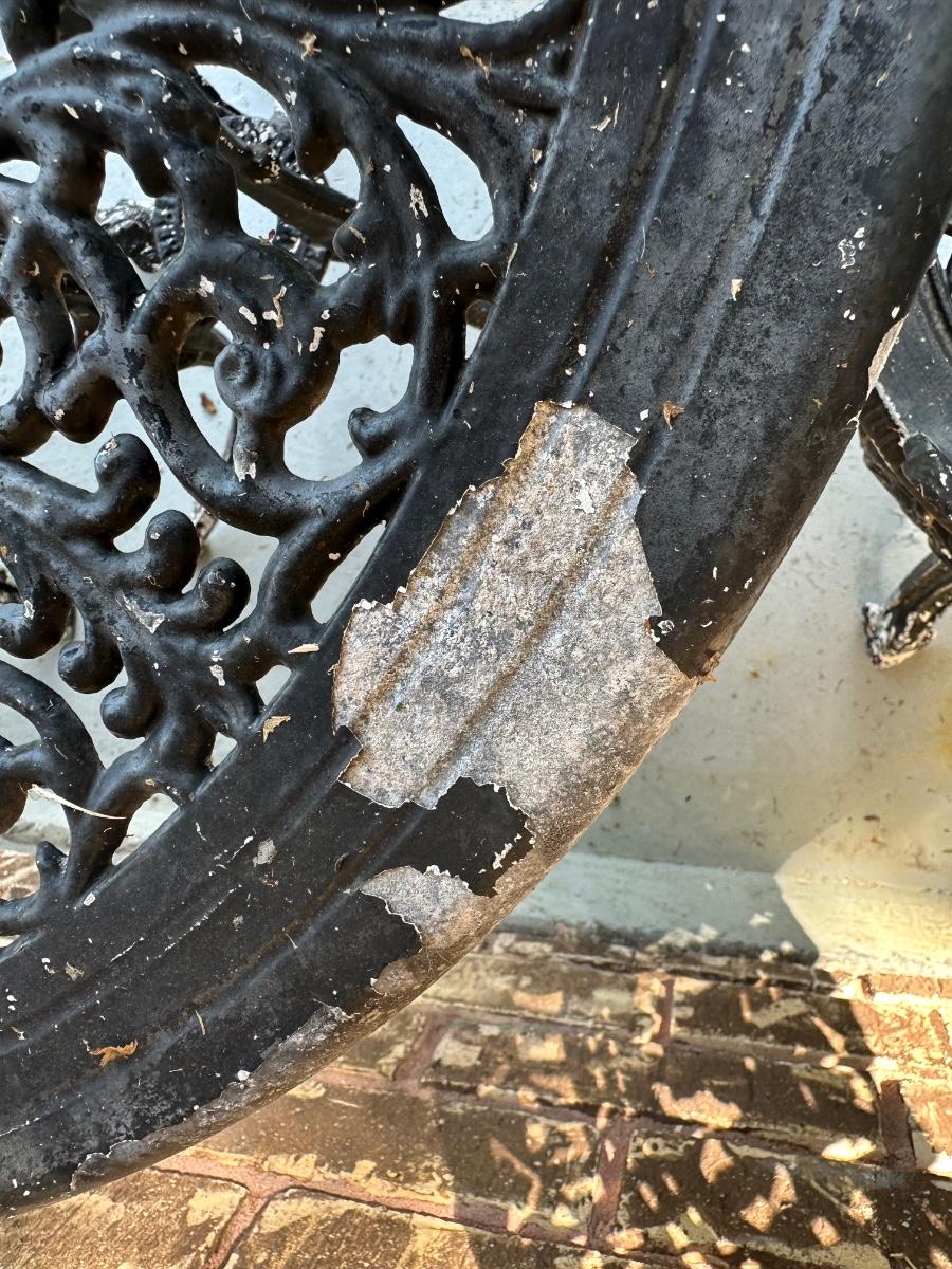 Condition: Structurally solid. Finish shows heavy weathering, paint chipping, and wear throughout (see photos). Great for outdoor use as-is or could be refreshed with a new coat of paint.