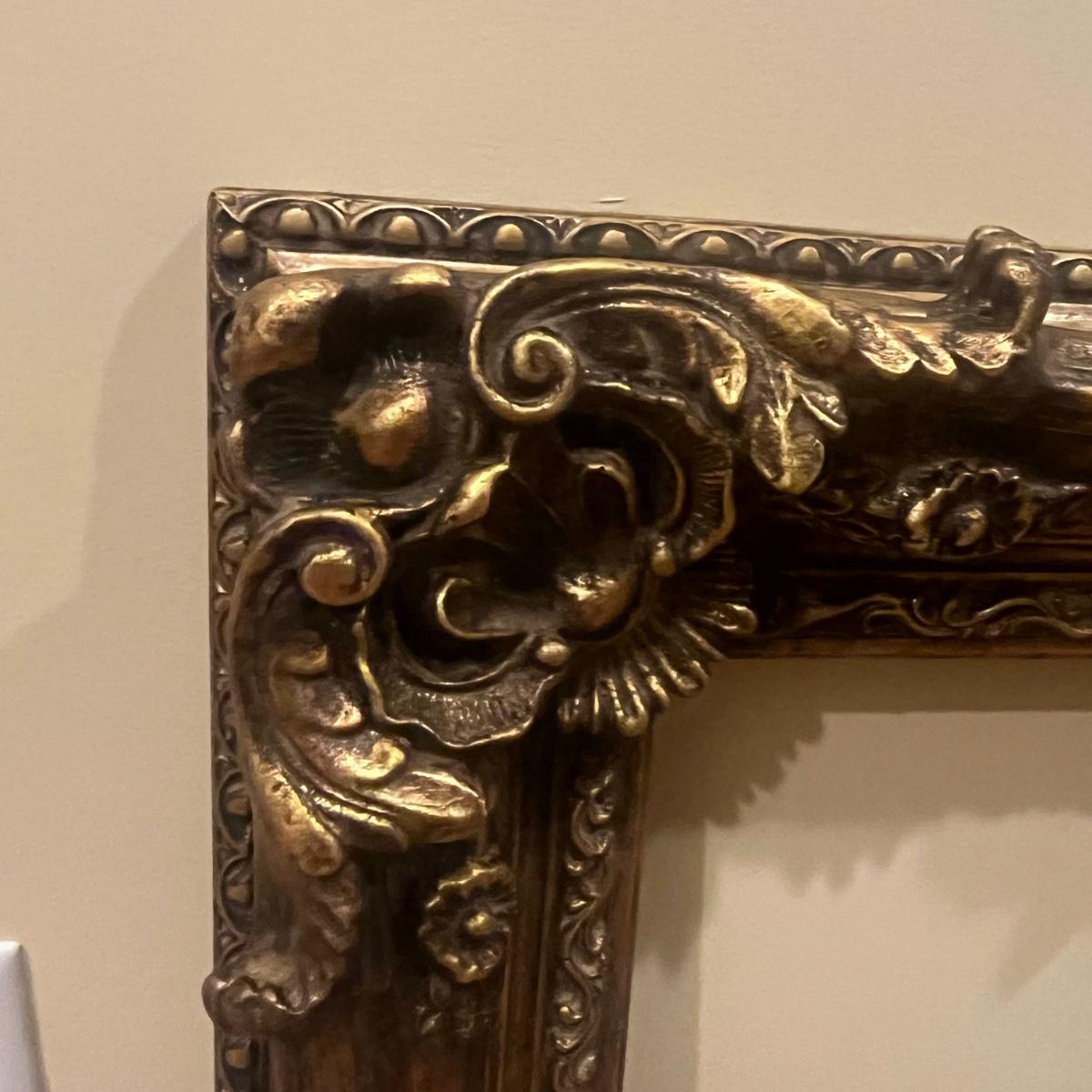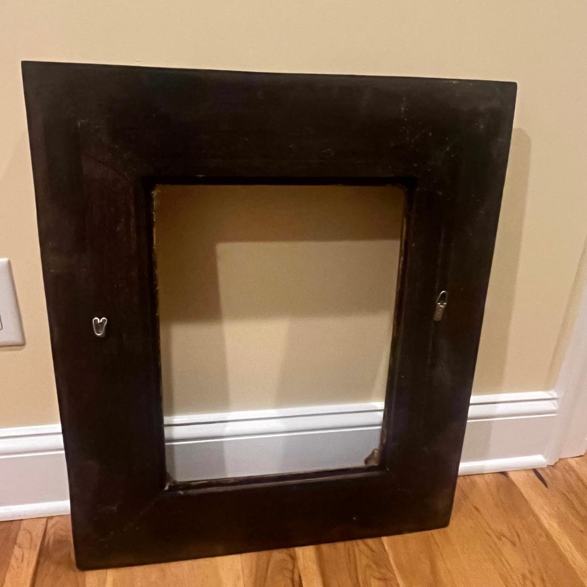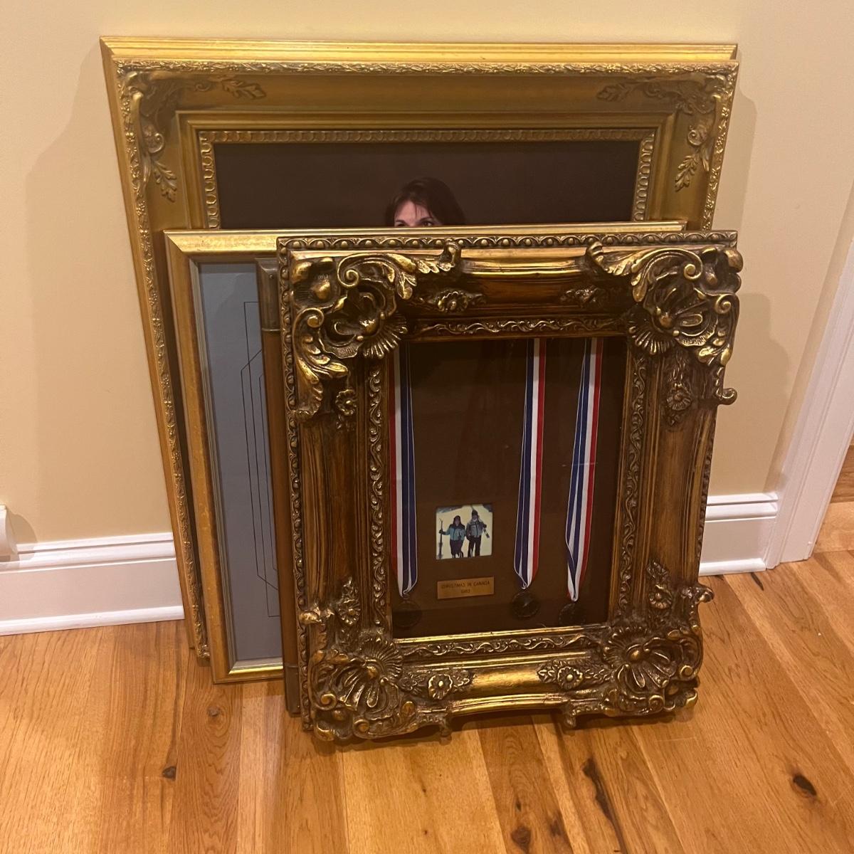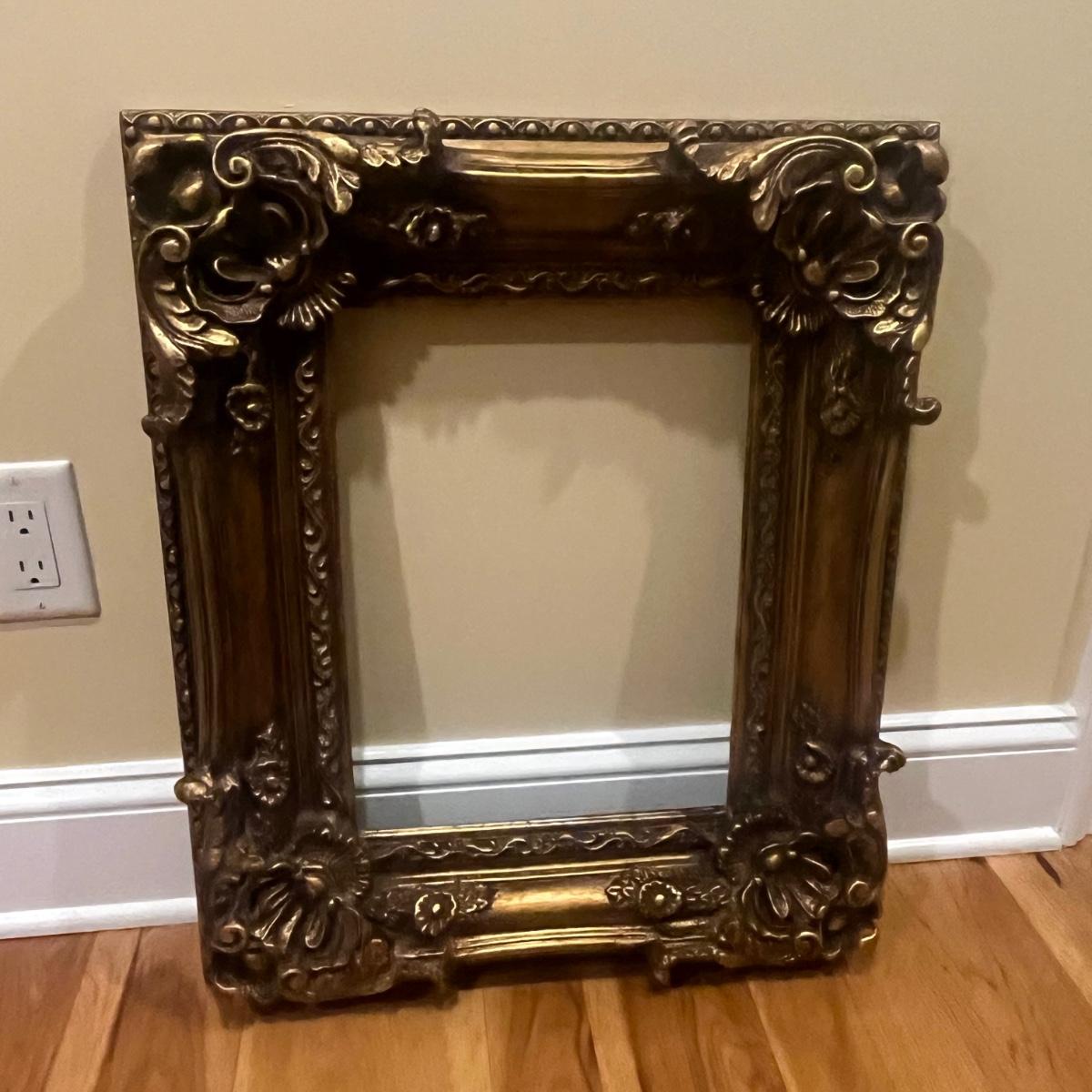 Lot includes one large gold colored wooden frame, one gold colored frame with no back and two more modern picture frames with glass. Largest gold colored frame measures 3” x 27” x 31.5”H.