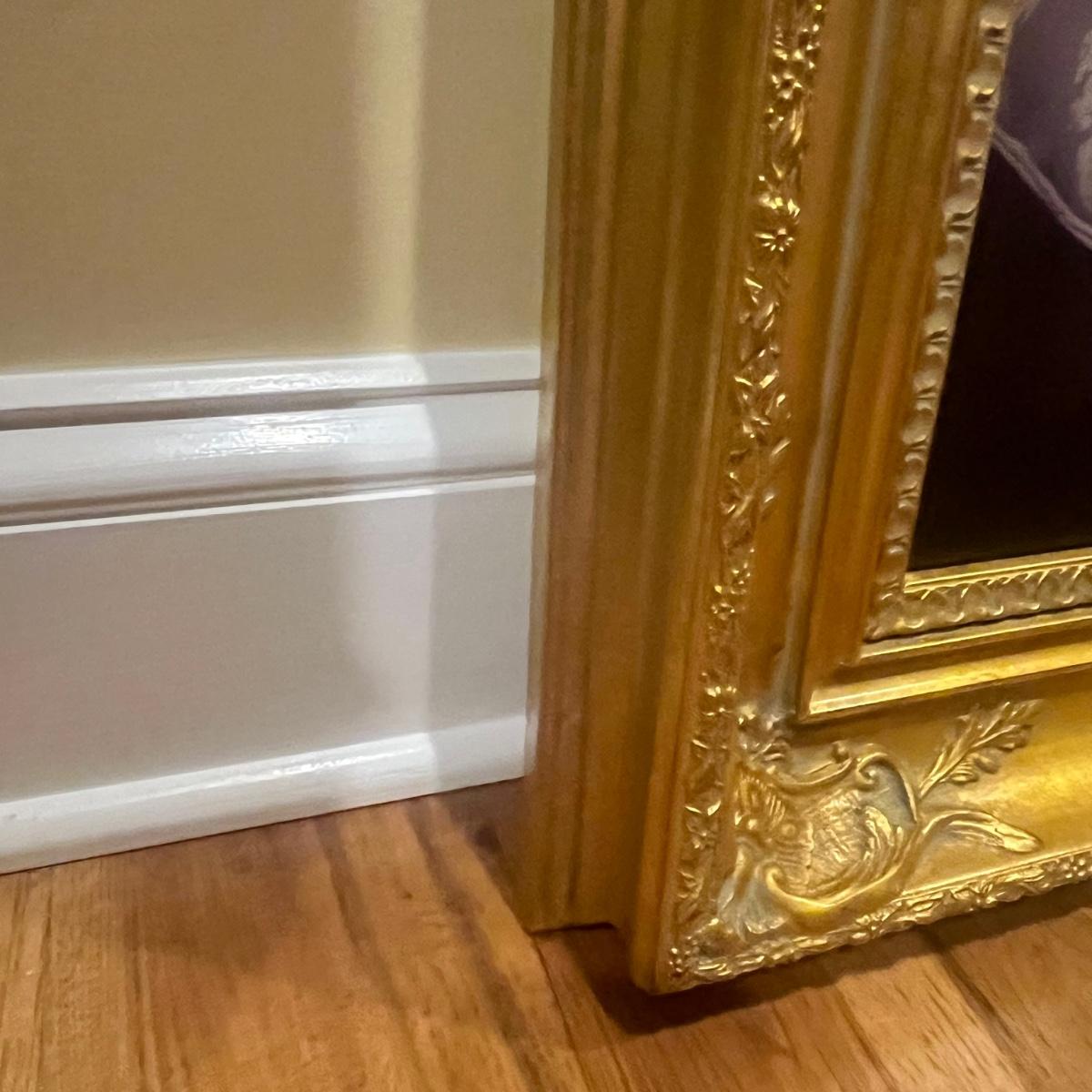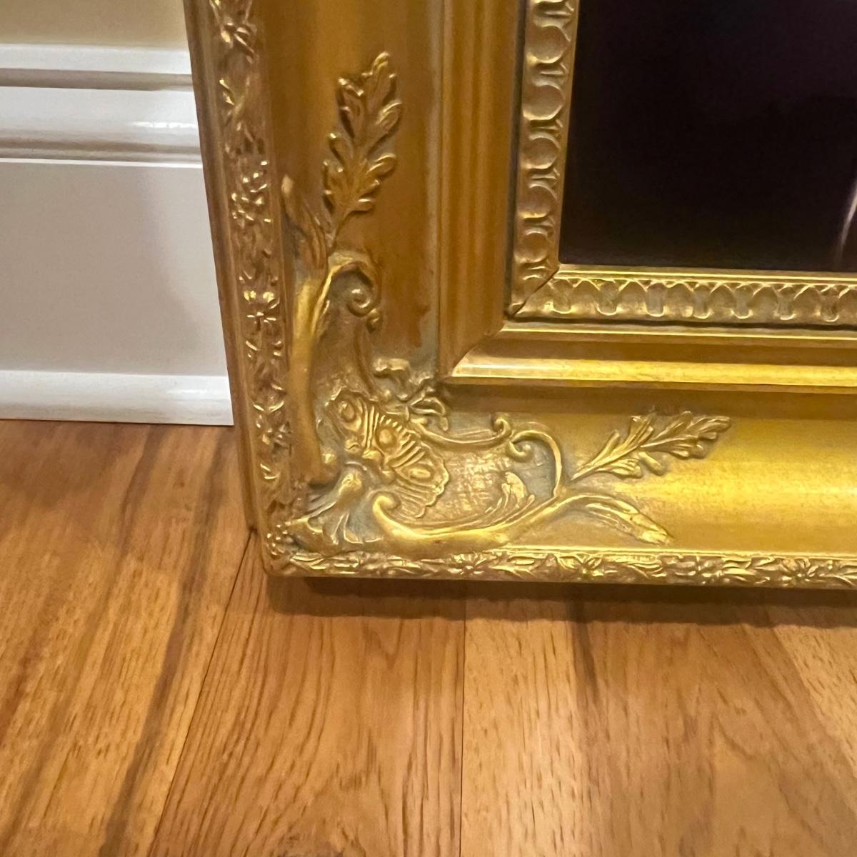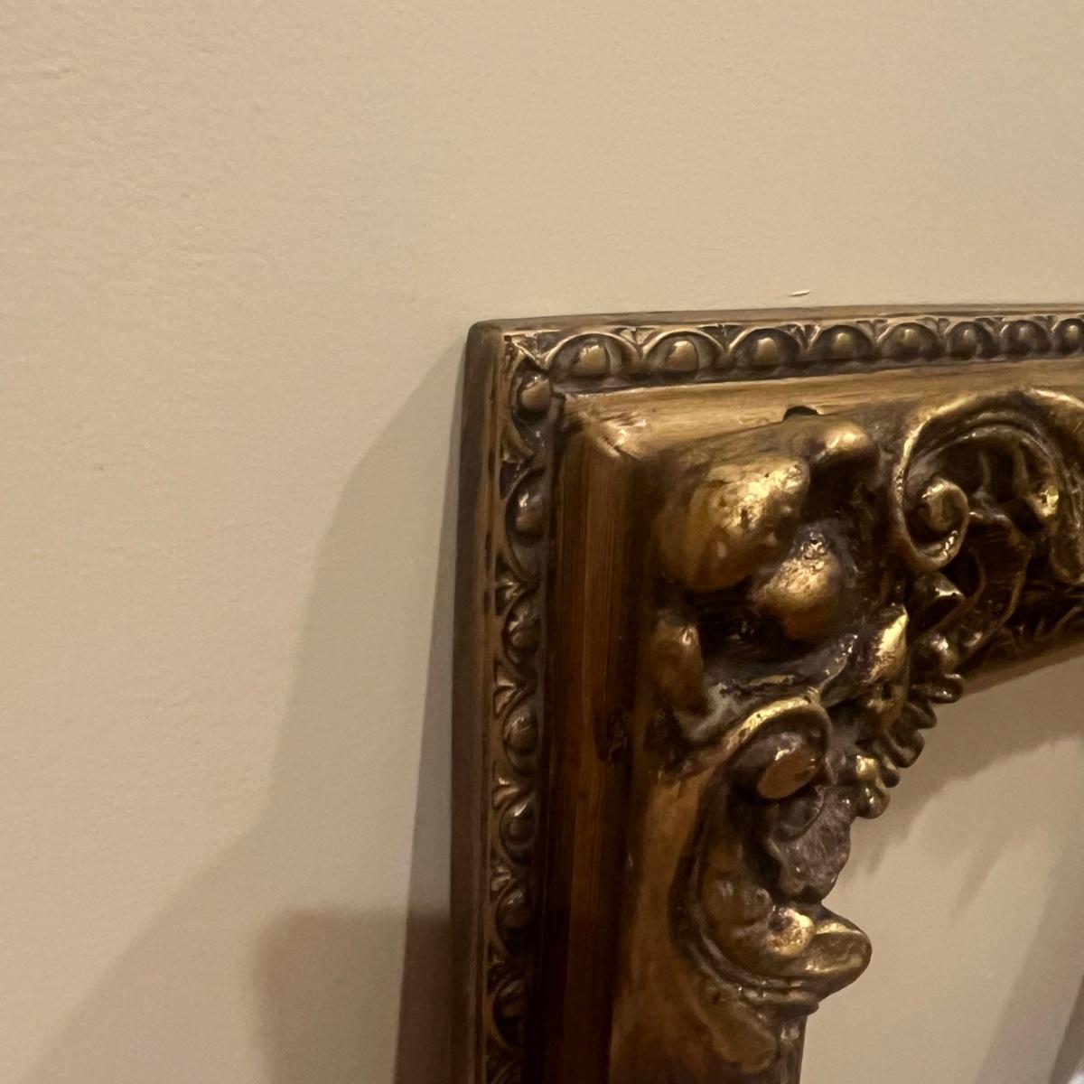 Lot includes one large gold colored wooden frame, one gold colored frame with no back and two more modern picture frames with glass. Largest gold colored frame measures 3” x 27” x 31.5”H.