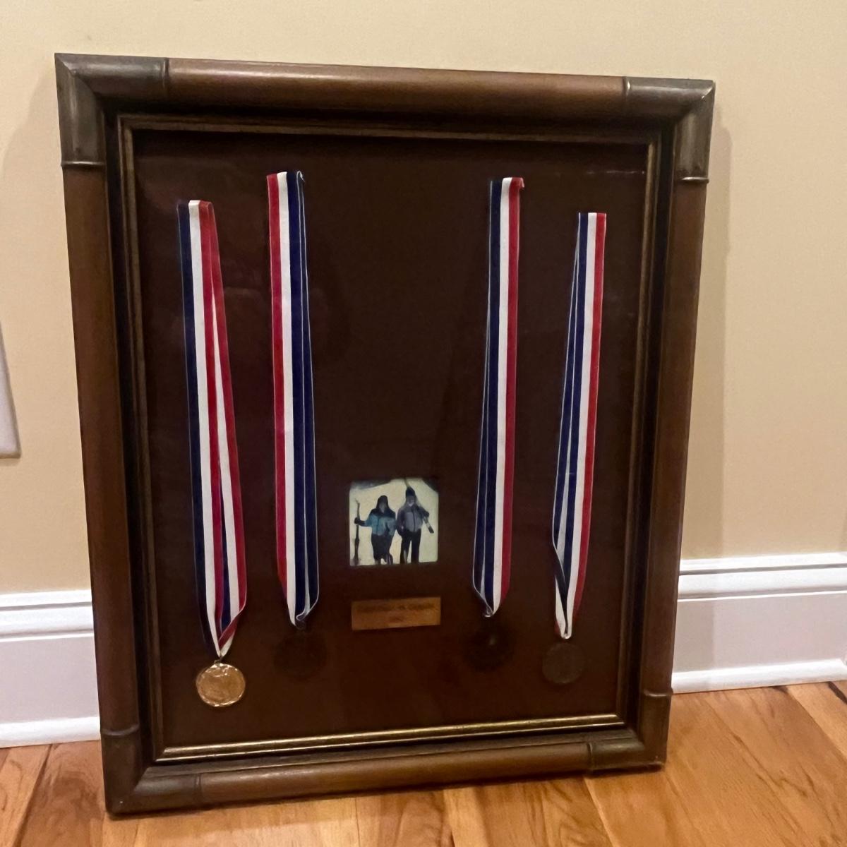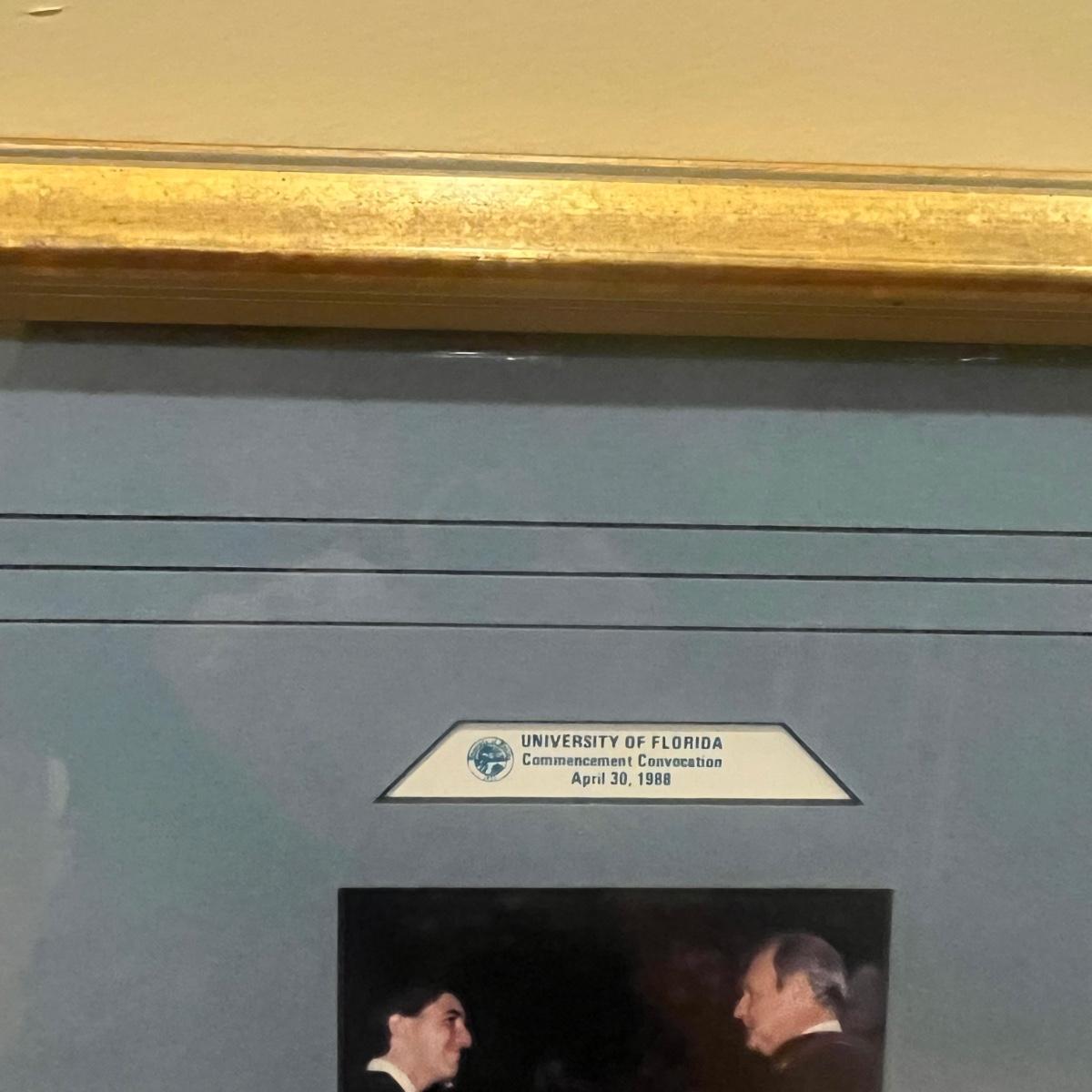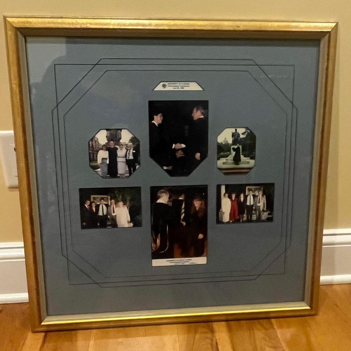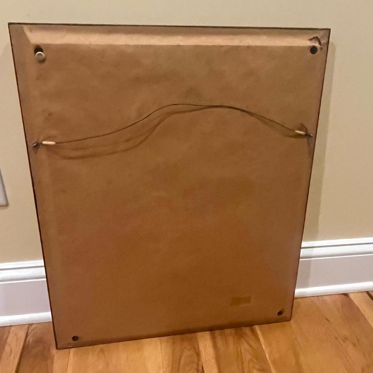 Lot includes one large gold colored wooden frame, one gold colored frame with no back and two more modern picture frames with glass. Largest gold colored frame measures 3” x 27” x 31.5”H.