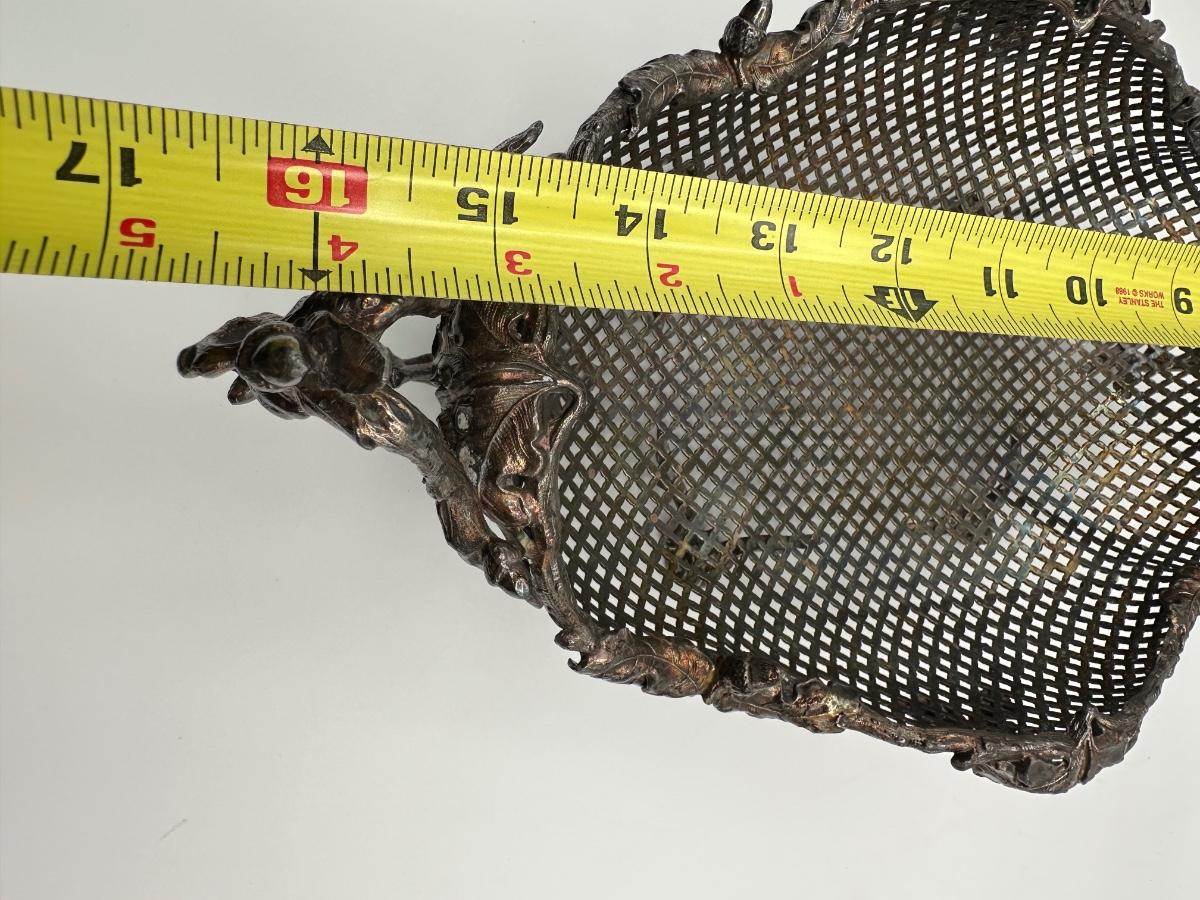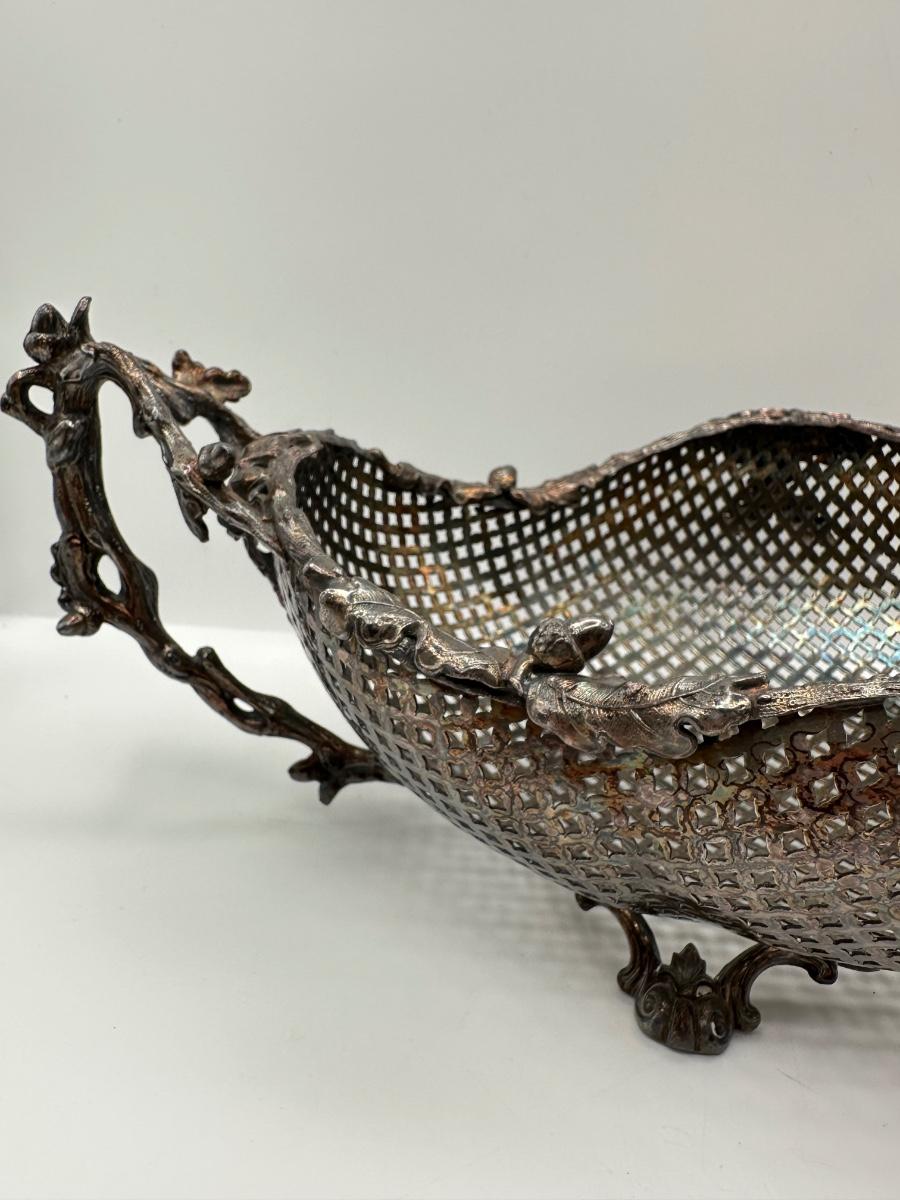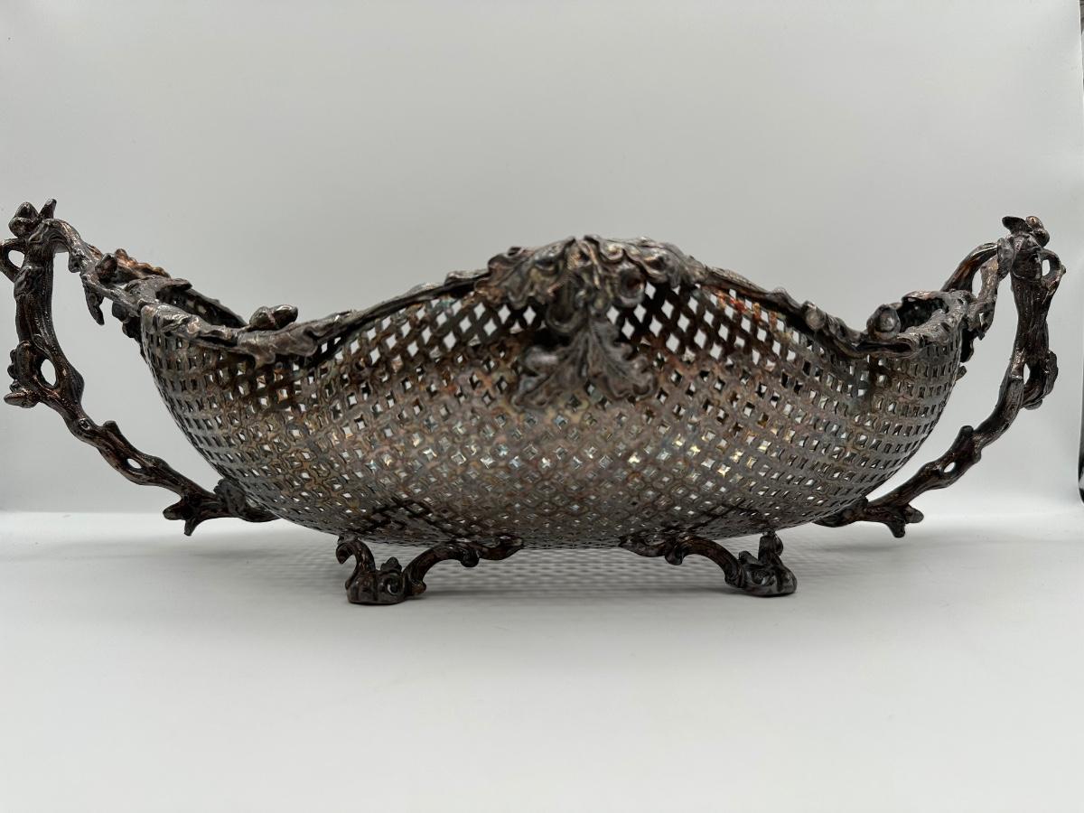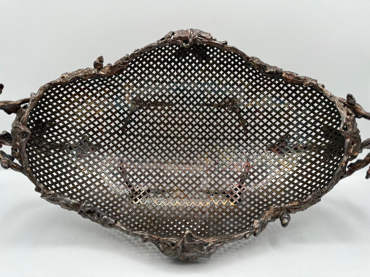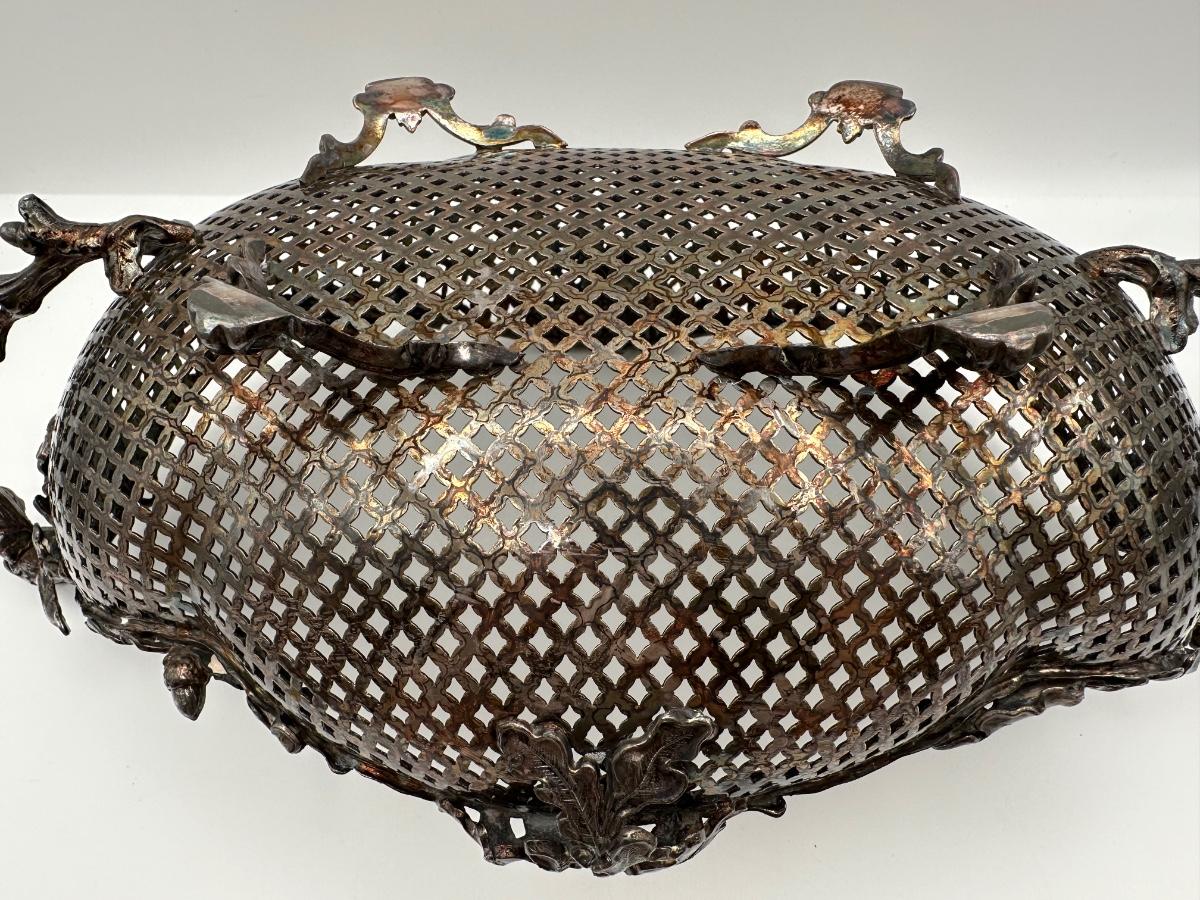 Decorative openwork metal basket featuring diamond-cut lattice body, vine handles, scrolling foliate feet, and ornate leaf rim. Stamped 5782 on underside.