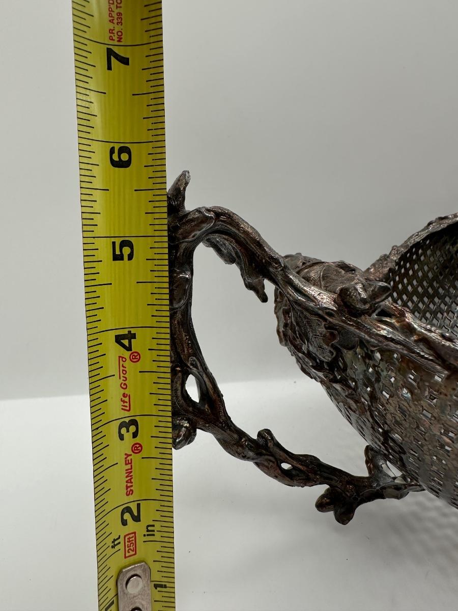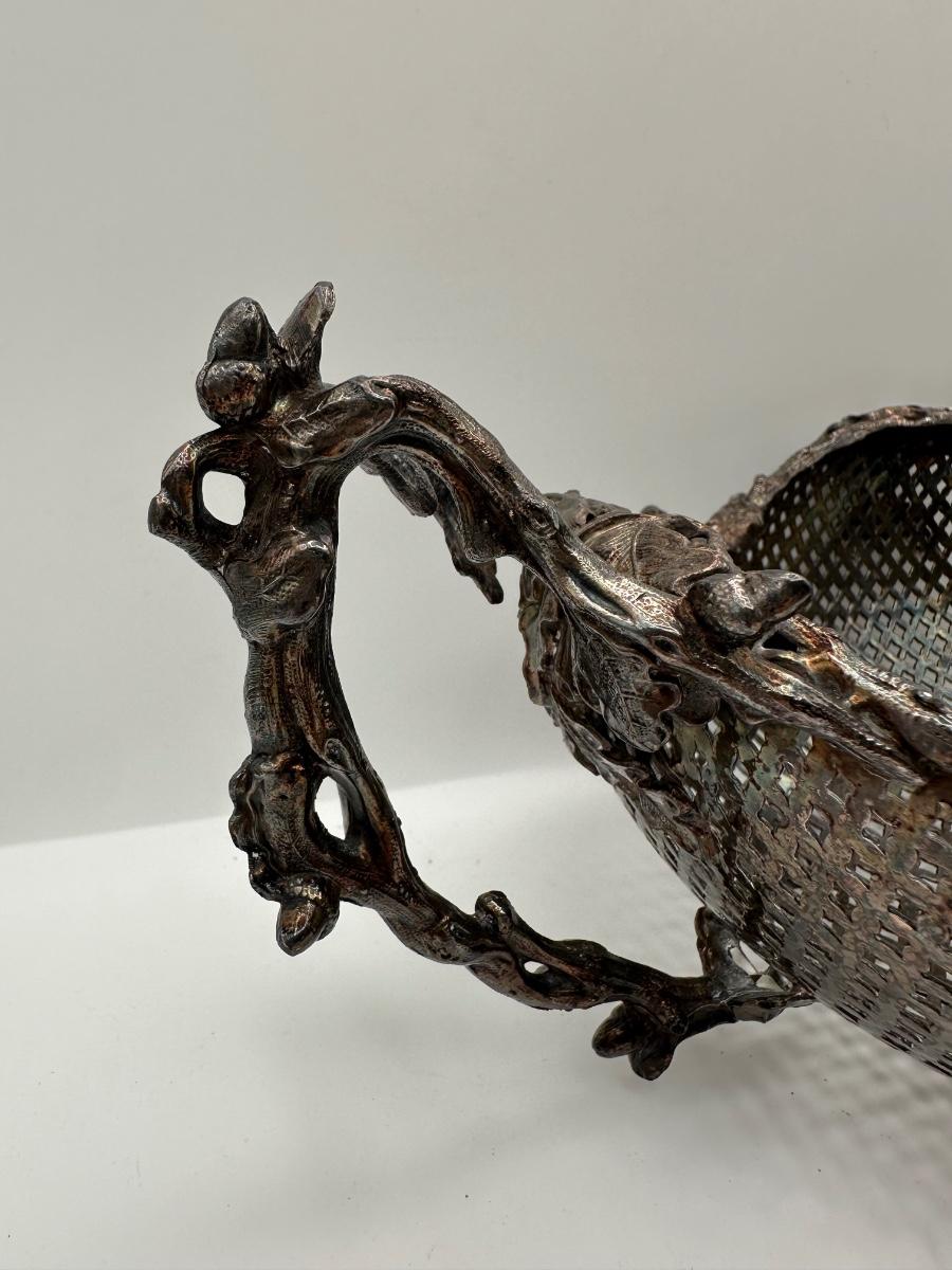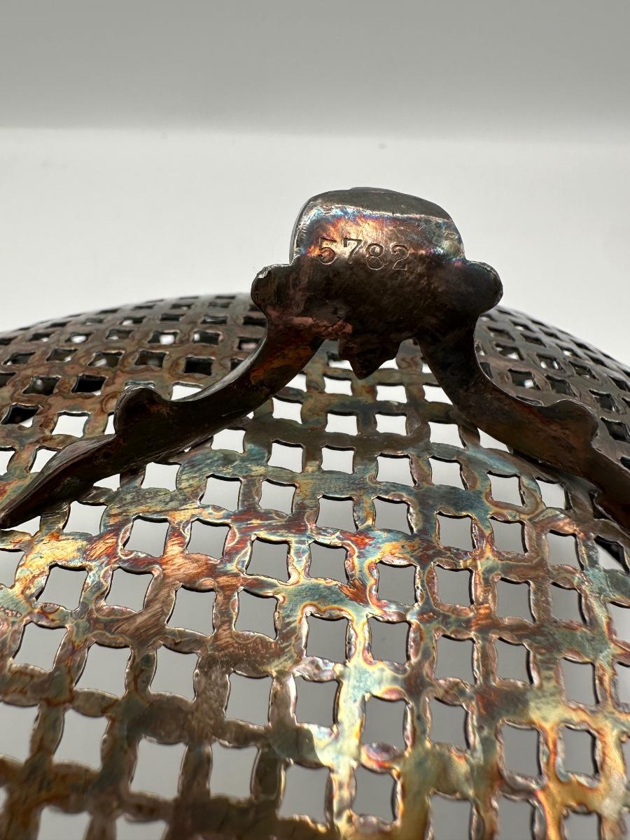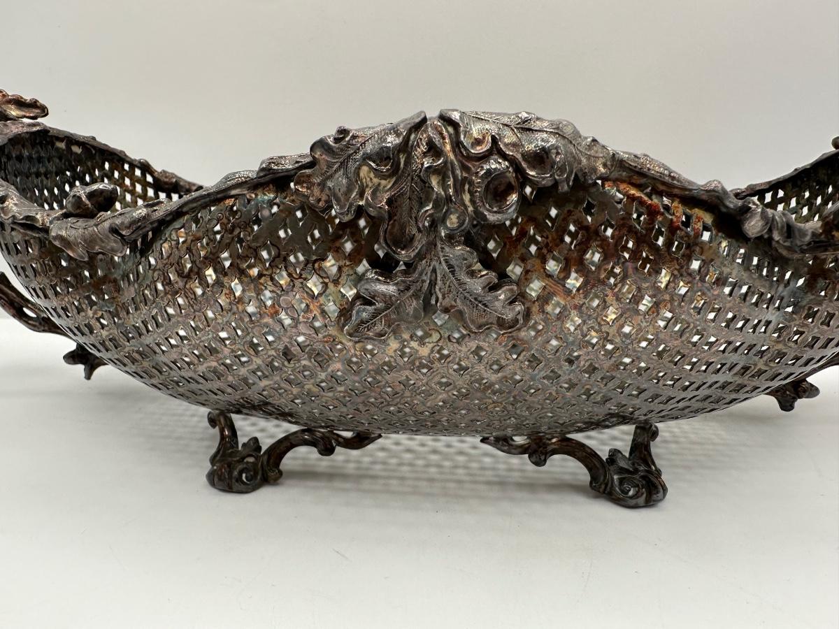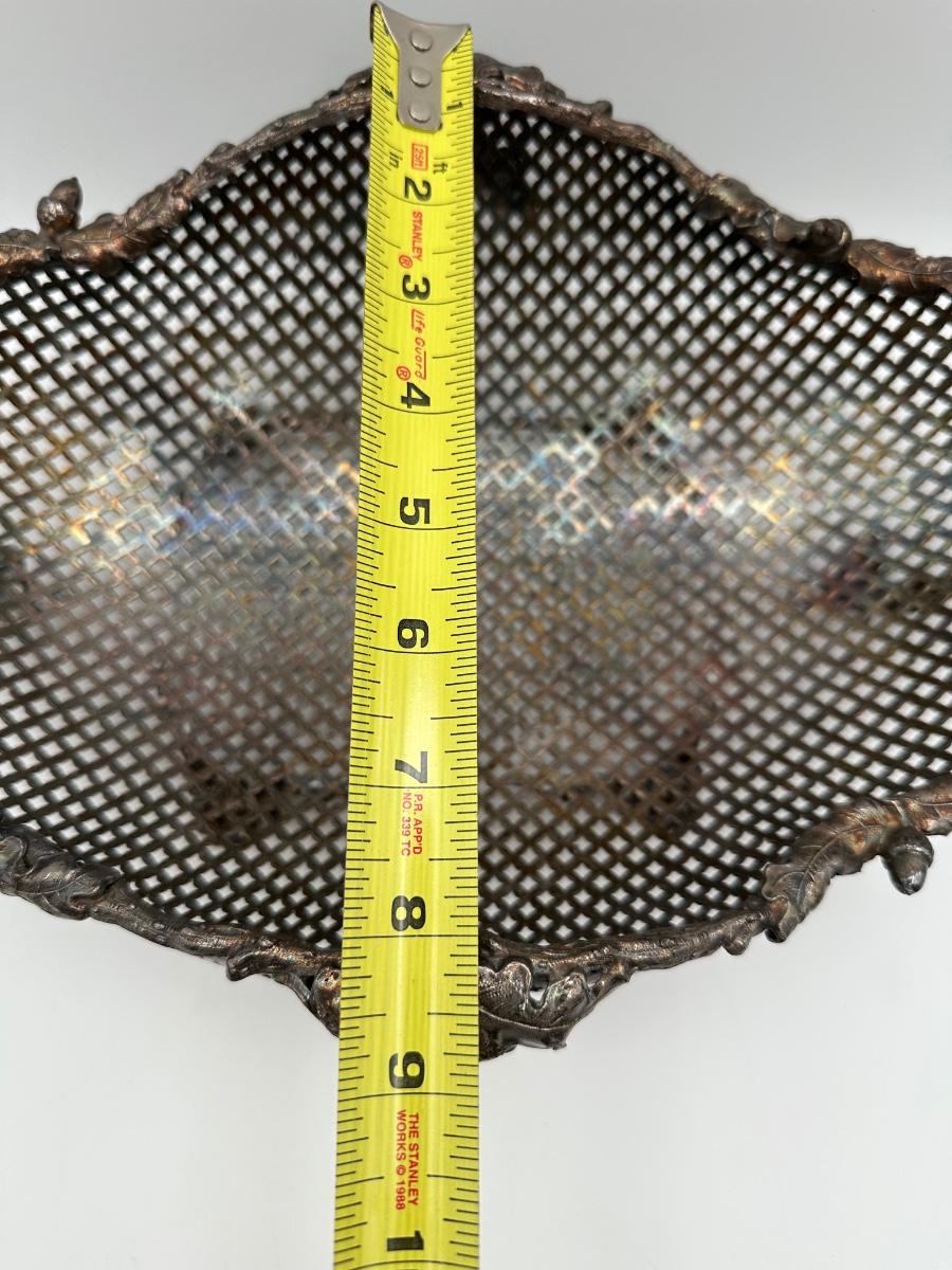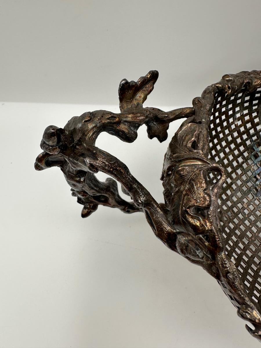 Decorative openwork metal basket featuring diamond-cut lattice body, vine handles, scrolling foliate feet, and ornate leaf rim. Stamped 5782 on underside.