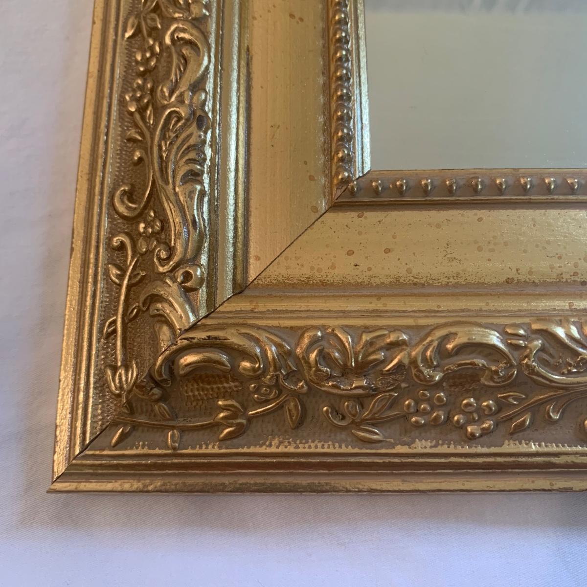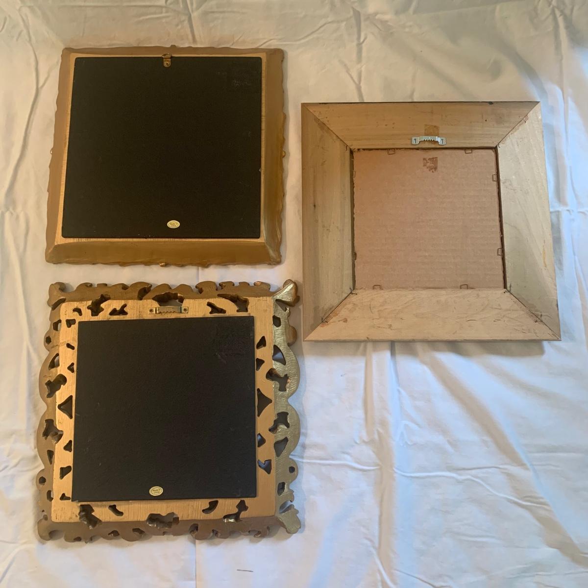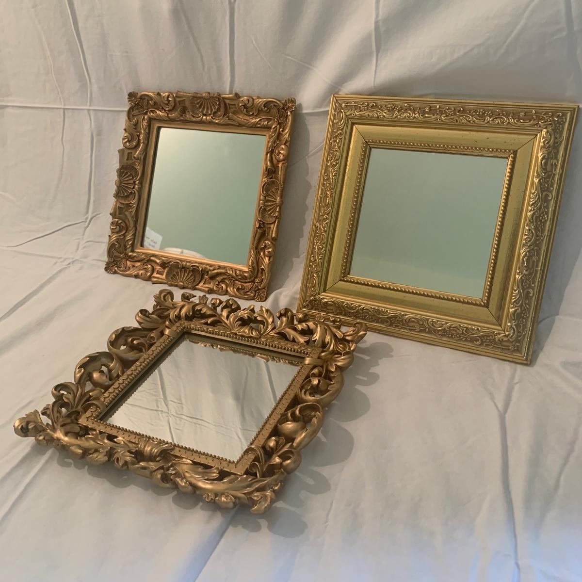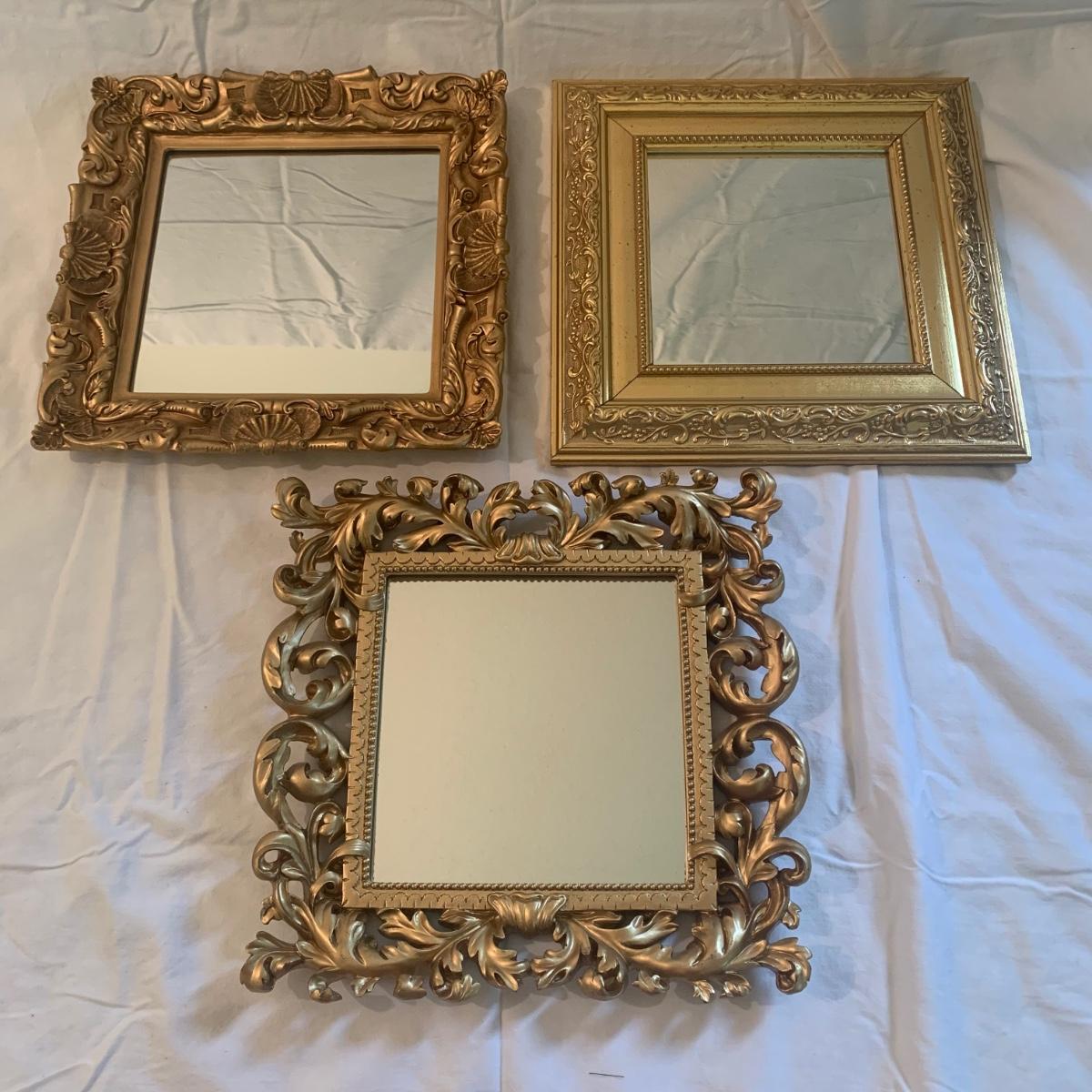 Lot includes three lovely gold painted mirrors with wooden frames in various designs. Please see photos for more details. Largest item measures, 12” x 12” x 1”H. Shipping available.