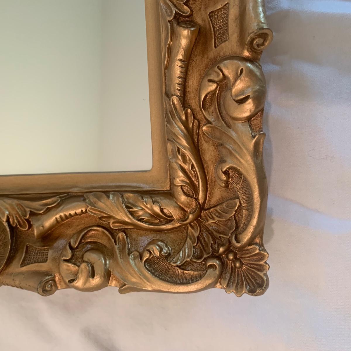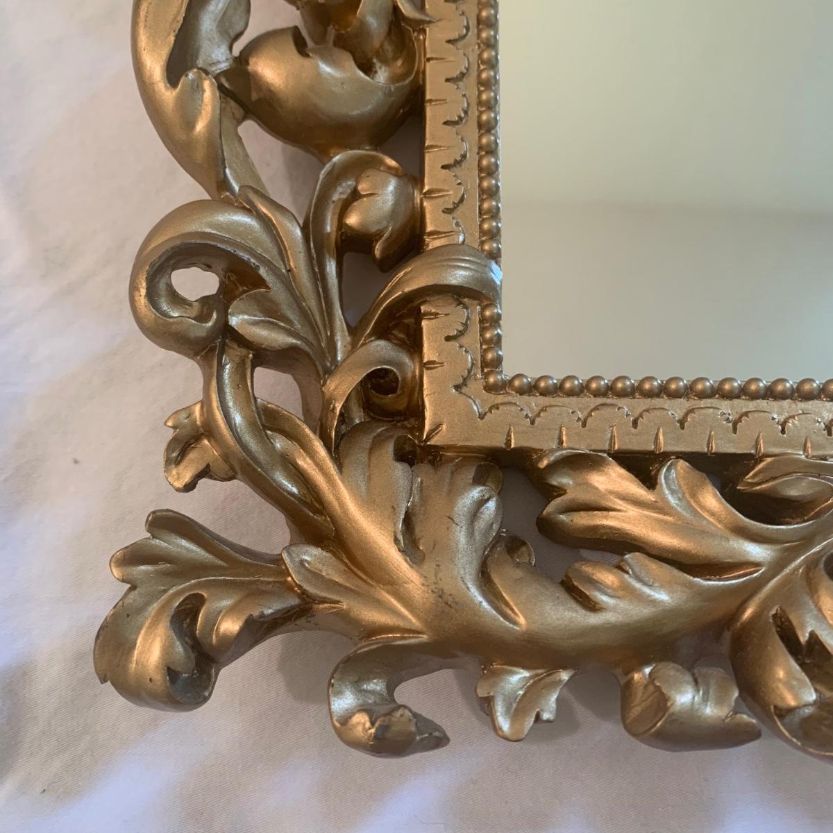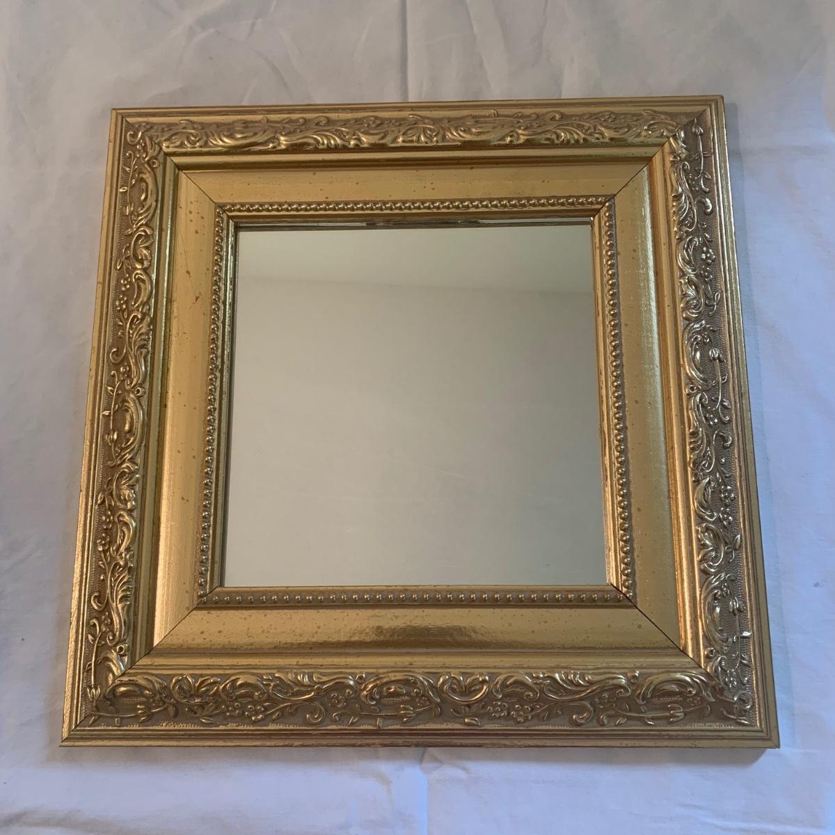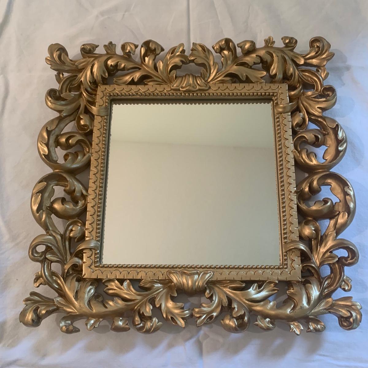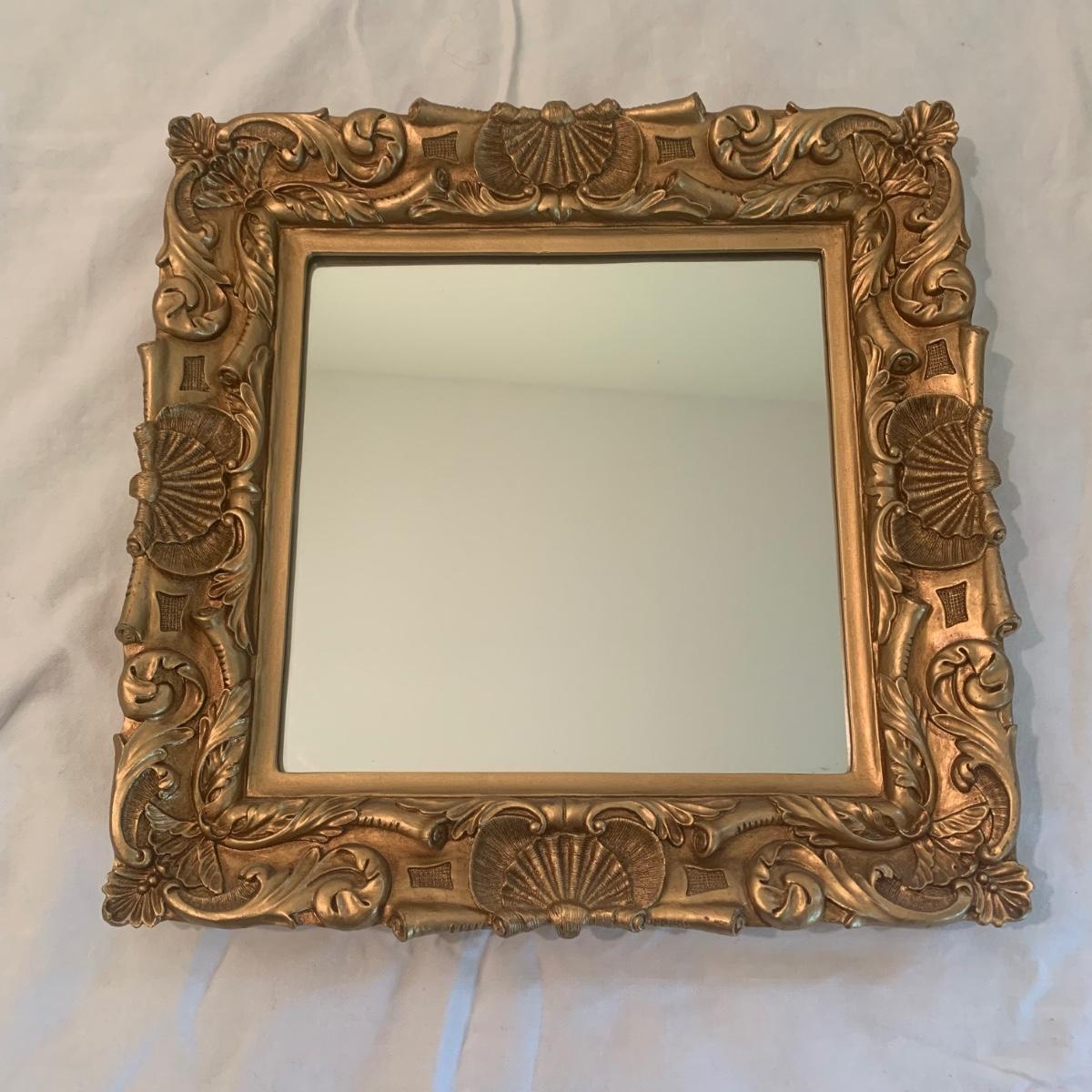 Lot includes three lovely gold painted mirrors with wooden frames in various designs. Please see photos for more details. Largest item measures, 12” x 12” x 1”H. Shipping available.
