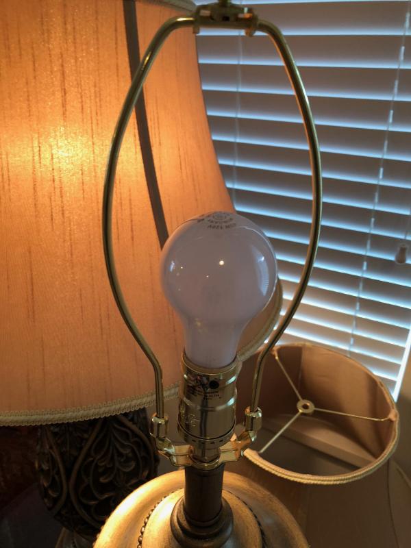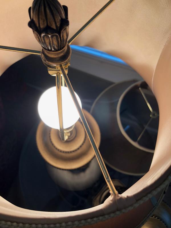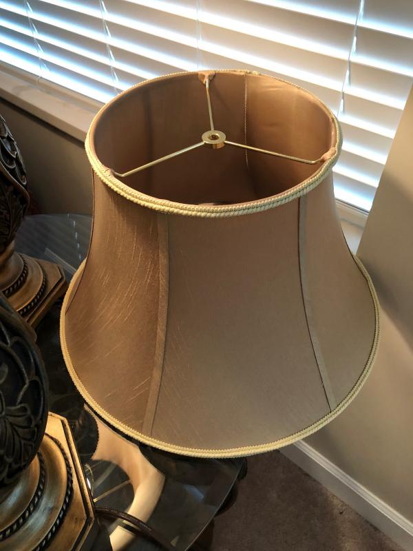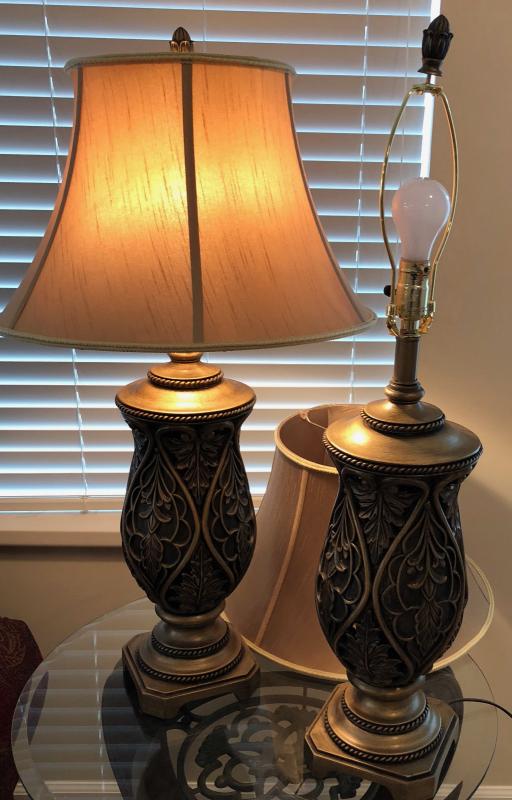 Matching pair of ornate bronze tone table lamps...34" high...fabric shades