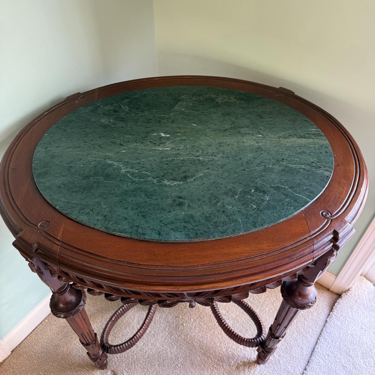 This lot contains an absolutely stunning ornately carved wooden table with a green marble top. This table features gorgeous detail to the legs and entire undercarriage including a trophy style accent at the center. This piece measures 34” x 27.5” x 34”H. There is a small chip in one of the leaf style details, see pictures for details. Local pick up only. Winning bidder must bring assistance to help move and load this item due to its weight and/or size.