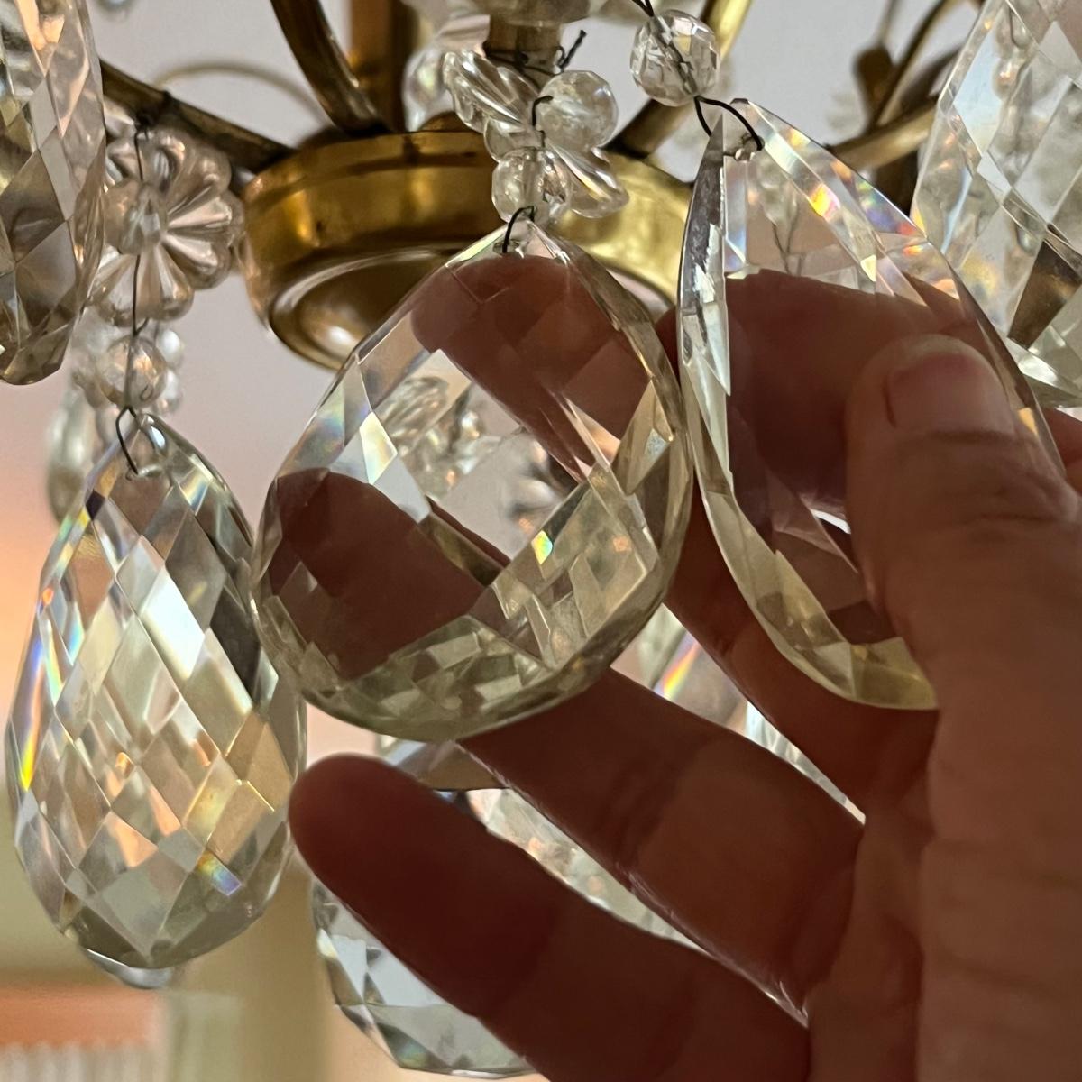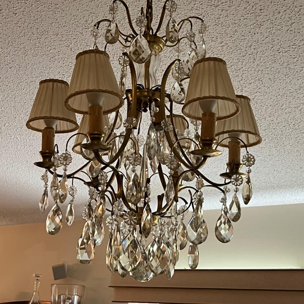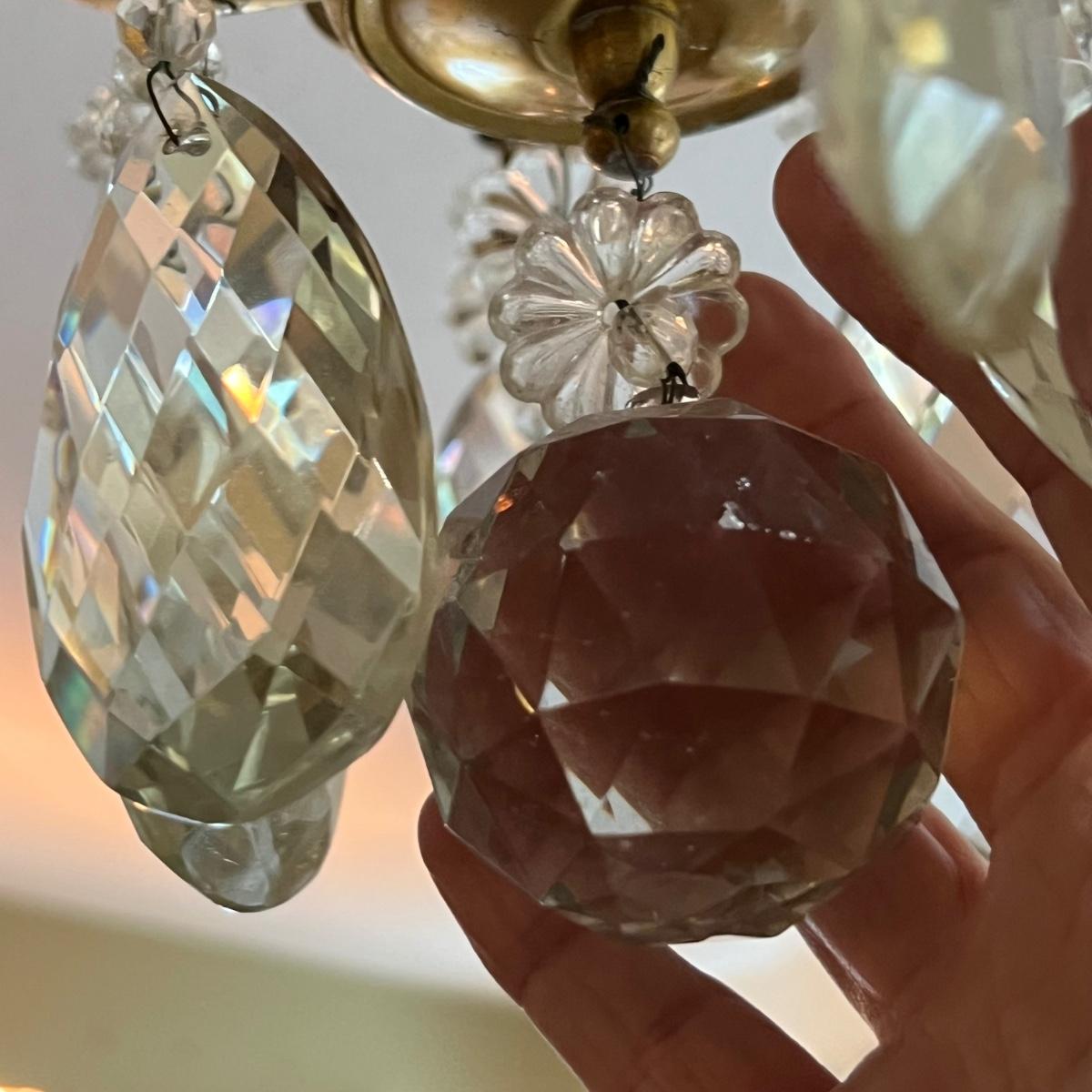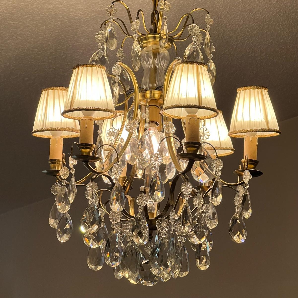 This decadent chandelier appears to be brass. The glass prisms have a Swarovski look to them; a large round prism hangs at the lowest point and the pieces get incrementally smaller going up to the top. Chandelier has six bulbs. A pair of wall sconces that appear to match this chandelier are available in another lot within this sale.