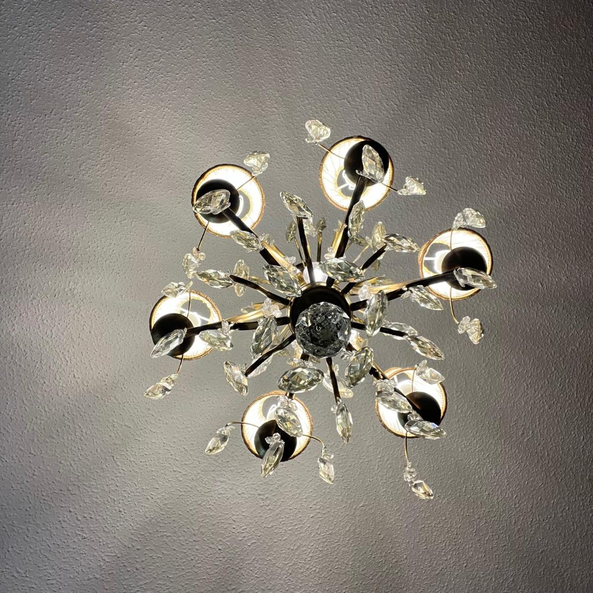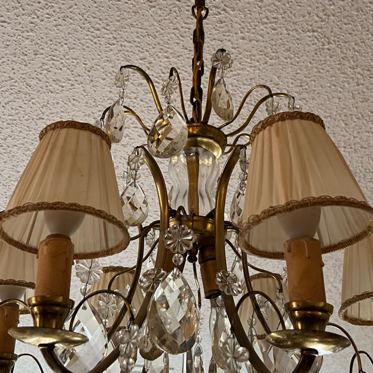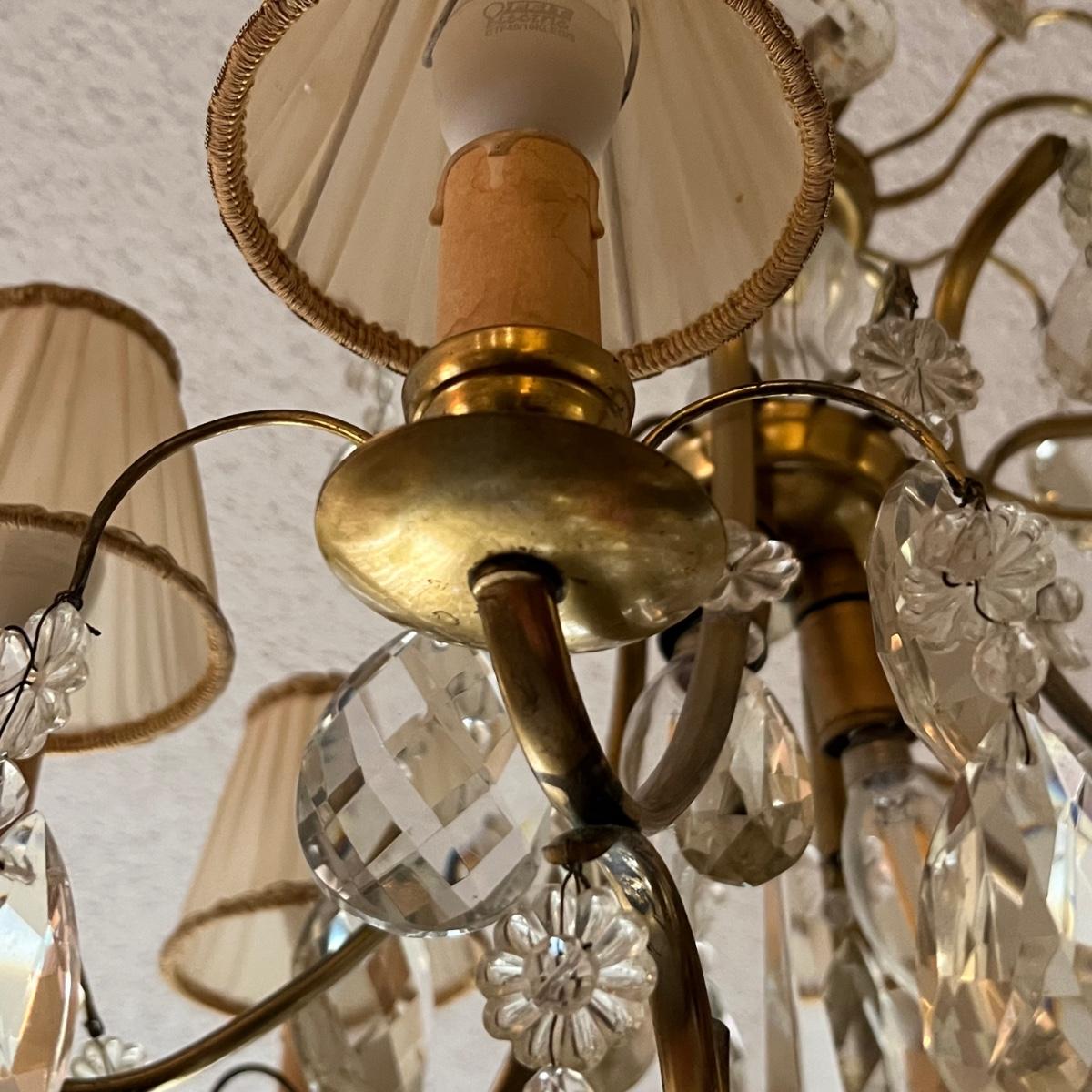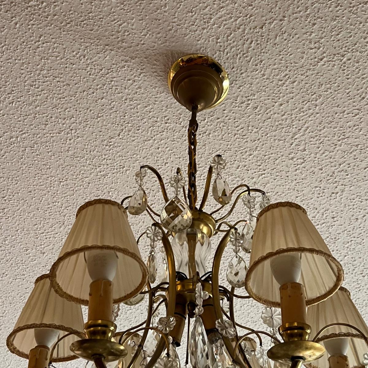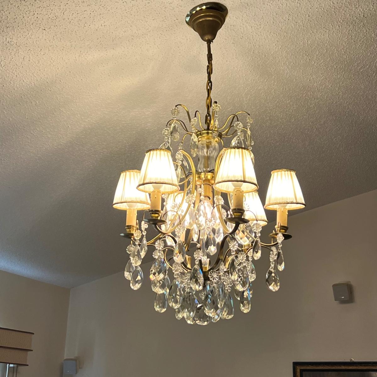 This decadent chandelier appears to be brass. The glass prisms have a Swarovski look to them; a large round prism hangs at the lowest point and the pieces get incrementally smaller going up to the top. Chandelier has six bulbs. A pair of wall sconces that appear to match this chandelier are available in another lot within this sale.