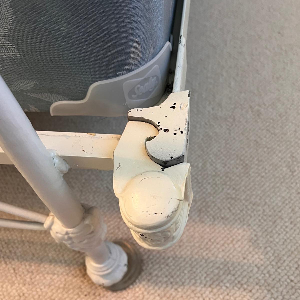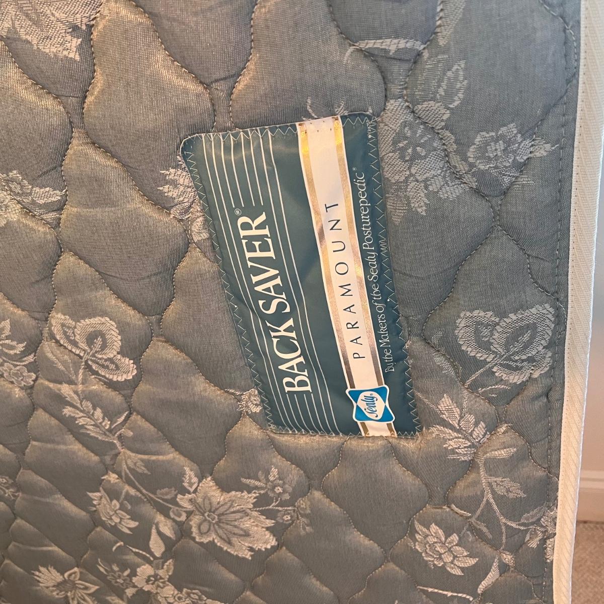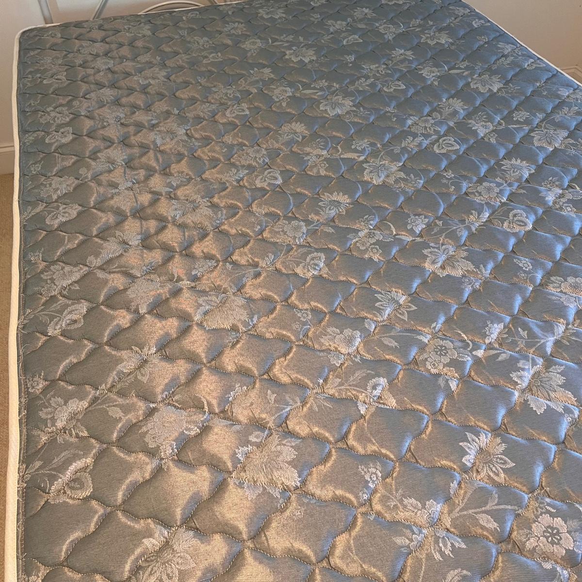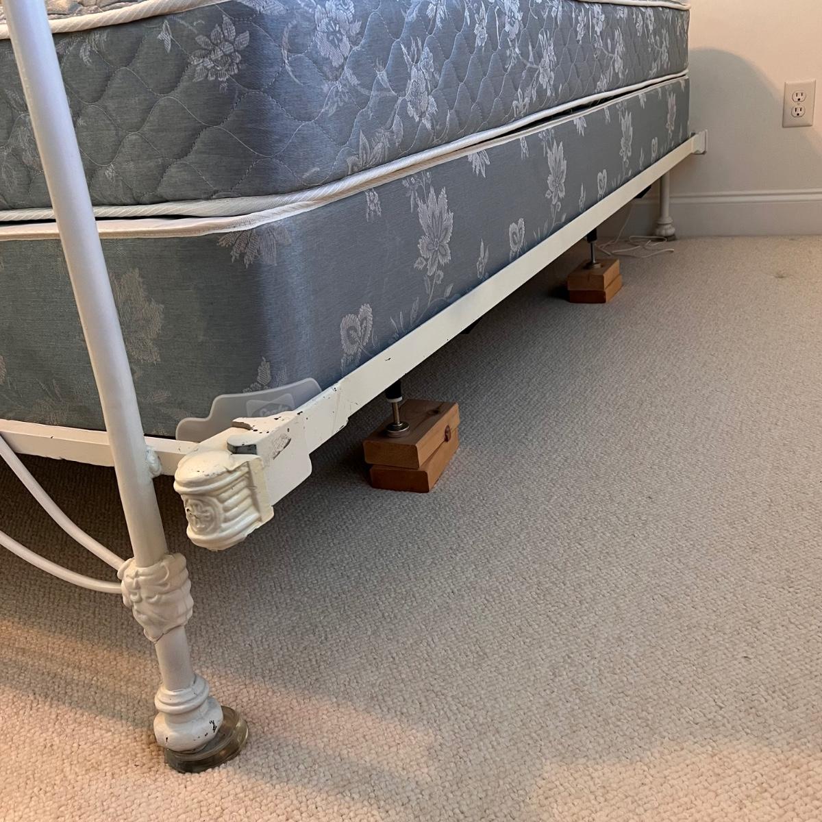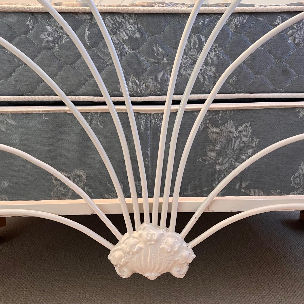 This white iron bed frame is a queen size. The headboard measures 53" x 52"H and the footboard 53" x 30"H. The mattress is available to the winning bidder if desired, but the winning bidder is not required to take it. It appears to be a Sealy Posturepedic mattress. Local pickup only. Winning bidder needs to dismantle bed and must bring assistance to help move and load this item due to its weight and/or size. Side rails lock into footboard and headboard. Winning bidder should bring a rubber mallet to assist removal. Item is on the second floor.