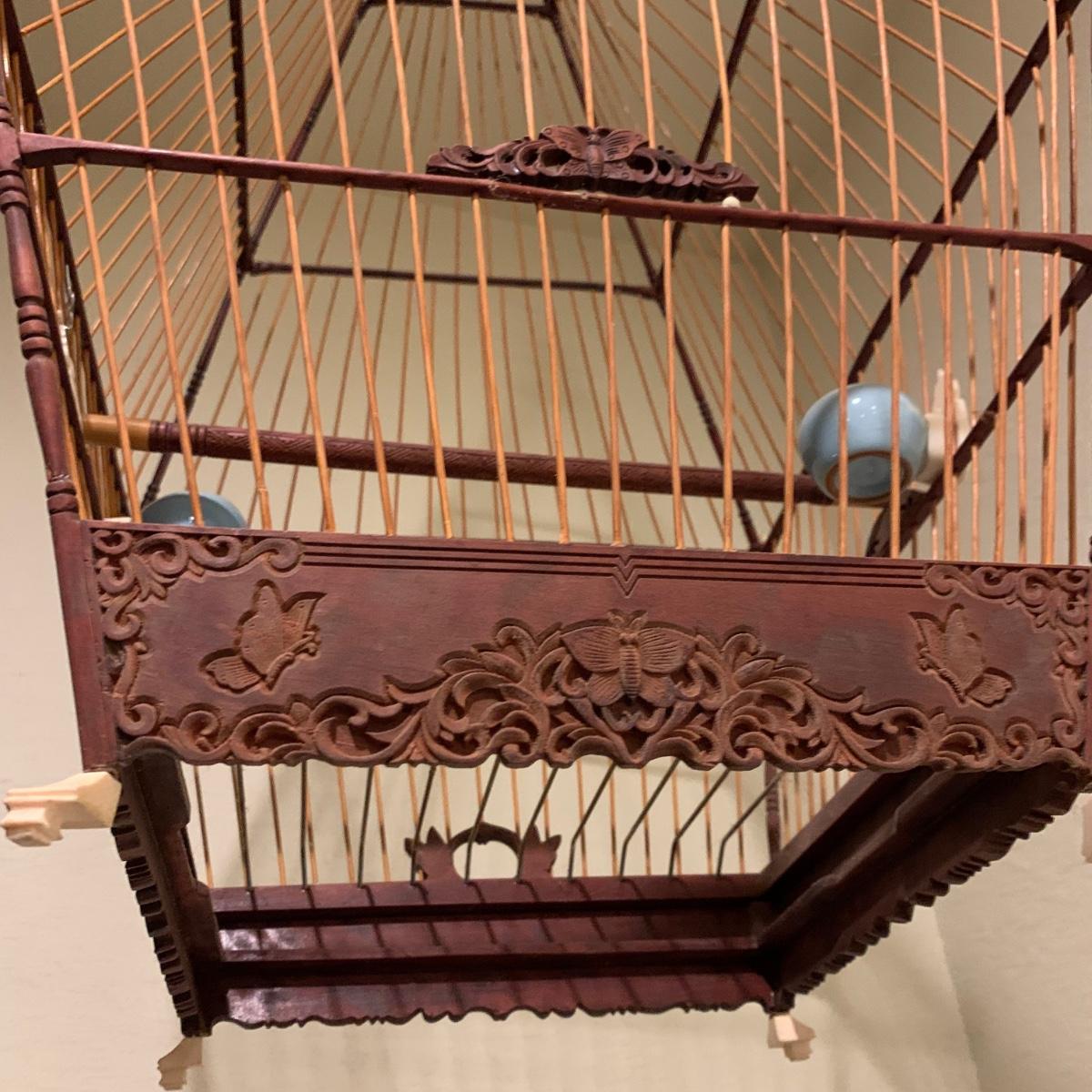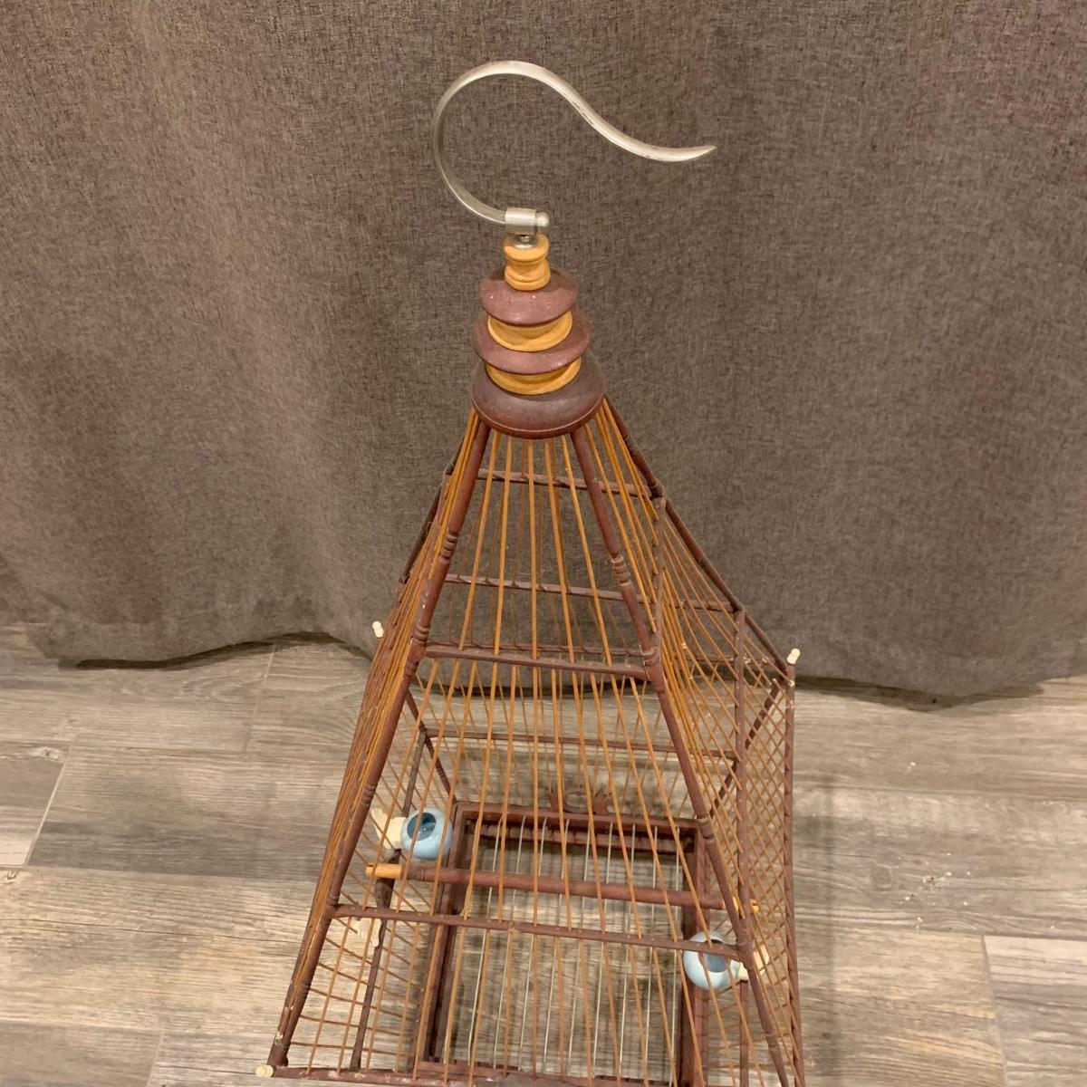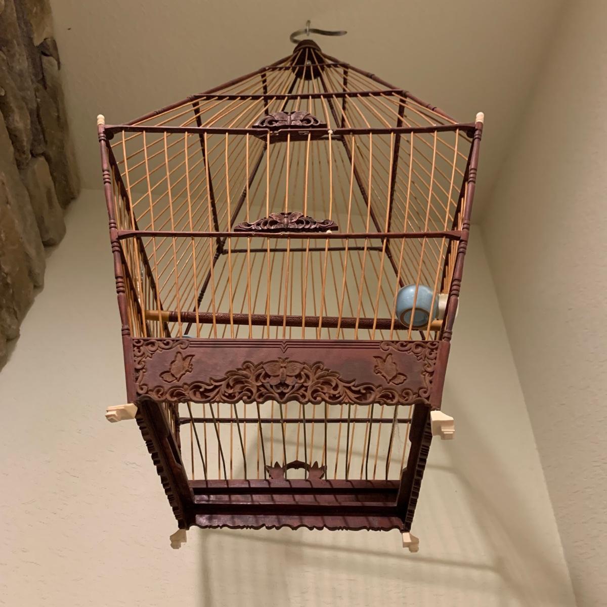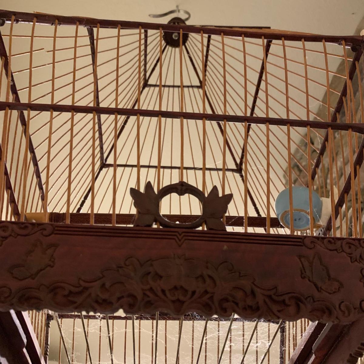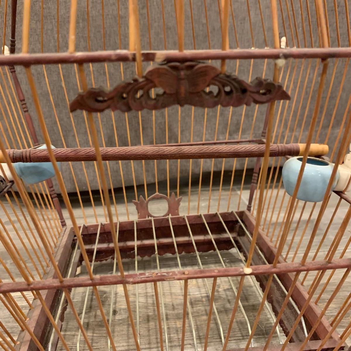 Very lovely ornate wooden birdcage. Cage has beautiful carved details. It has a perch inside and little ceramic water dishes. There is one small door to open for the bird. A metal hook is attached to the top. At its widest point the birdcage measures 15” sq. x 36” tall. The birdcage is very delicate. There are some small breaks apparent, many of which have been repaired by glue, but some parts are currently loose.