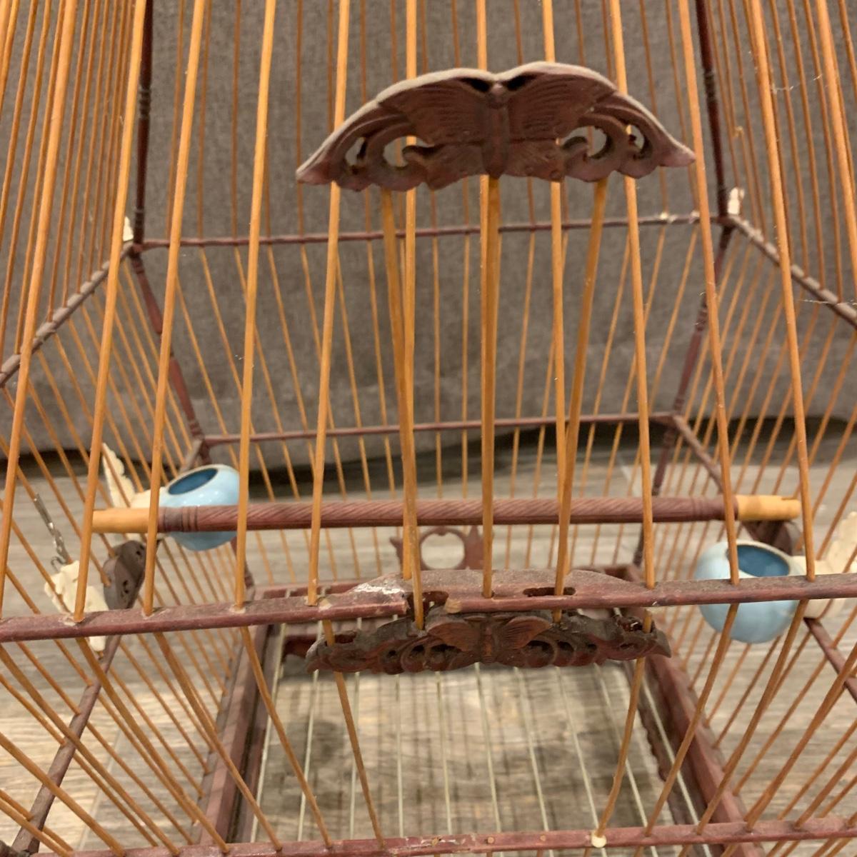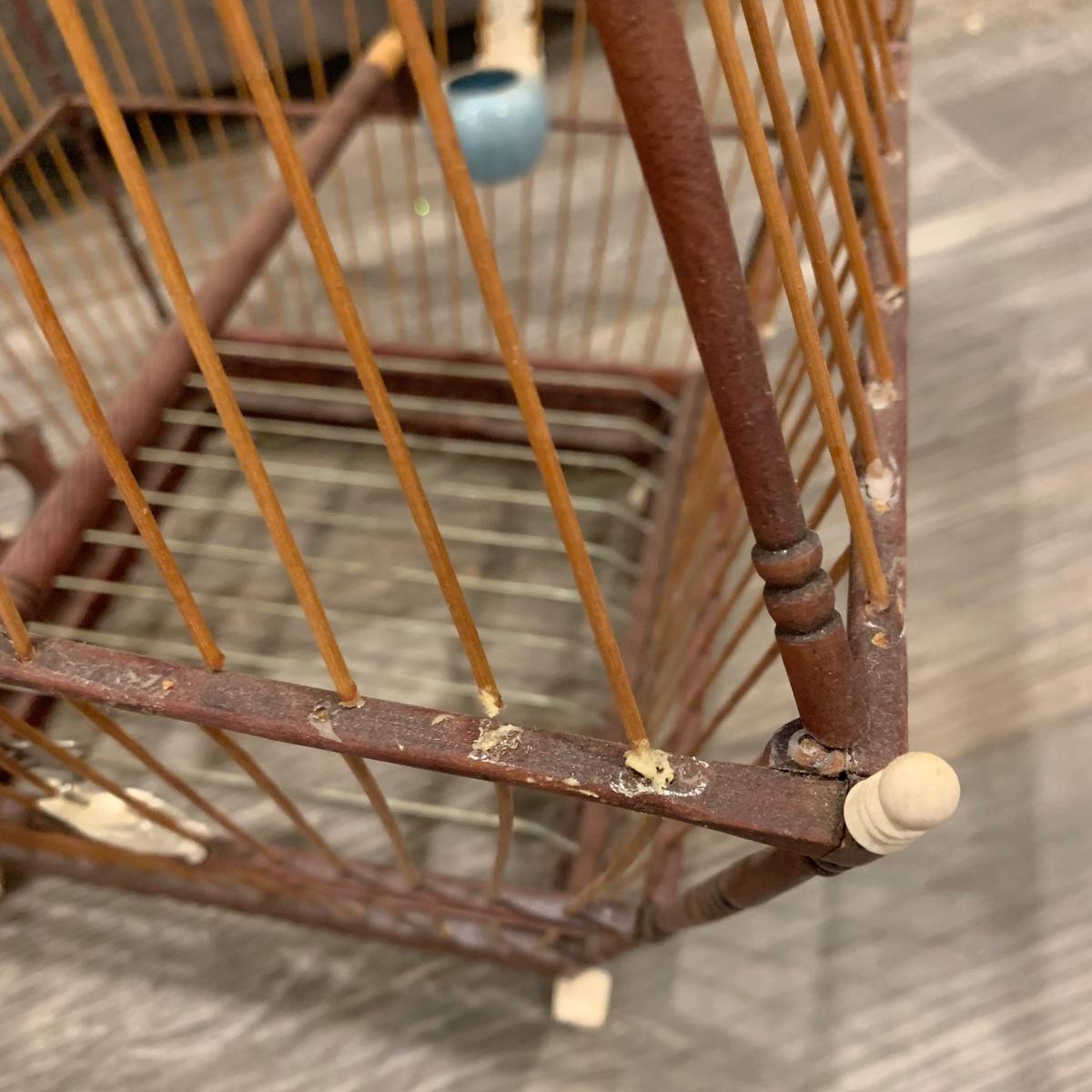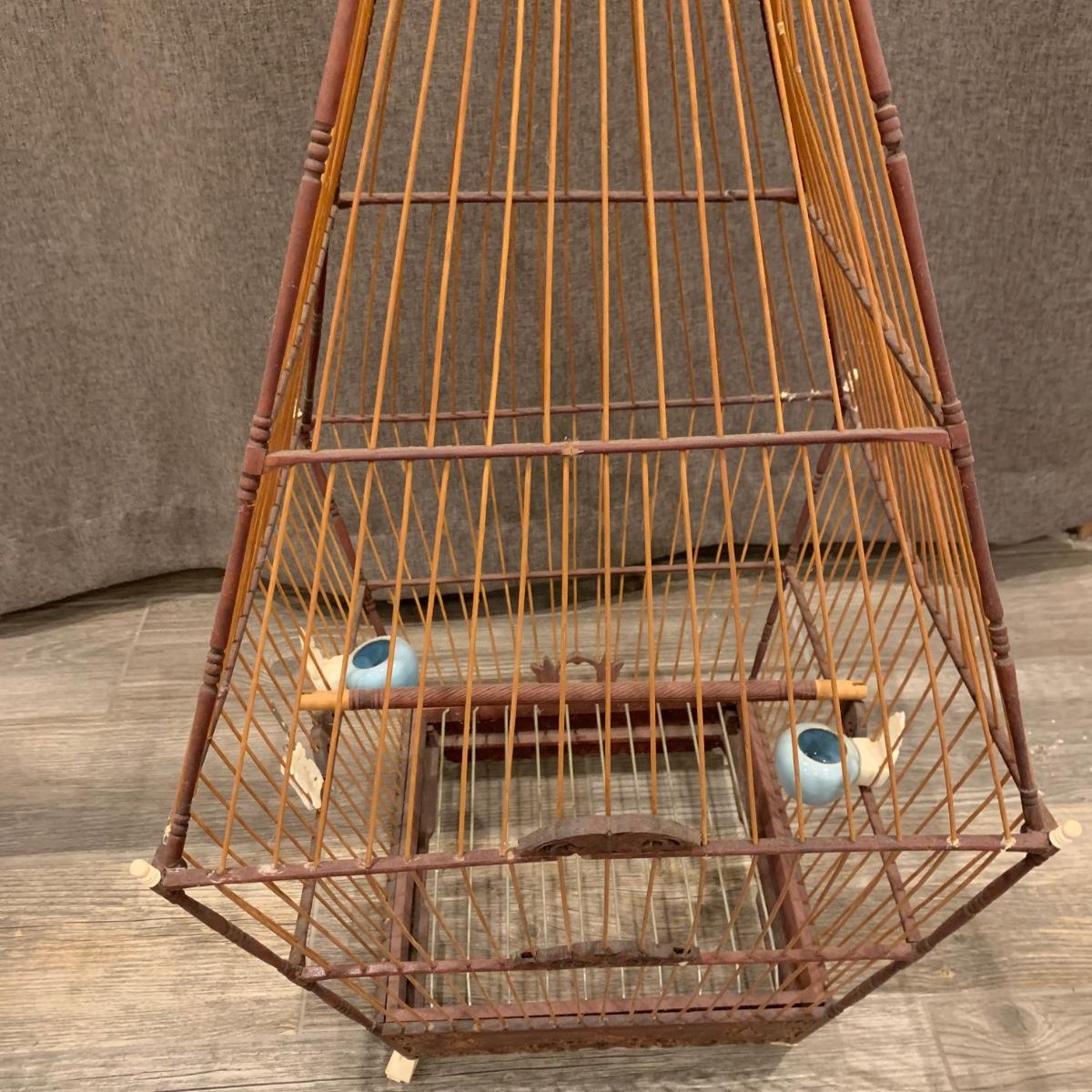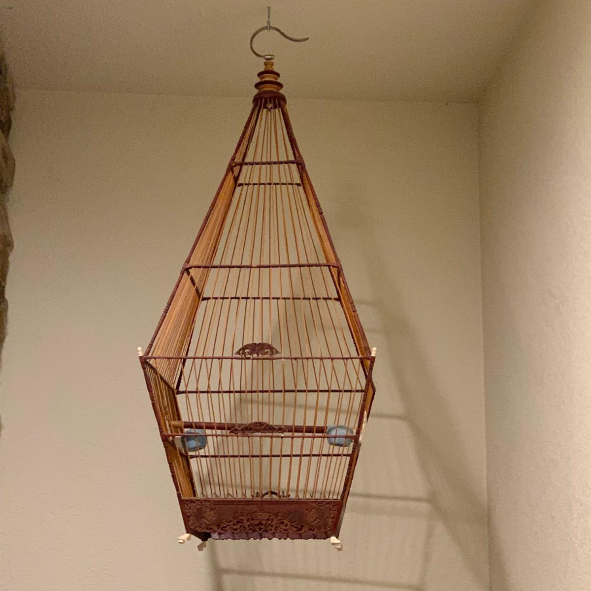 Very lovely ornate wooden birdcage. Cage has beautiful carved details. It has a perch inside and little ceramic water dishes. There is one small door to open for the bird. A metal hook is attached to the top. At its widest point the birdcage measures 15” sq. x 36” tall. The birdcage is very delicate. There are some small breaks apparent, many of which have been repaired by glue, but some parts are currently loose.